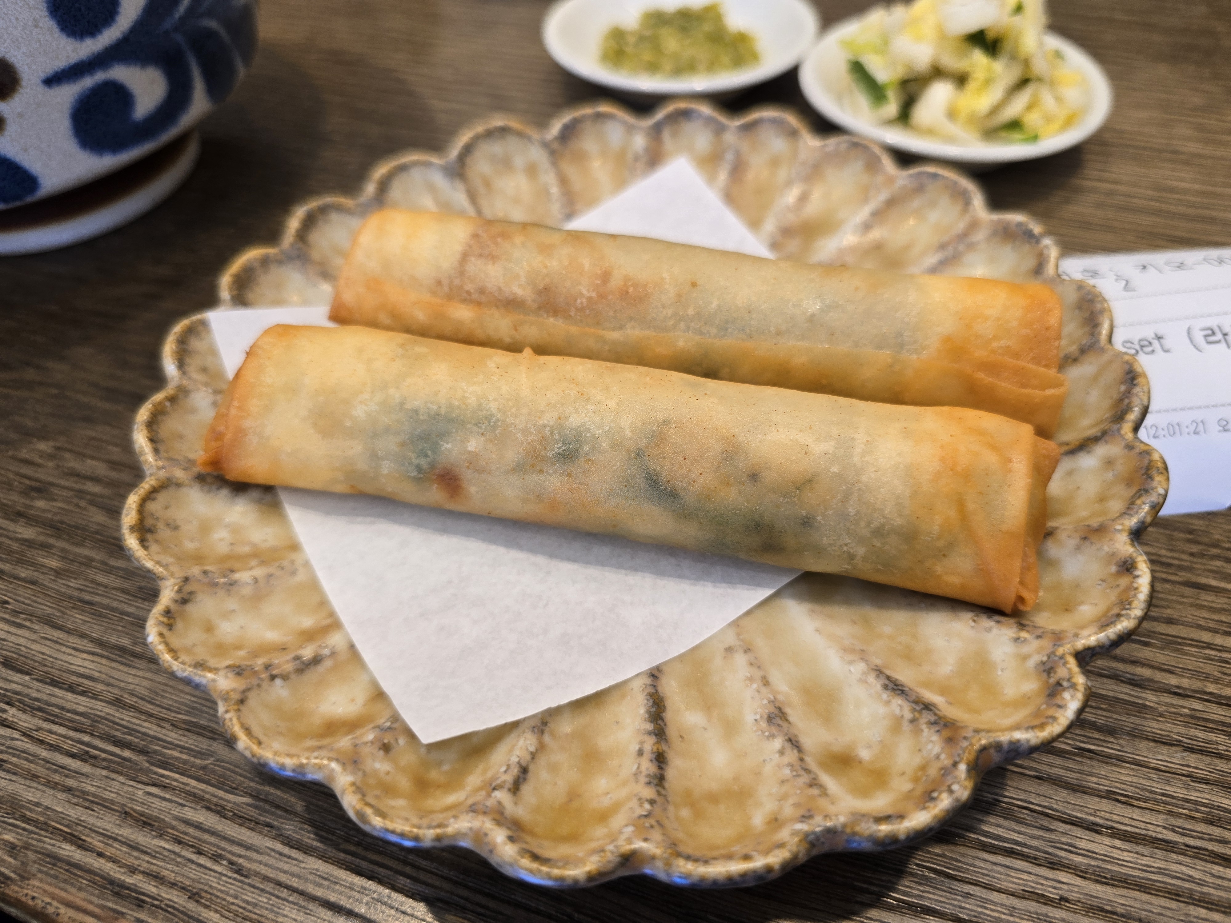 세트로 나온 교자 입니다. 중국식 춘권과 비슷한 모양입니다 . 얌전하게 말아서 바싹하게 정성스레 튀겨낸 모습니다