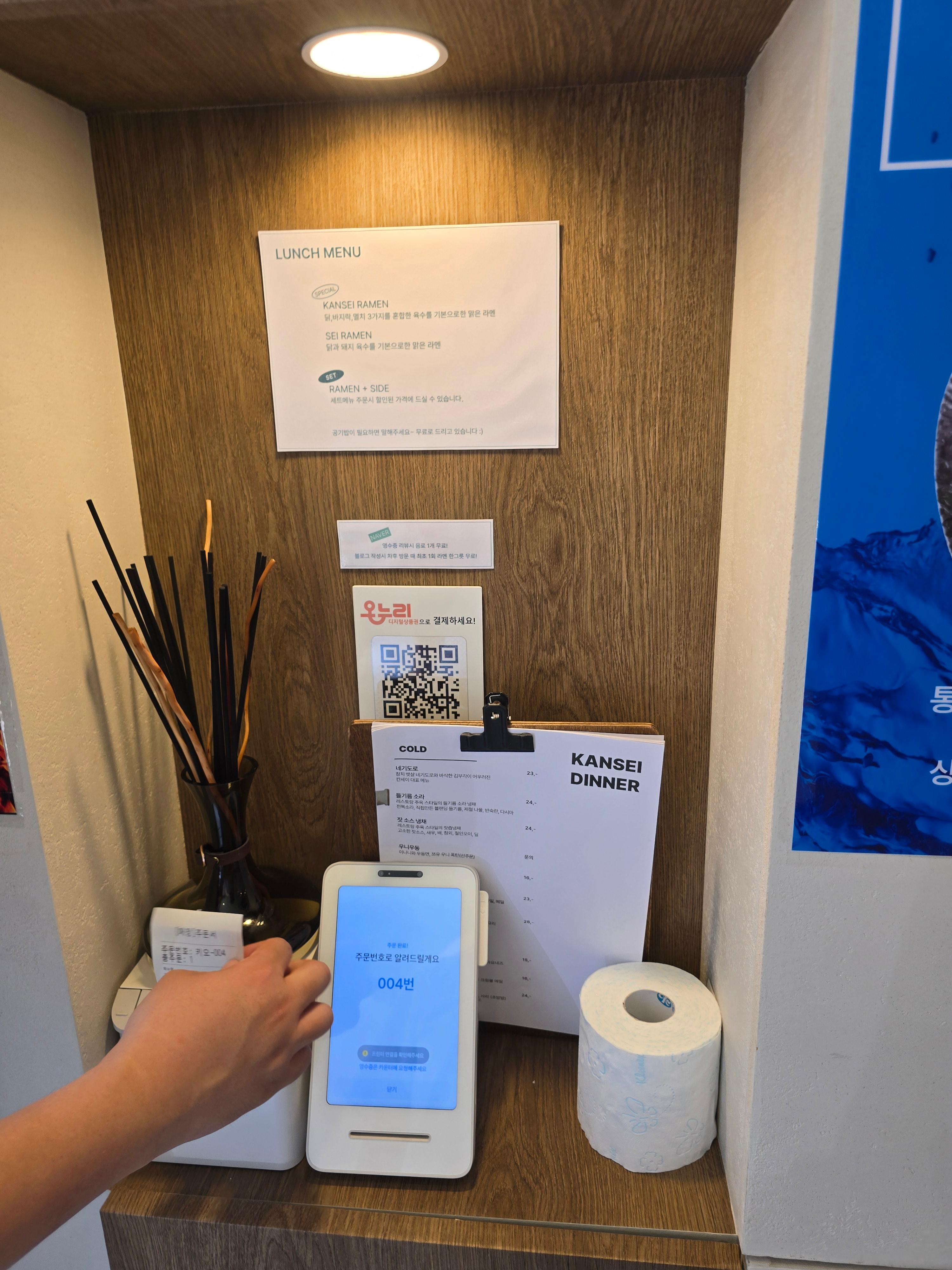 대표 메뉴는 닭육수베이스이 세이라멘과 바지락, 닭, 멸치를 이용한 육수의 칸세이 스페셜 라멘이 잇습니다.