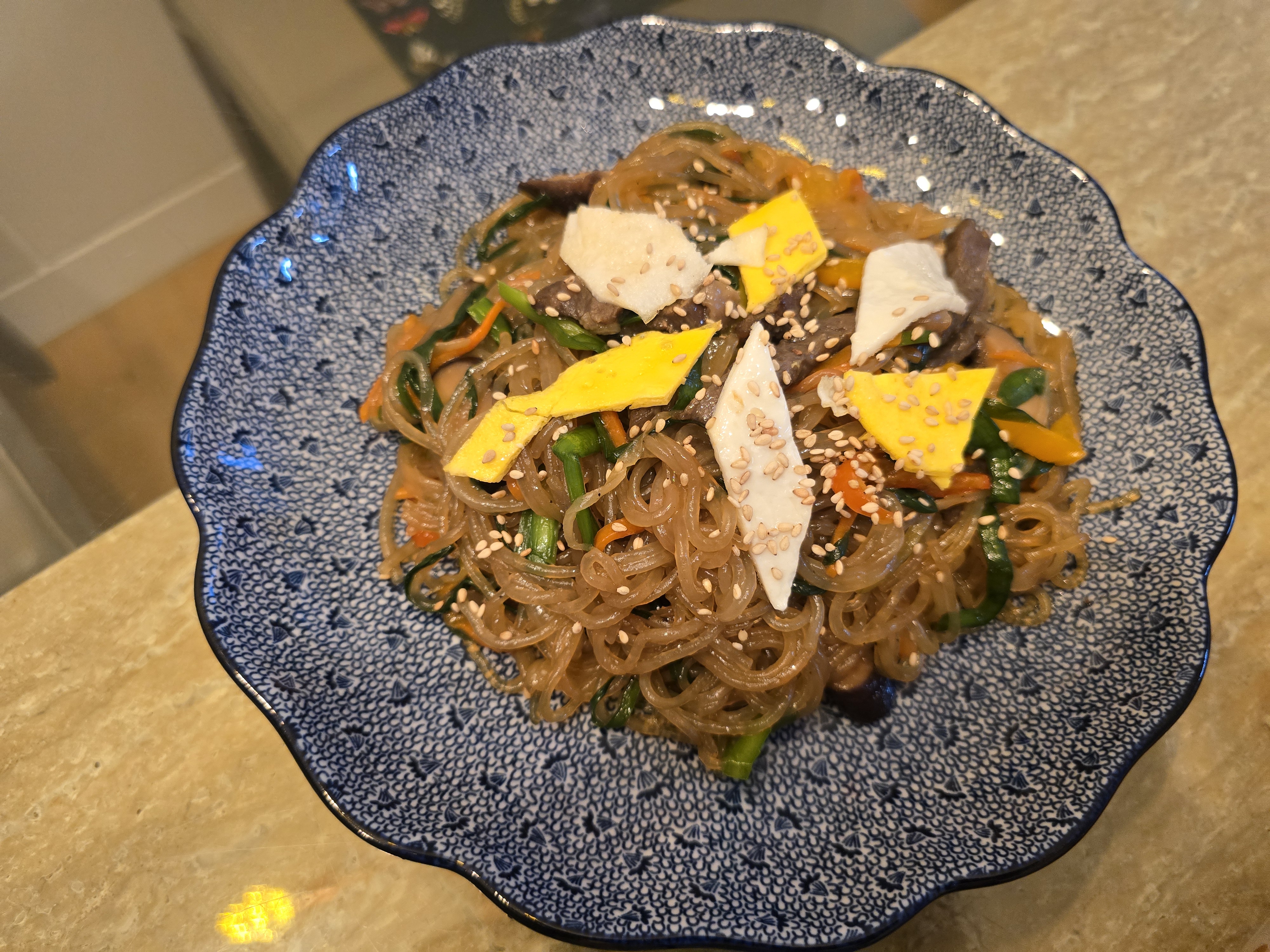 어느 날 갑자기 잡채를 만든다고 자른 당면을 사오래서 가져가니 맛있는 잡채를 만들어 주었습니다 . 잡채밥으로 먹었습니다