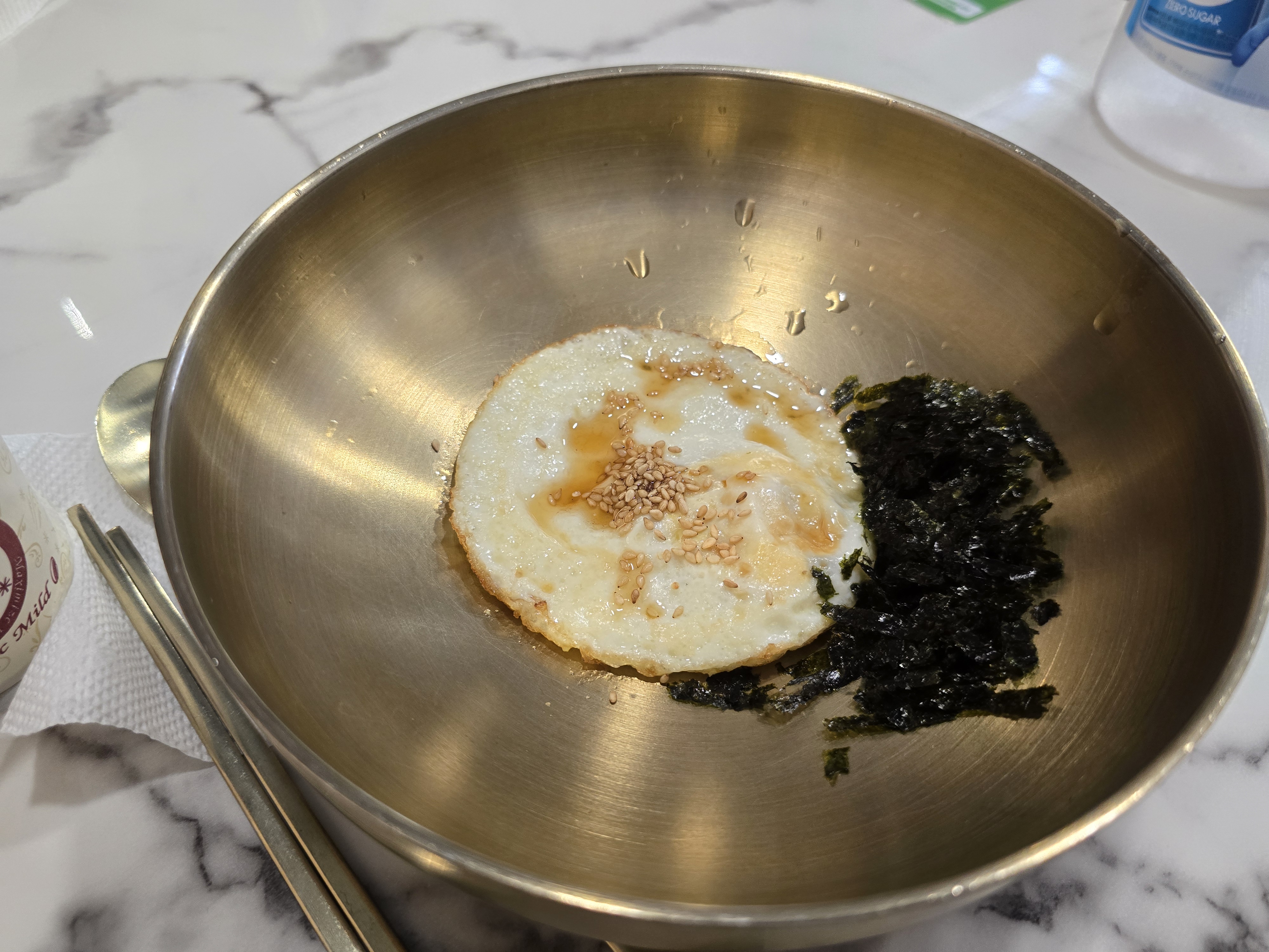 김가루와 계란후라이, 참기름을 넣은 대접을 가져다 줍니다.
