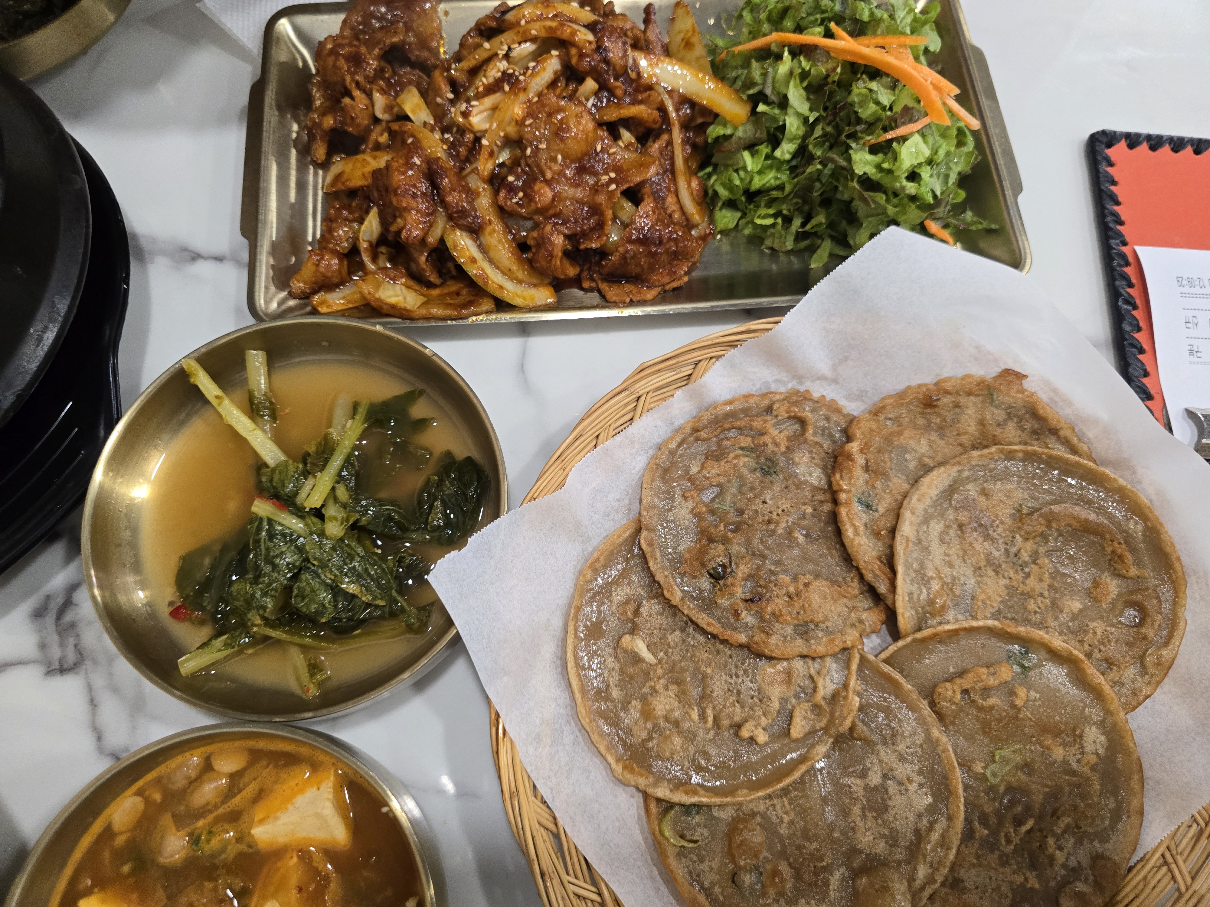 세트에 함께 나온 도토리전입니다. 쫀득하고 두툼하여 맛잇습니다. 제육을 하나 덜어서 도토리전에 말아서 쌈처럼 먹으니 별미입니다.