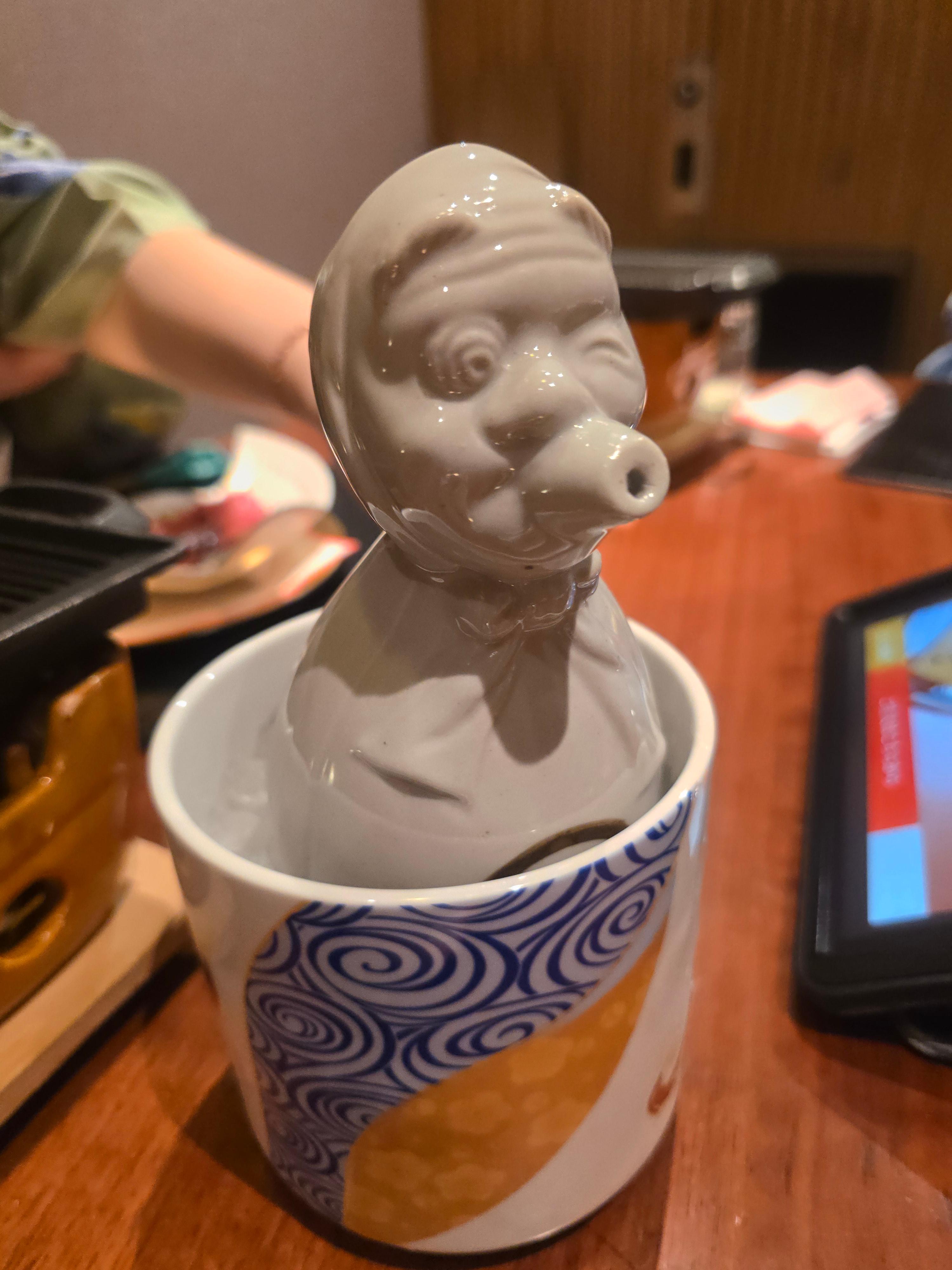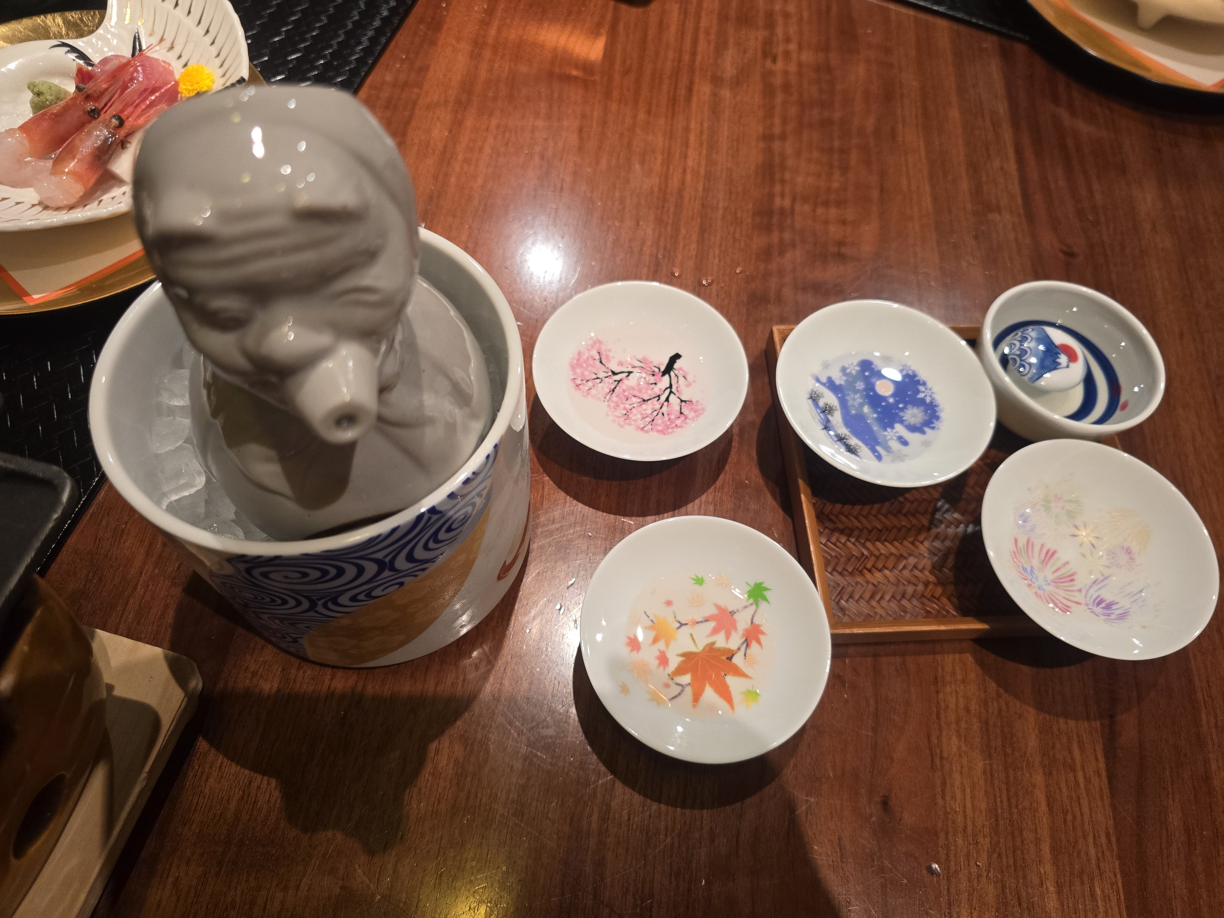 잉크하는 술고래 같은 인형모양의 술병으로 각각의 잔에 술을 따르니 잔마다 칼라가 변하며 아름다운 문양으로 나타납니다.