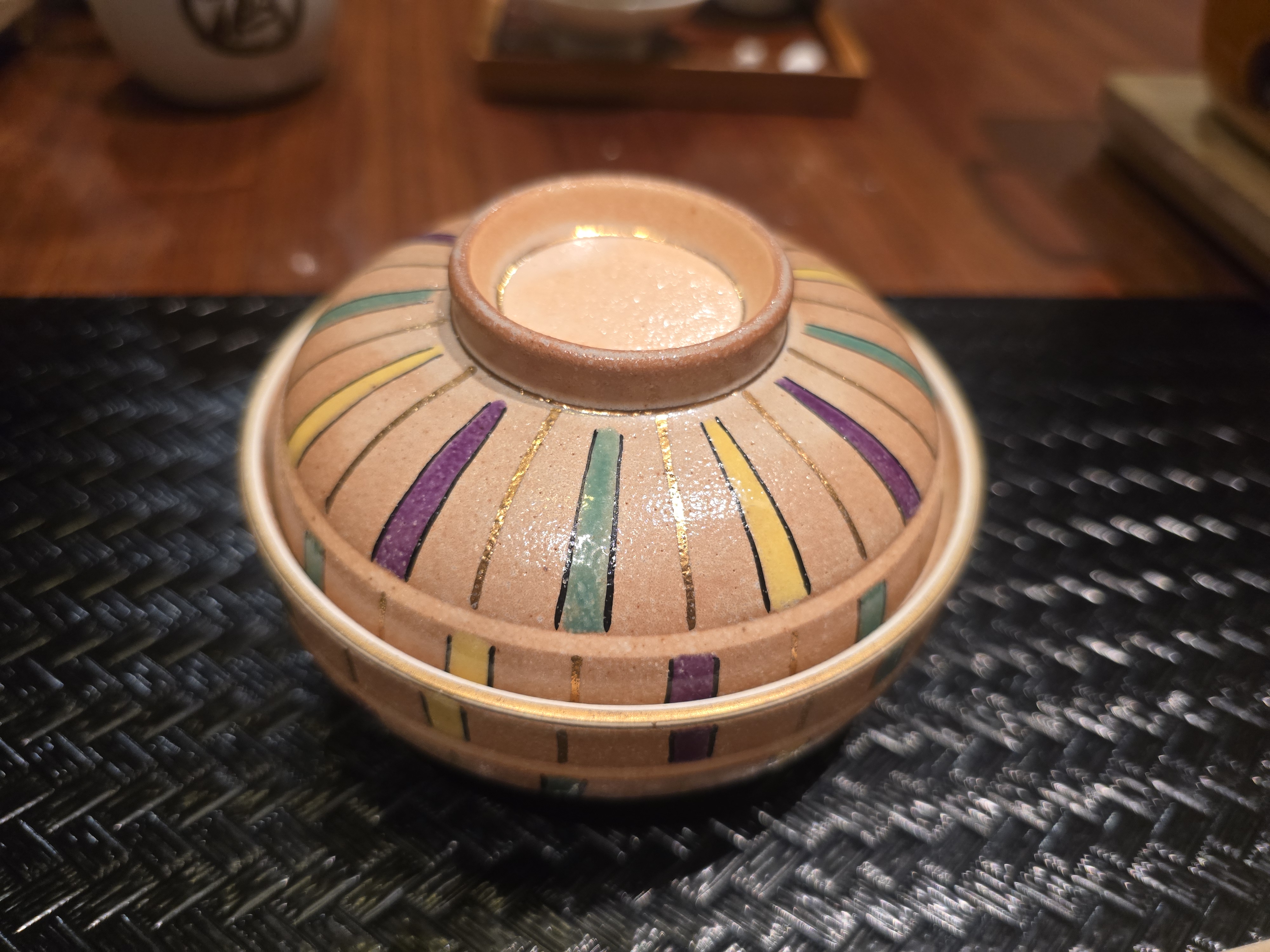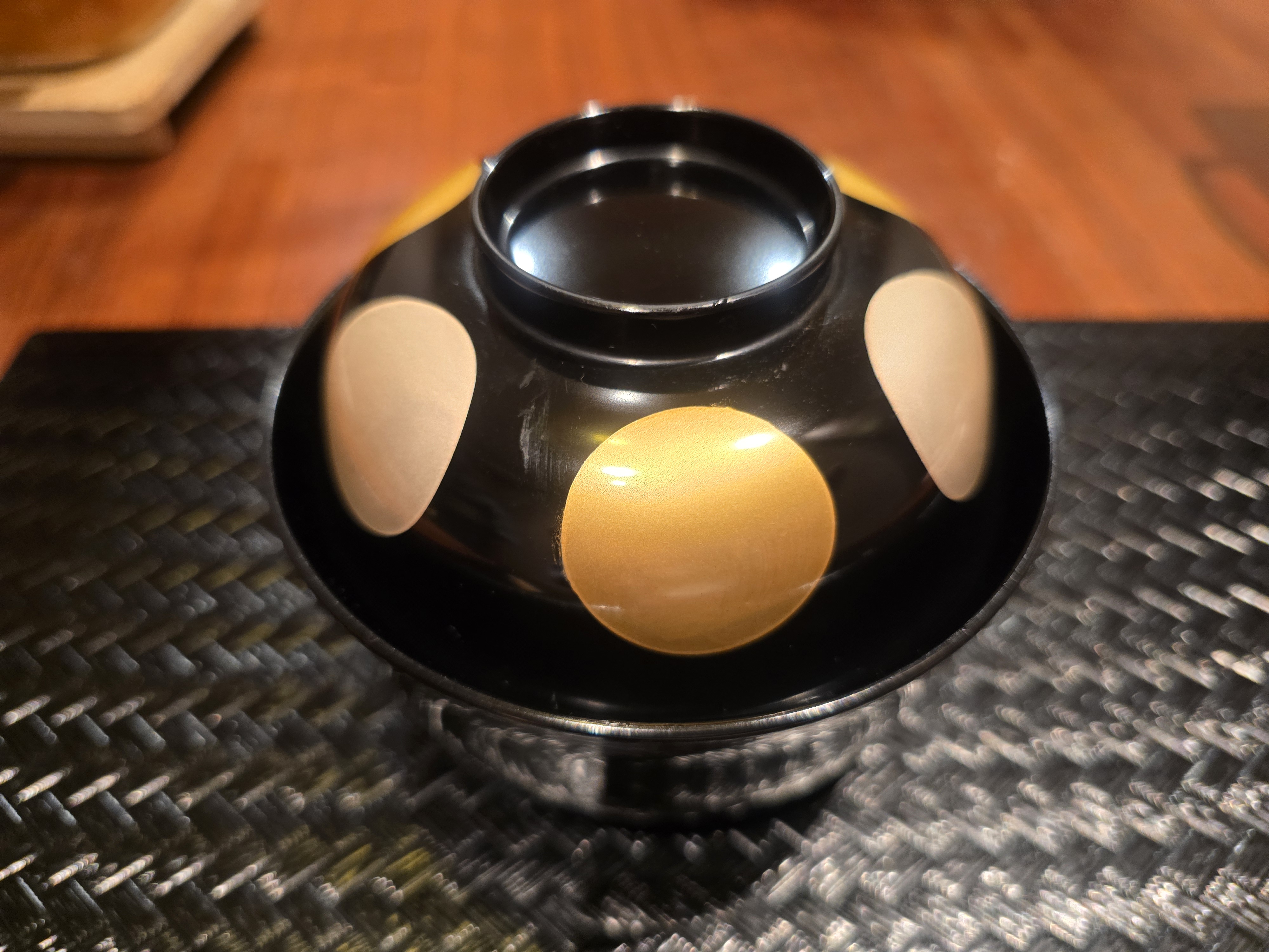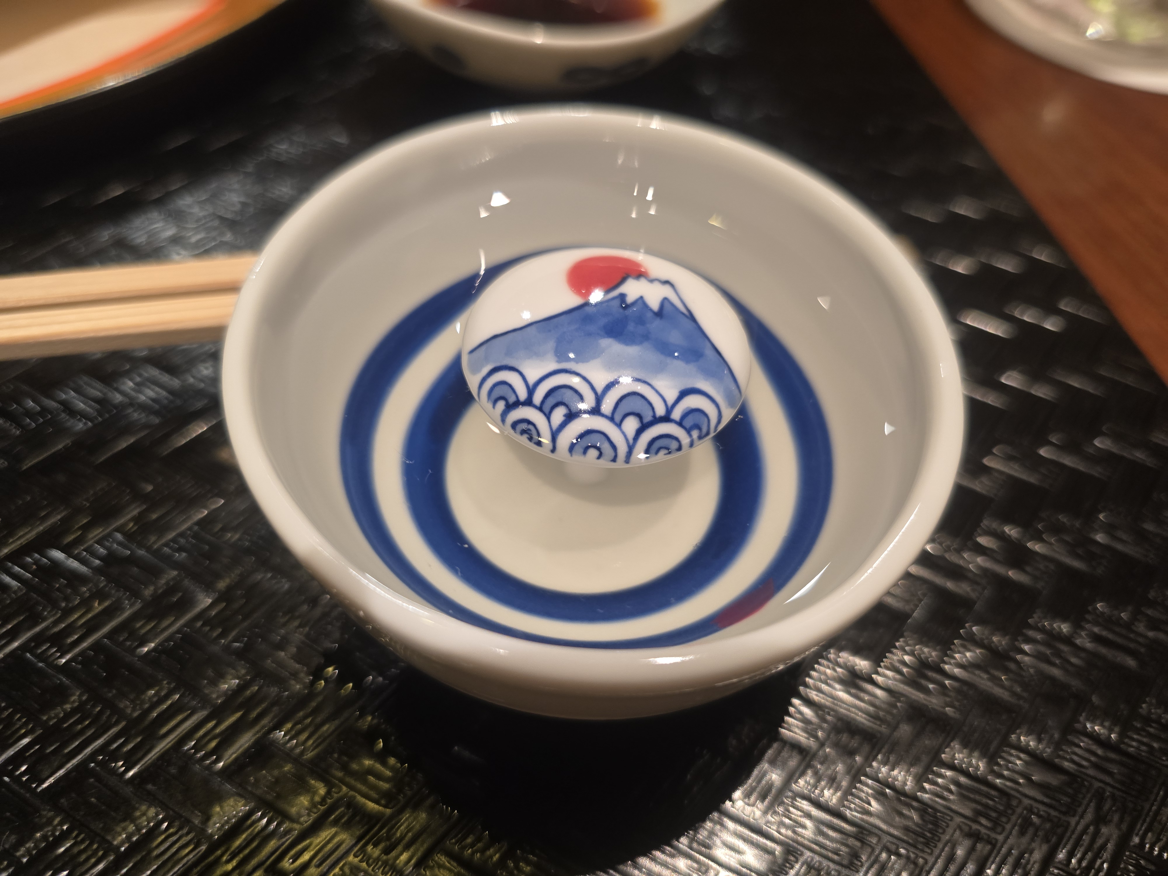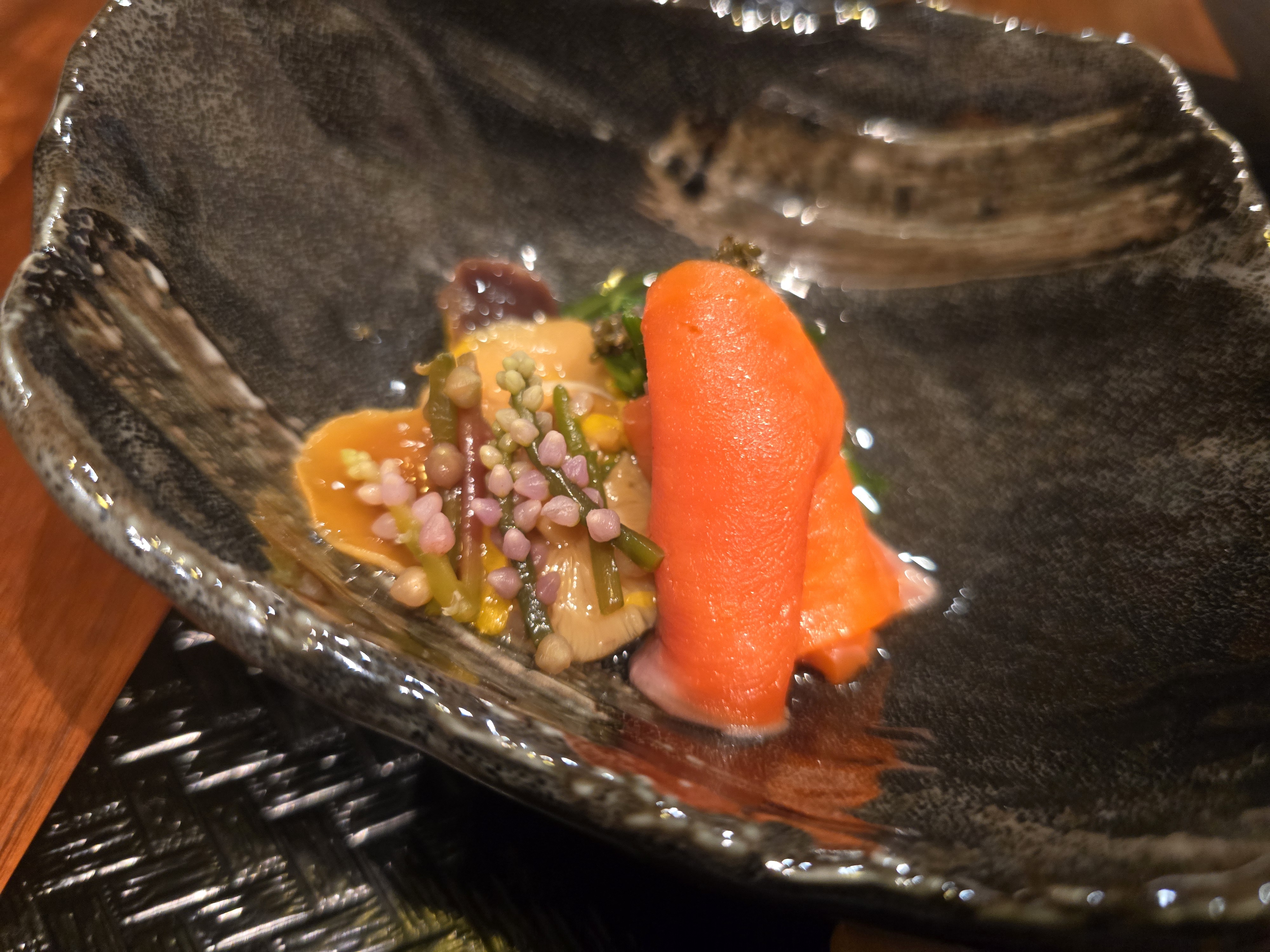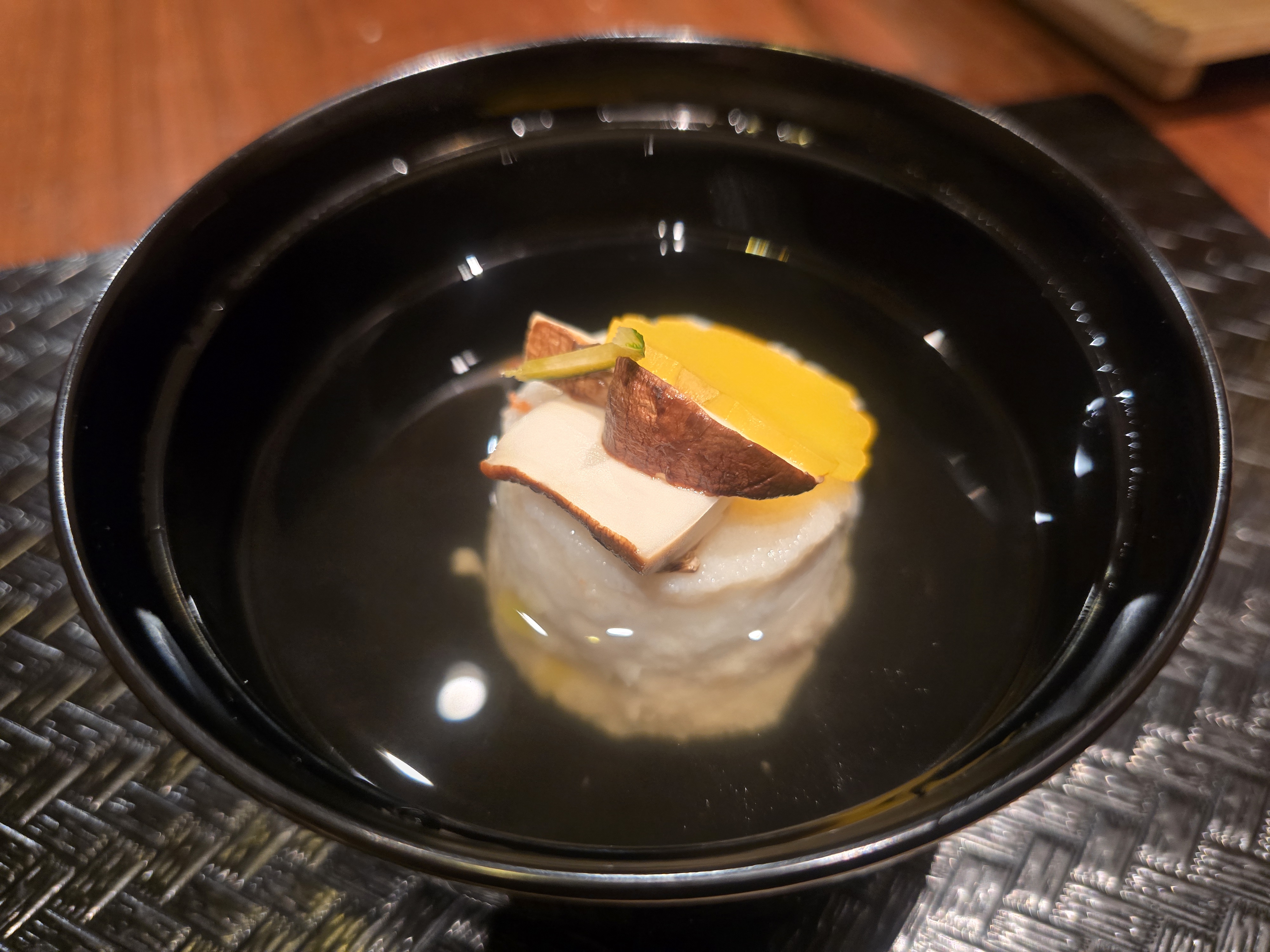 다음은 오완모노입니다. 맑은 국물로 만든 요리로서 칡전분으로 만든 새우 완자(은행과 다진 새우가 들어갑니다)와 송이버섯, 국화인삼, 유자가 들어 갔습니다.