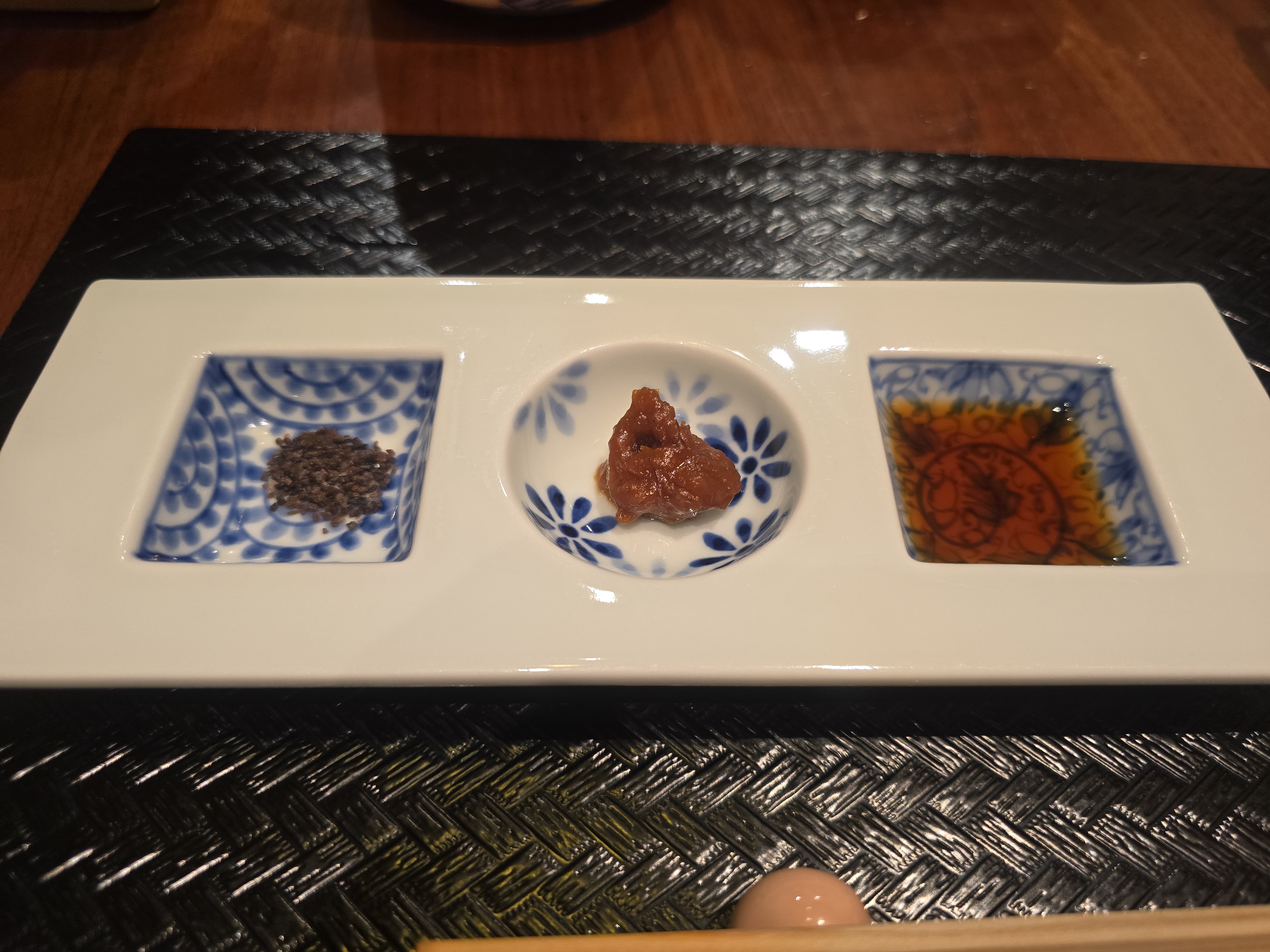 다음에 나온 요리는 오츠쿠리 입니다. 쿠로시오 마구로 가쿠츠쿠리(참치 깍둑썰기회), 미야비 다이(도미), 아마에비(단새우)로 구성된 회모듬으로 와사비, 카켄쇼유(간장), 오사시미 곤부(다시마)가 곁들여 나왓습니다