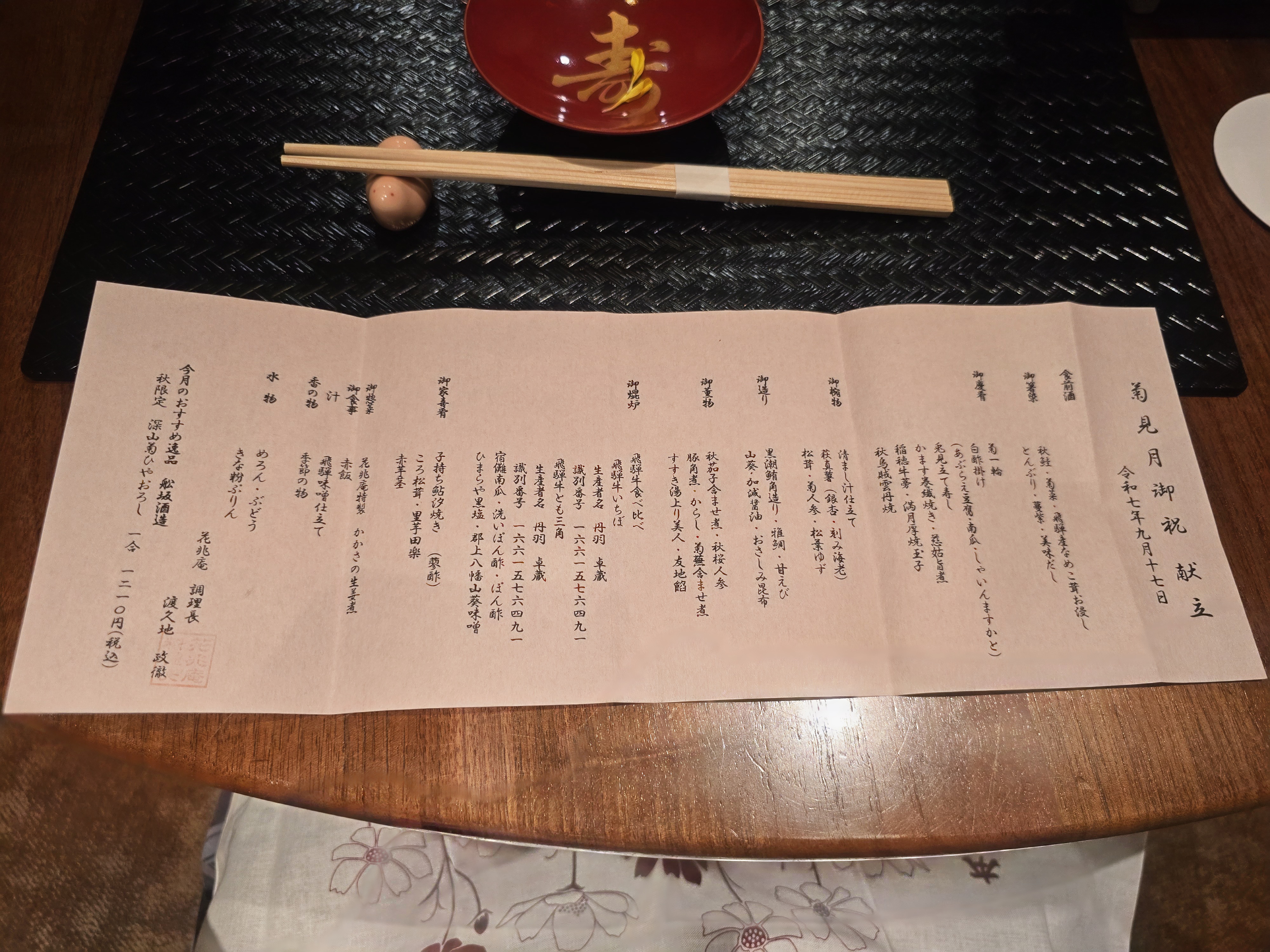 국화꽃한송이 장식에 토끼모양의 오니미에테 스시, 하얀식초소스로 만든 요리로... 카마스마키센 야키, 쿠와이 니코미, 이나호 우엉, 만월 아츠야키 타마고, 가을 오징어 우니야키등 다양한 재료로 만들어 색깔도 맛, 모양도 아름다운 눈호강을 합니다.