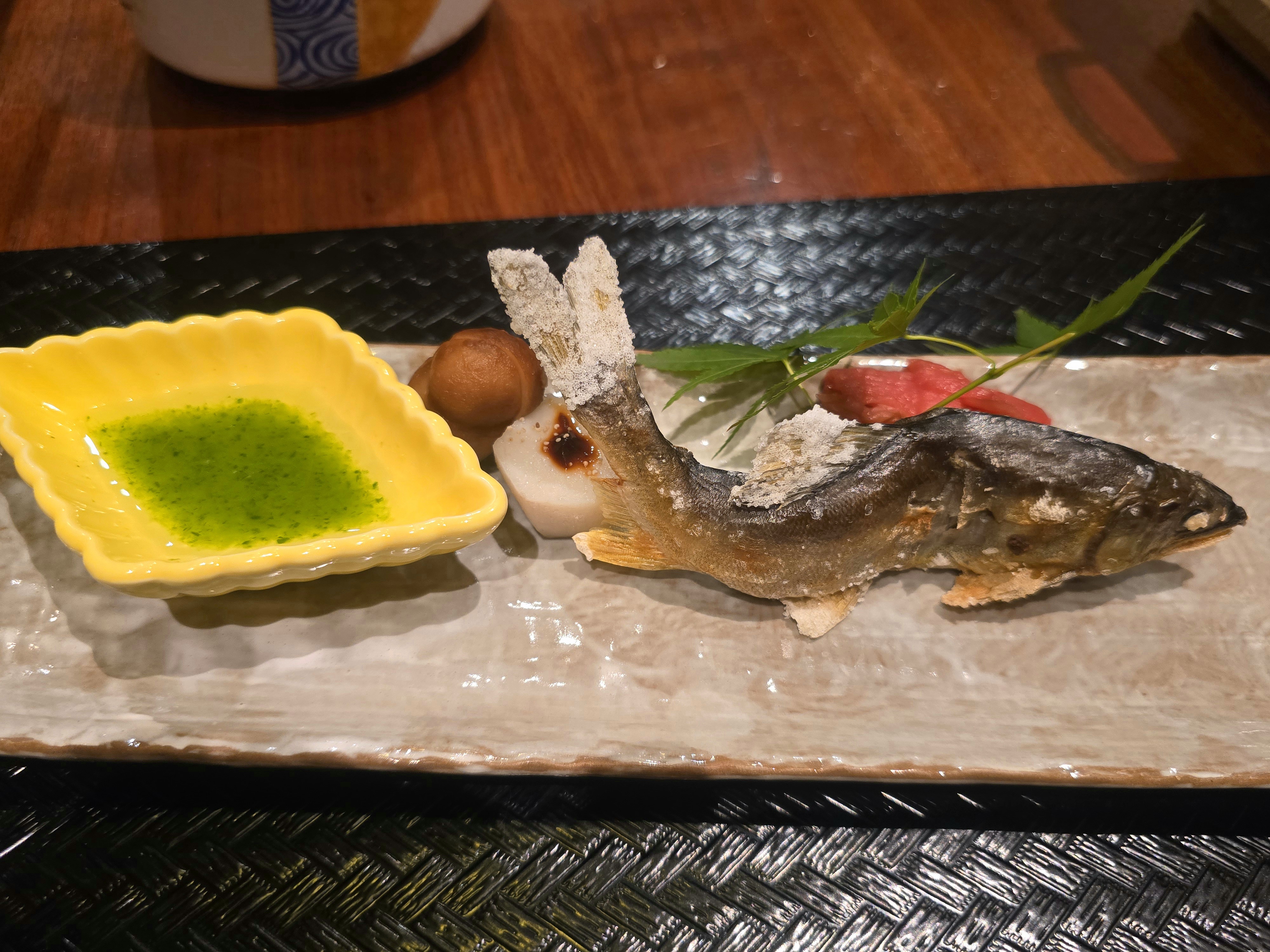 곁들임 요리로 알배기 은어 소금구이 , 명아주 식초 가 나왓습니다. 개인적으로 일본의 여름은 은어가 최고입니다. 특히 소금구이는