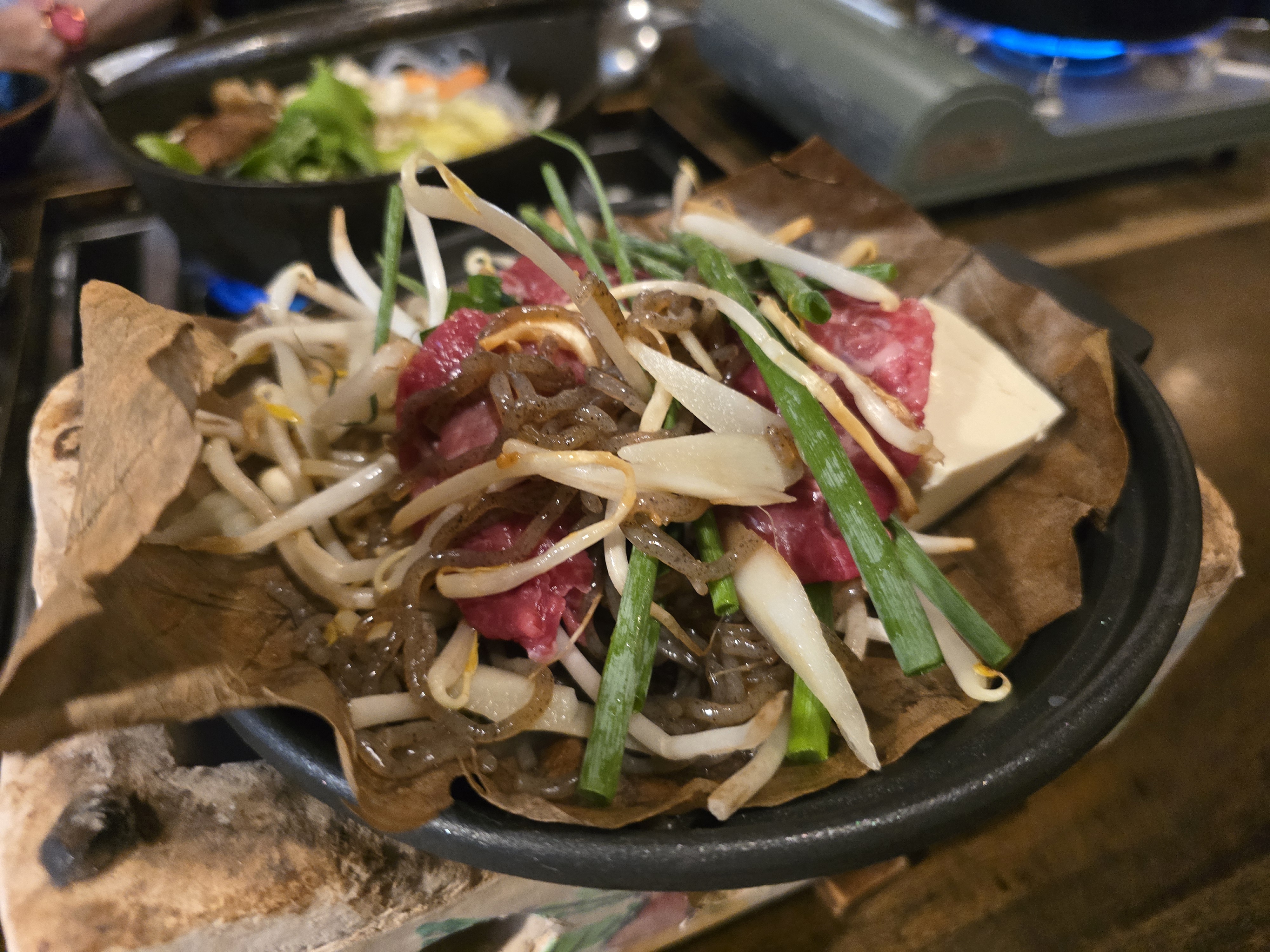 호오바야키입니다. 말린 박잎위에 소고기와 야채 두부가 올려져 잇습니다 .