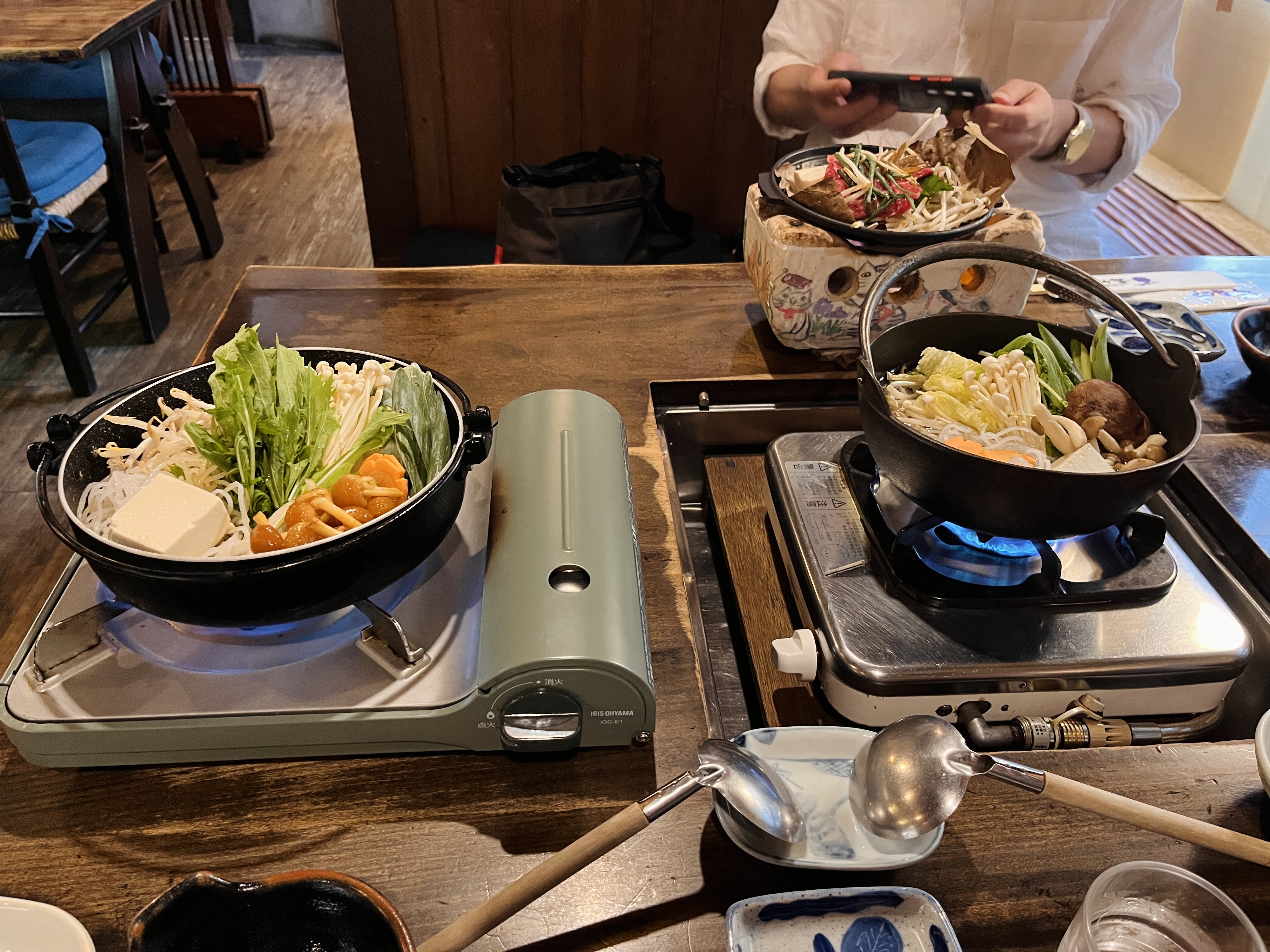 스키야키, 샤브샤브, 호오바야끼를 주문하였습니다. 고체연료가 들어 있는 화로는 호오바야키전용입니다.