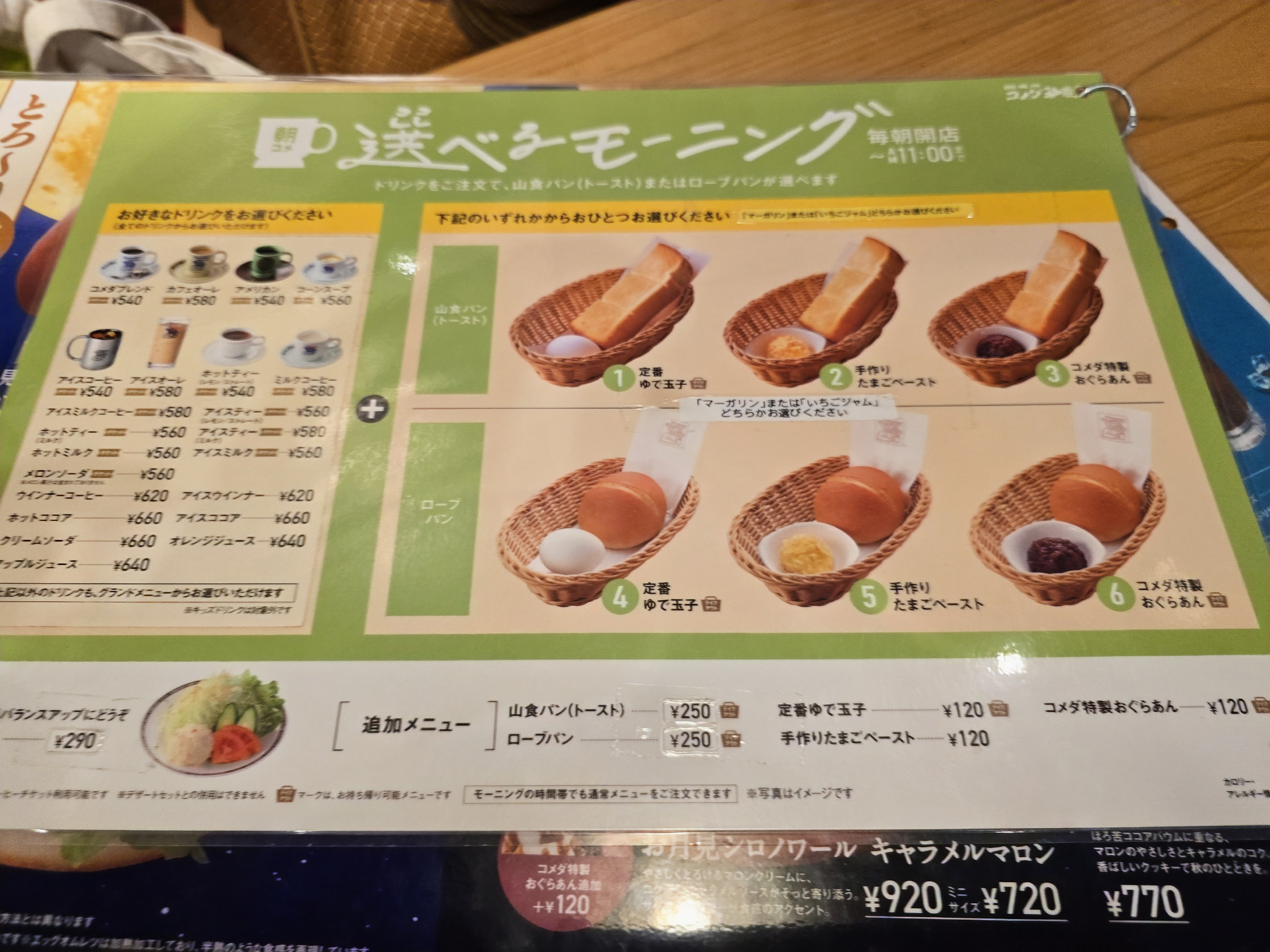 오전 11시까지는 모닝서비스 시간으로 커피와 함께 추가요금없이 다양한 식빵세트를 선택할 수 있습니다. 삶은 계란, 스크램블에그, 단팥등.