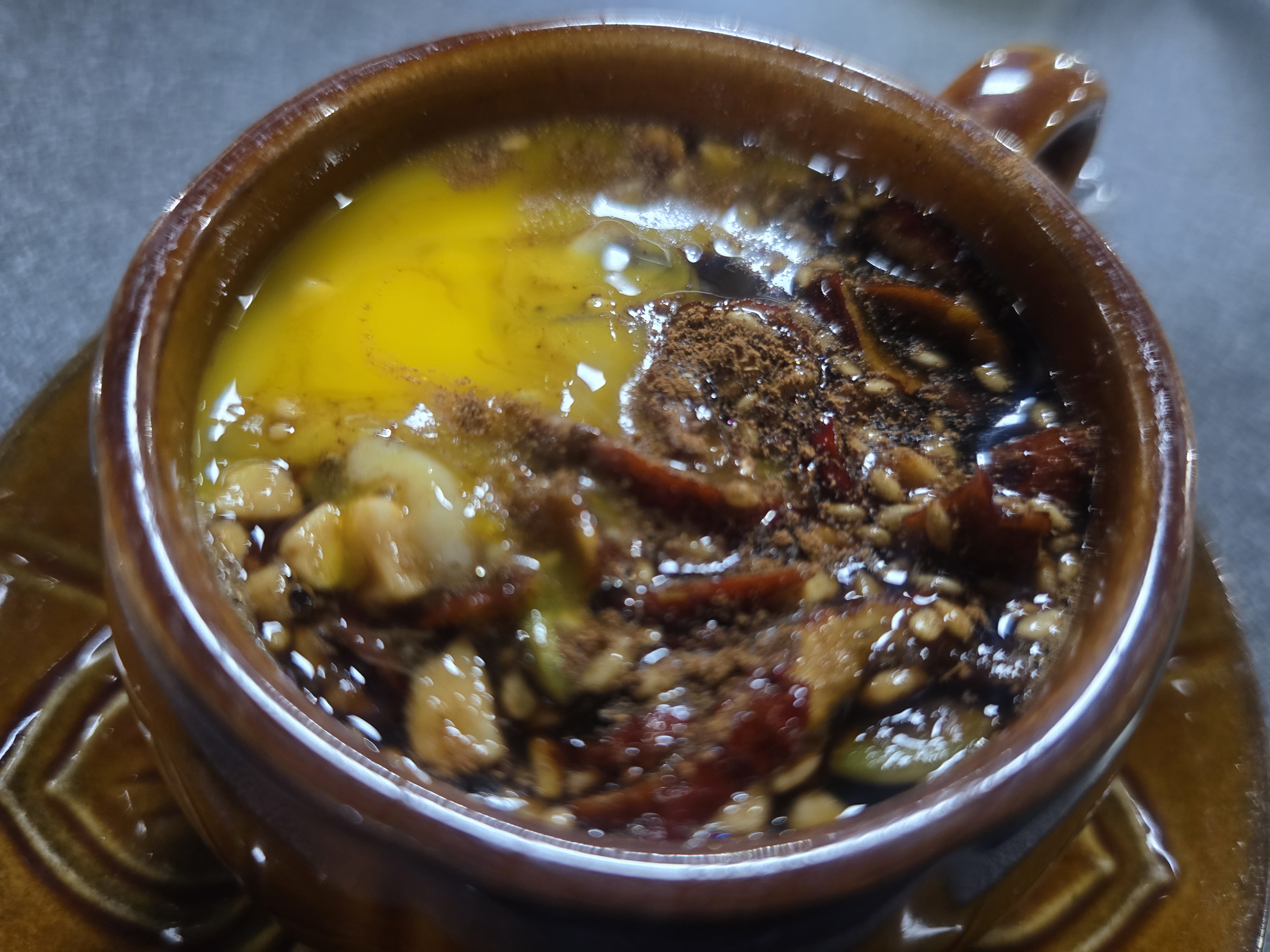 아쉽게도 계란노른자가 터져 원형을 유지하고 있지 않지만, 대추 잣 땅콩 호박씨까지 여러가지 고소한 씨앗과 계피가루까지 분명 옛날맛 쌍화차입니다 .