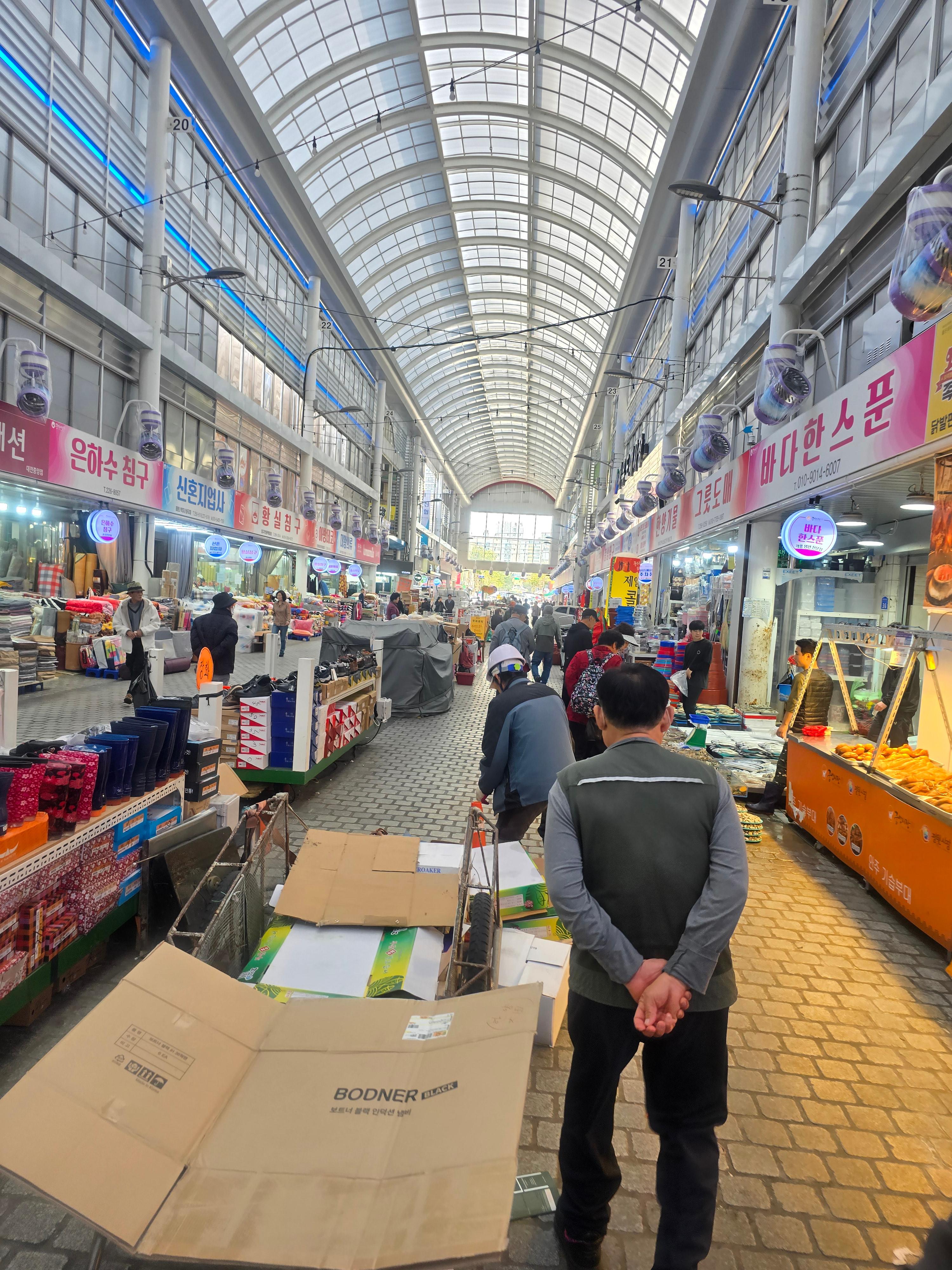 요즈음 재래시장은 모두 천정을 만들어 비가오나 눈이 오나 쇼핑에 문제가 없도록 쾌적한 환경을 만들어 진화하고 있습니다 .