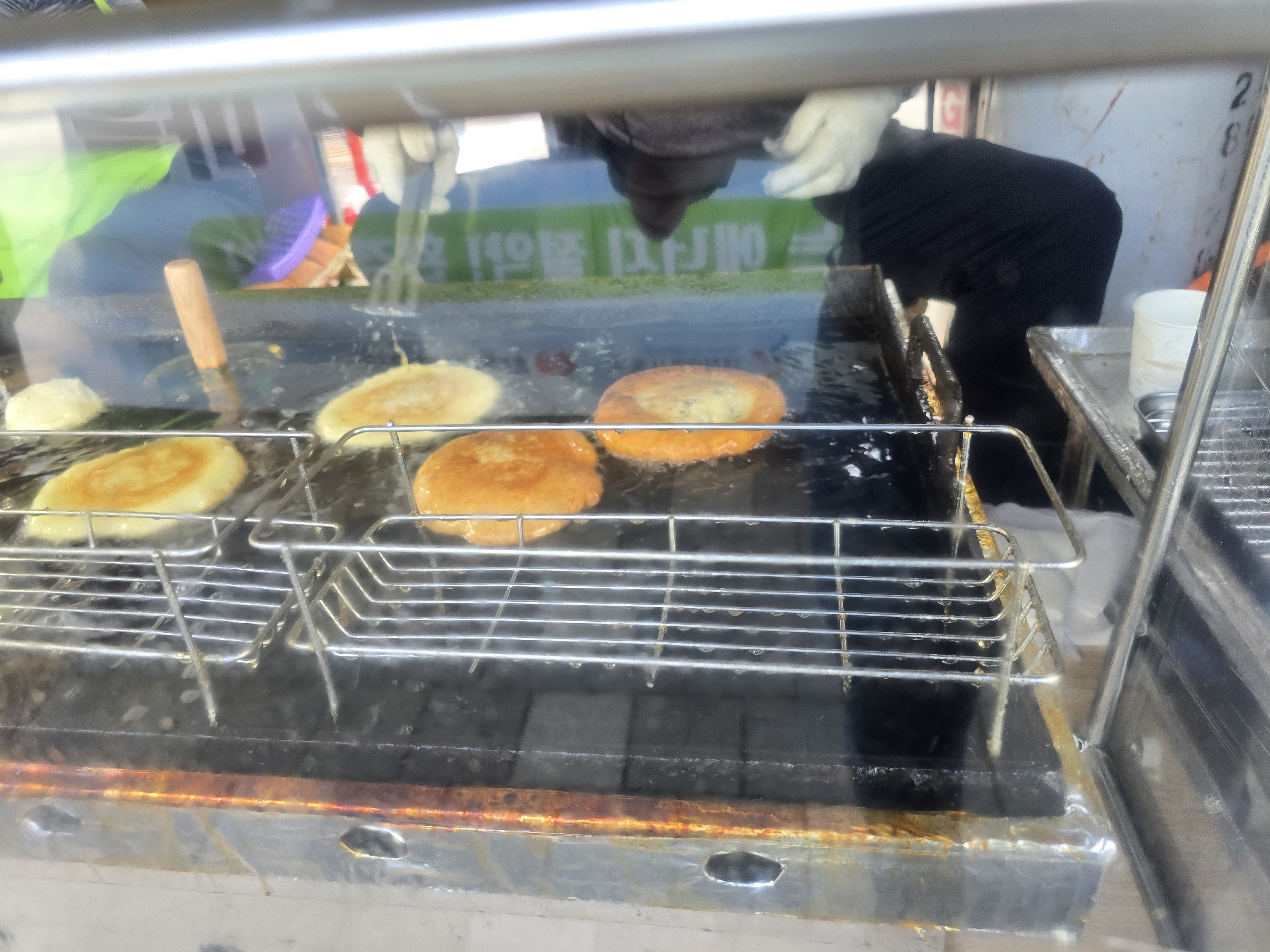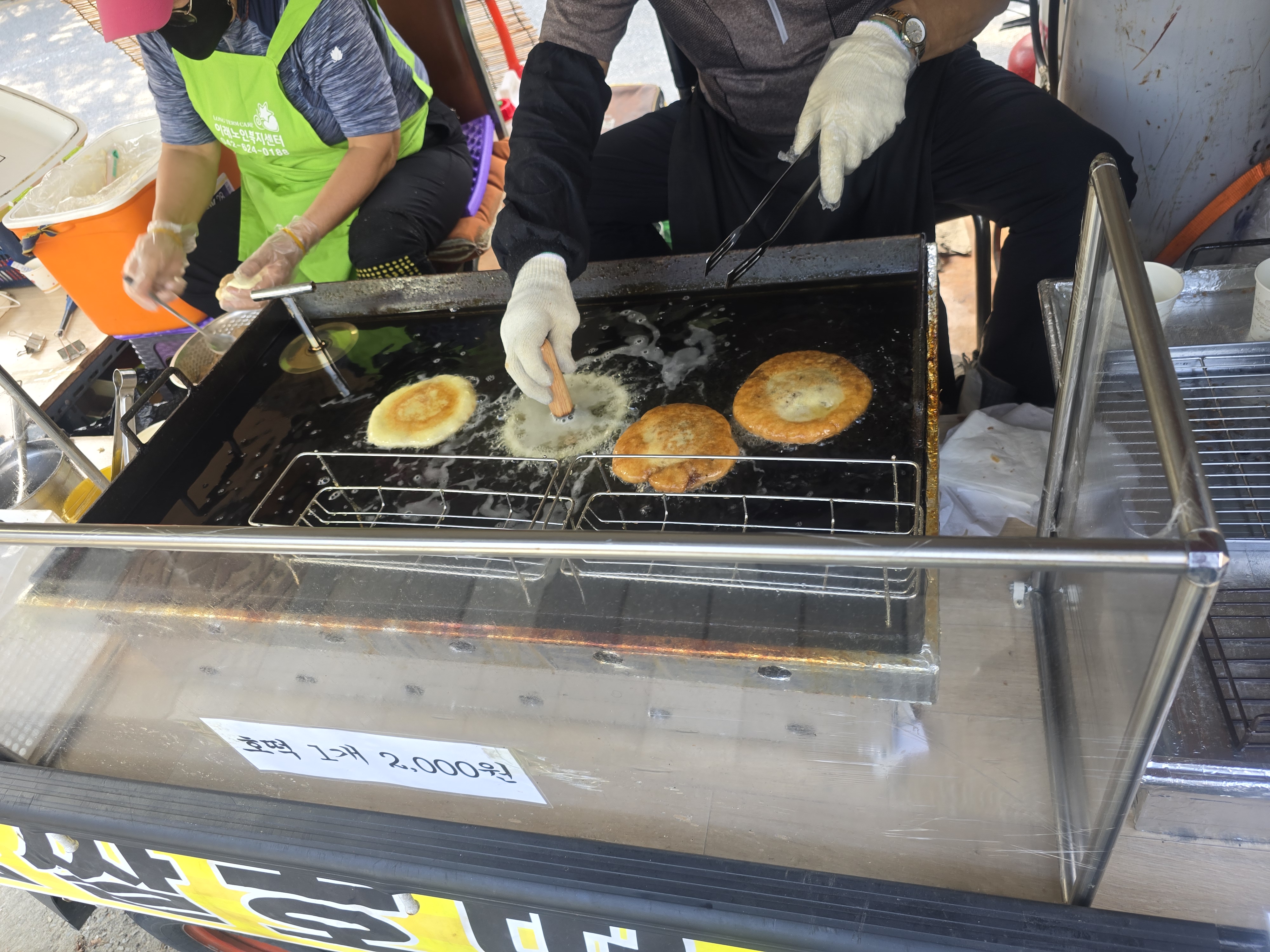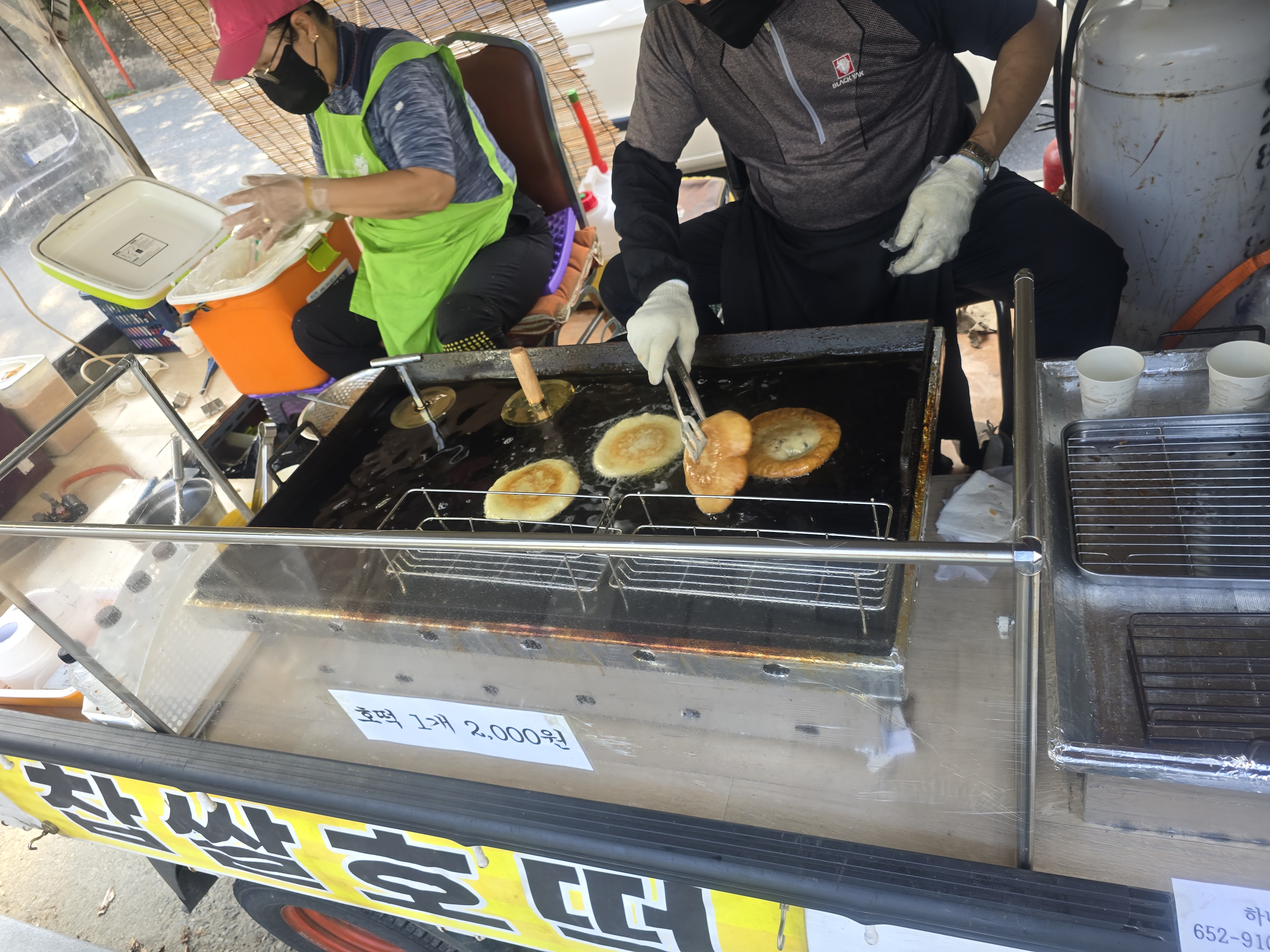 아무튼 부부로 보이는 두사람이 분업하여 한쪽은 호떡을 빚고 한쪽은 호떡을 튀기고 계산하고 손발이 딱딱 맞습니다.