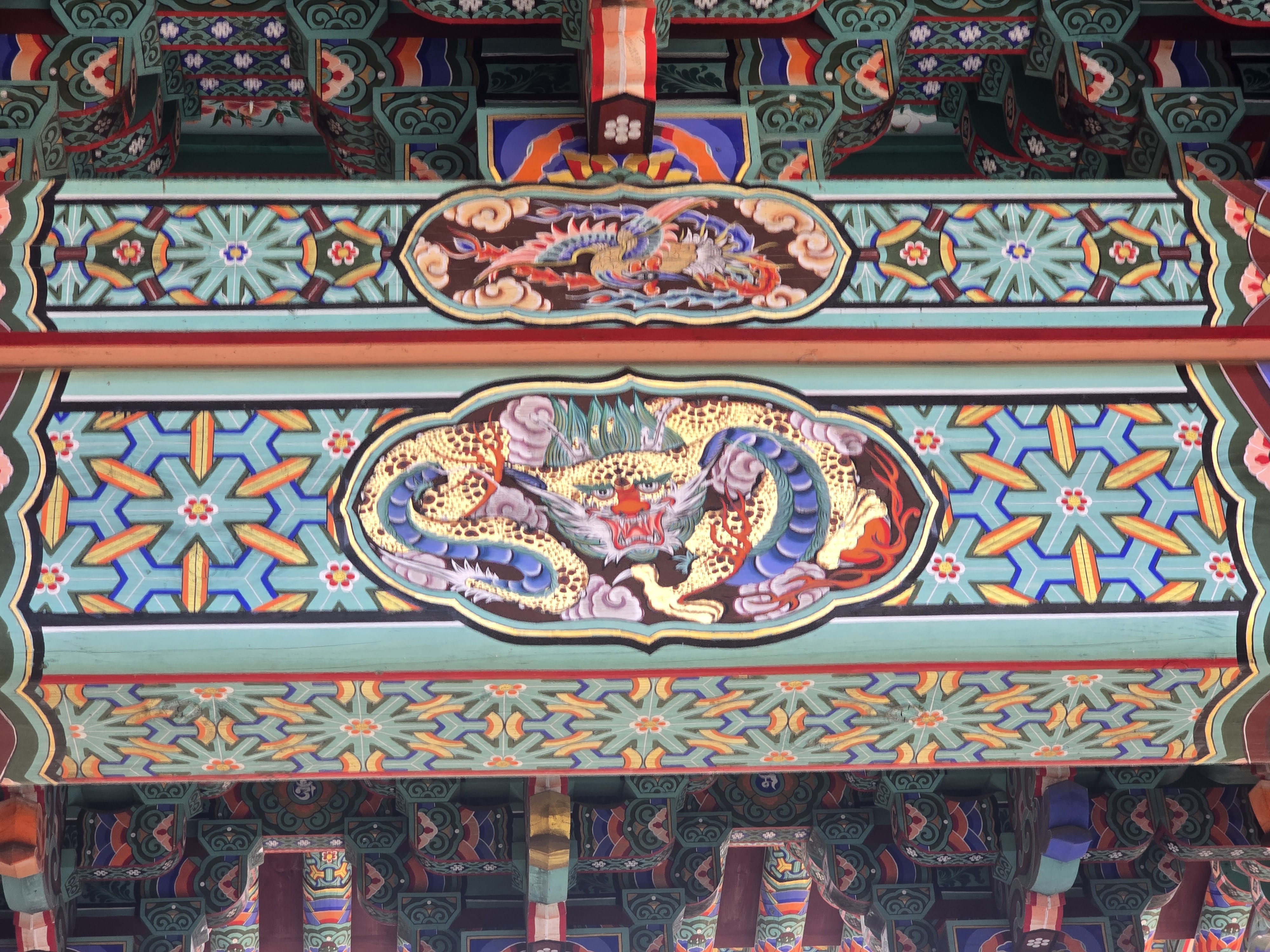 단청에 그려진 용과 귀면 문양이 화려 합니다.
