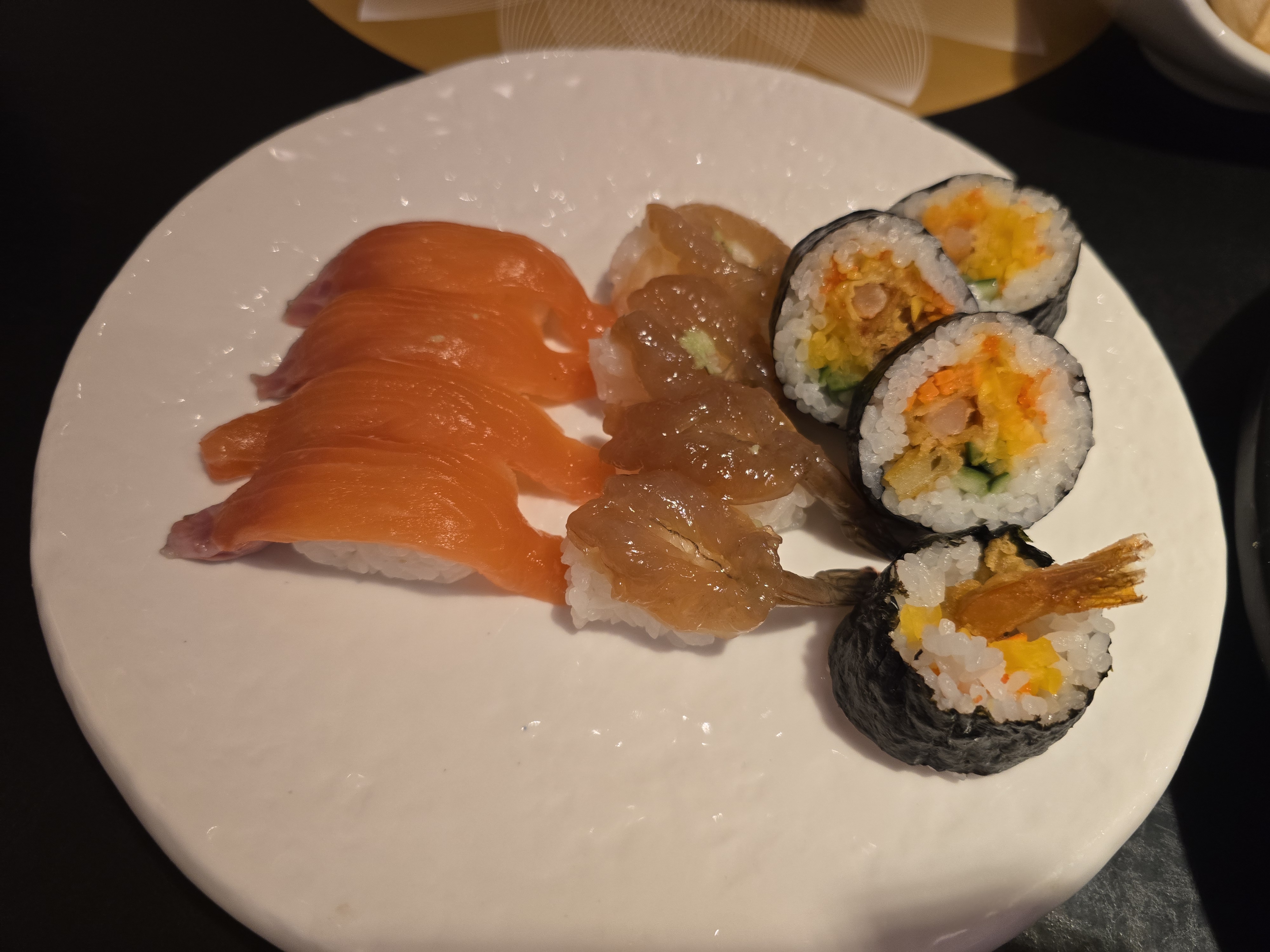 연어와 새우초밥, 새우튀김마끼(김밥)가 나왓습니다