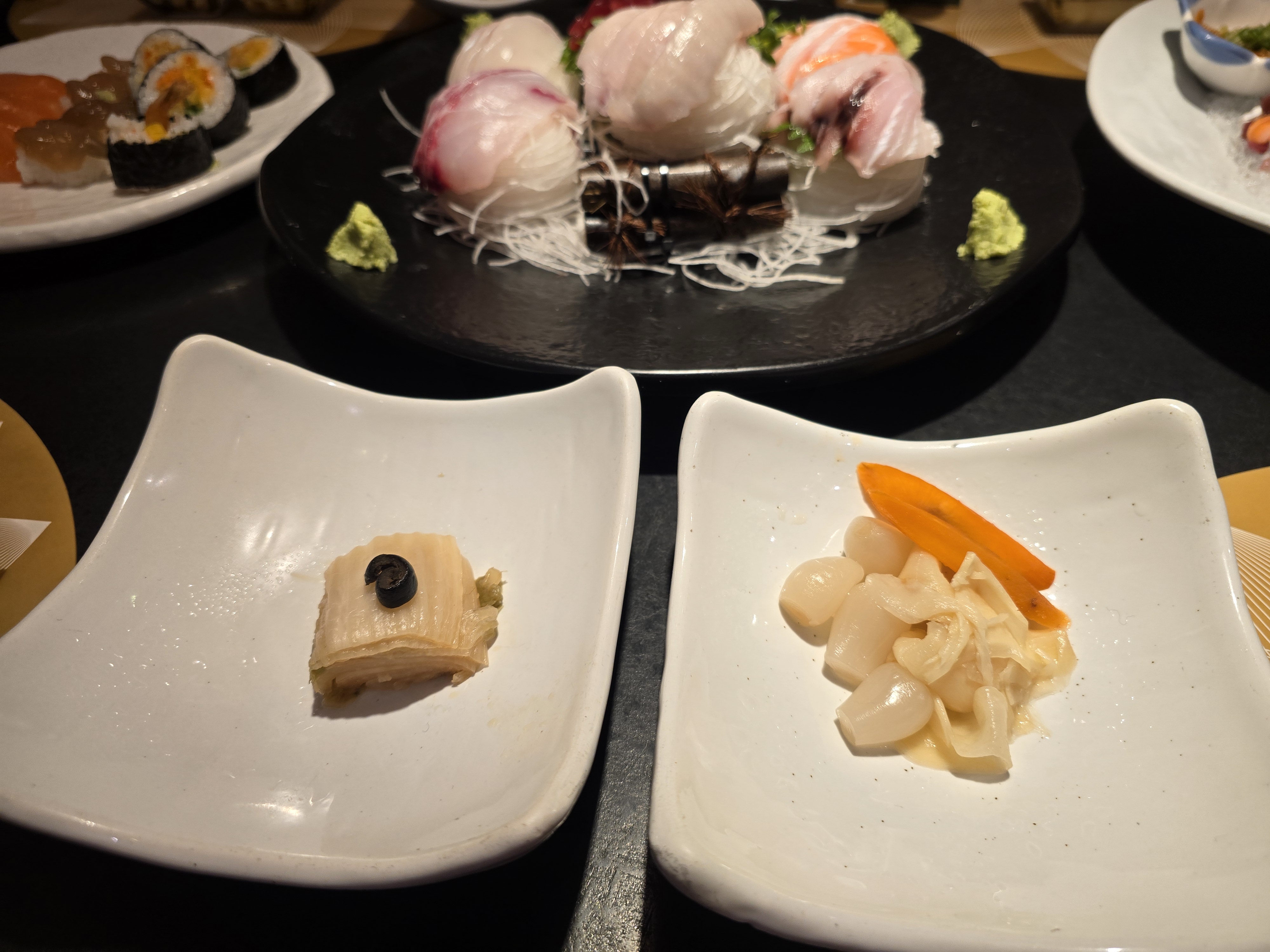 서비스로 나온 맛보기 방어회입니다 . 뱃살과 등살 두가지가 나왔습니다 . 제철이 되어서 그런지 방어의 기름기가 고소합니다.