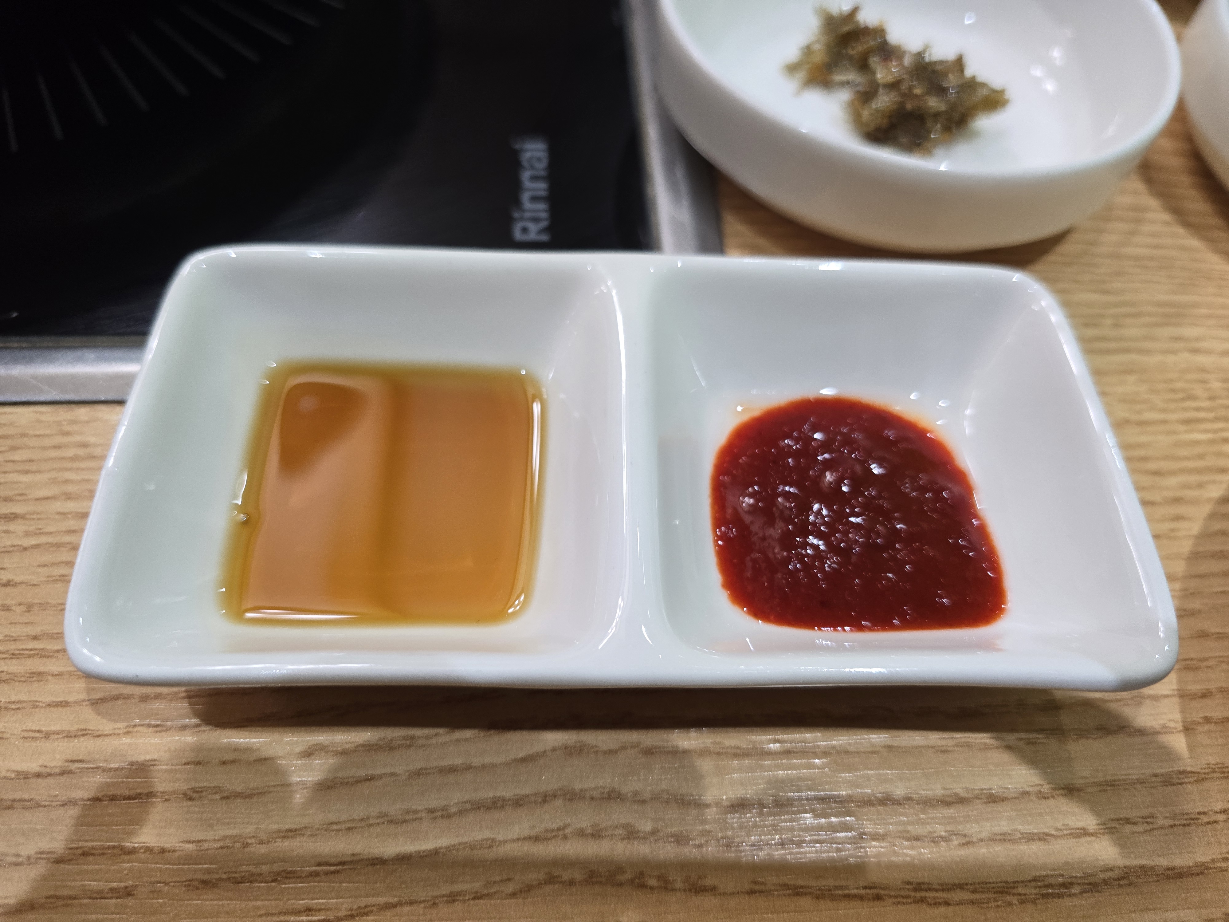 샤브샤브소스에는 연한 간장소스와 초고추장소스가 나옵니다.