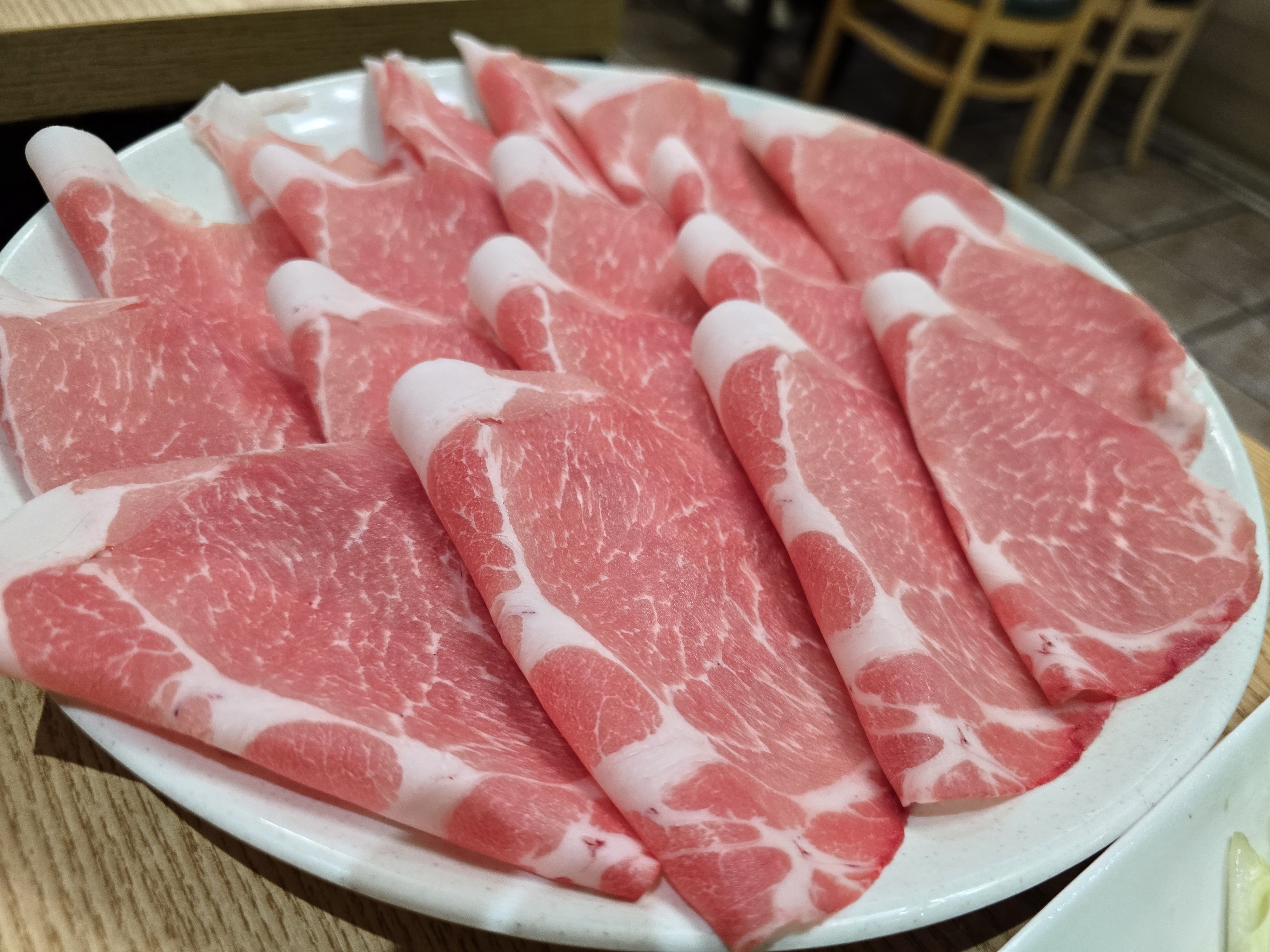 때깔 좋은 샤브용 돼지고기입니다 . 지방이 적은 등심부위인듯 합니다 . 종이처럼 얇게 썰어서