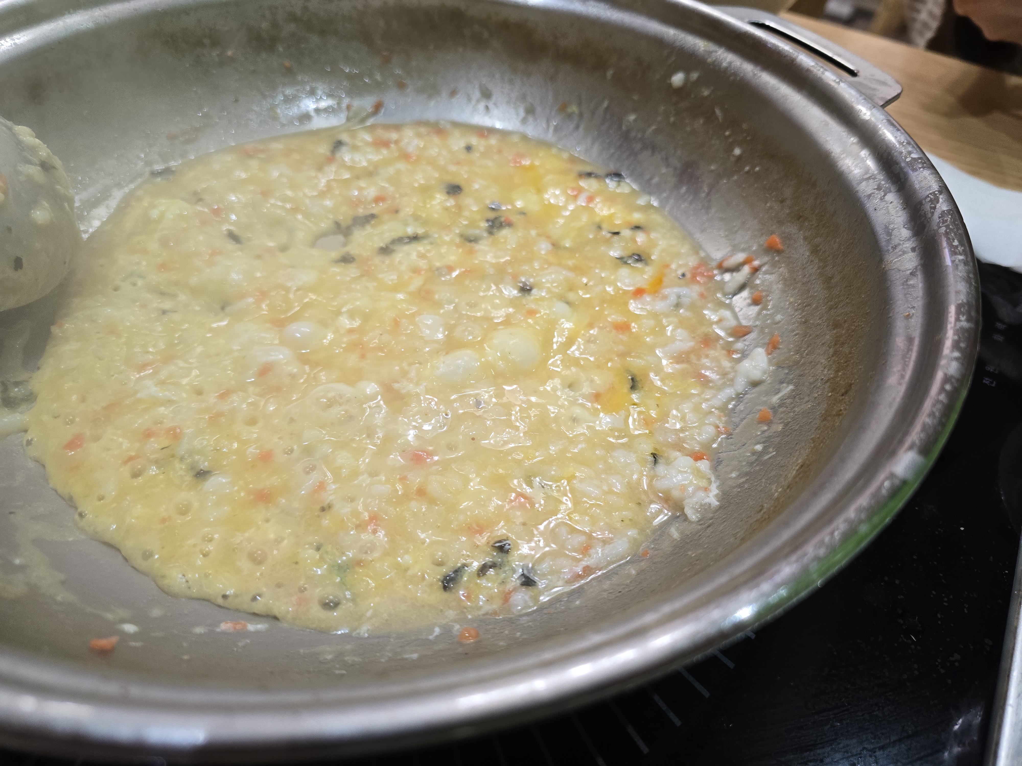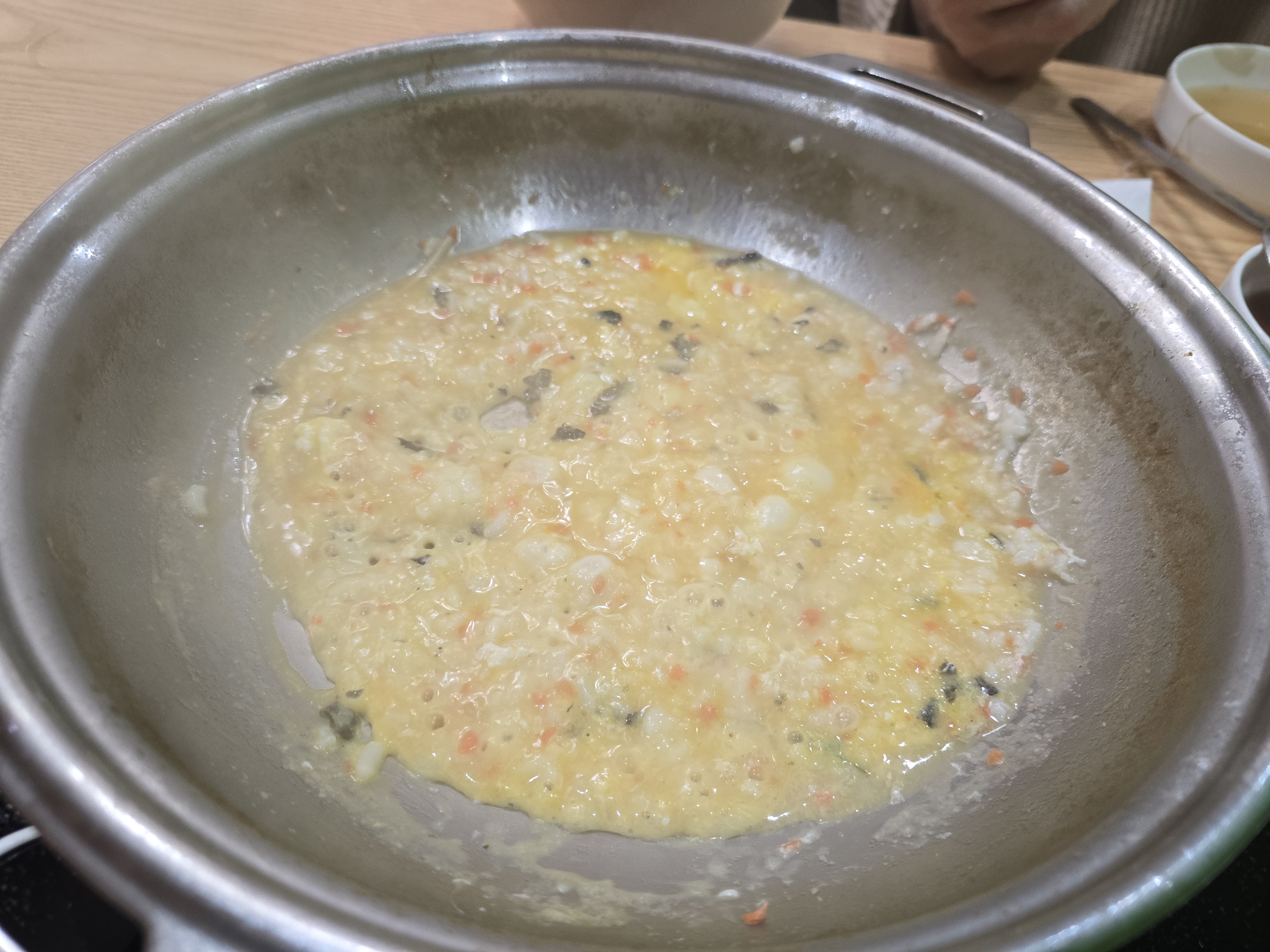마무리는 죽입니다. 계란과 밥한공기를 남은 육수에 넣고 부드럽게 야채죽을 만들어 먹습니다.