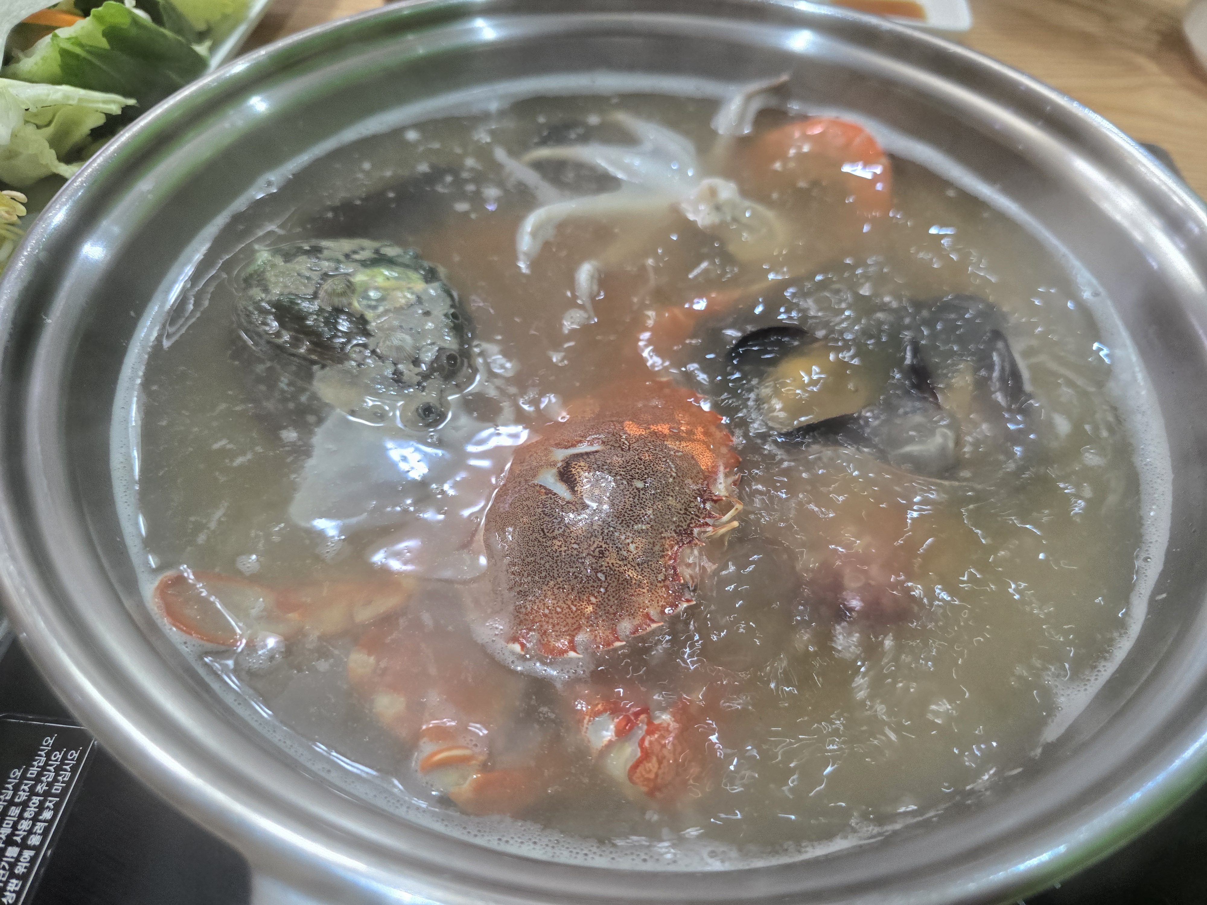먼저 해물로 육수에 감칠맛을 더하고 야채를 넣고 마지막에 고기를 넣는게 순서 입니다 .