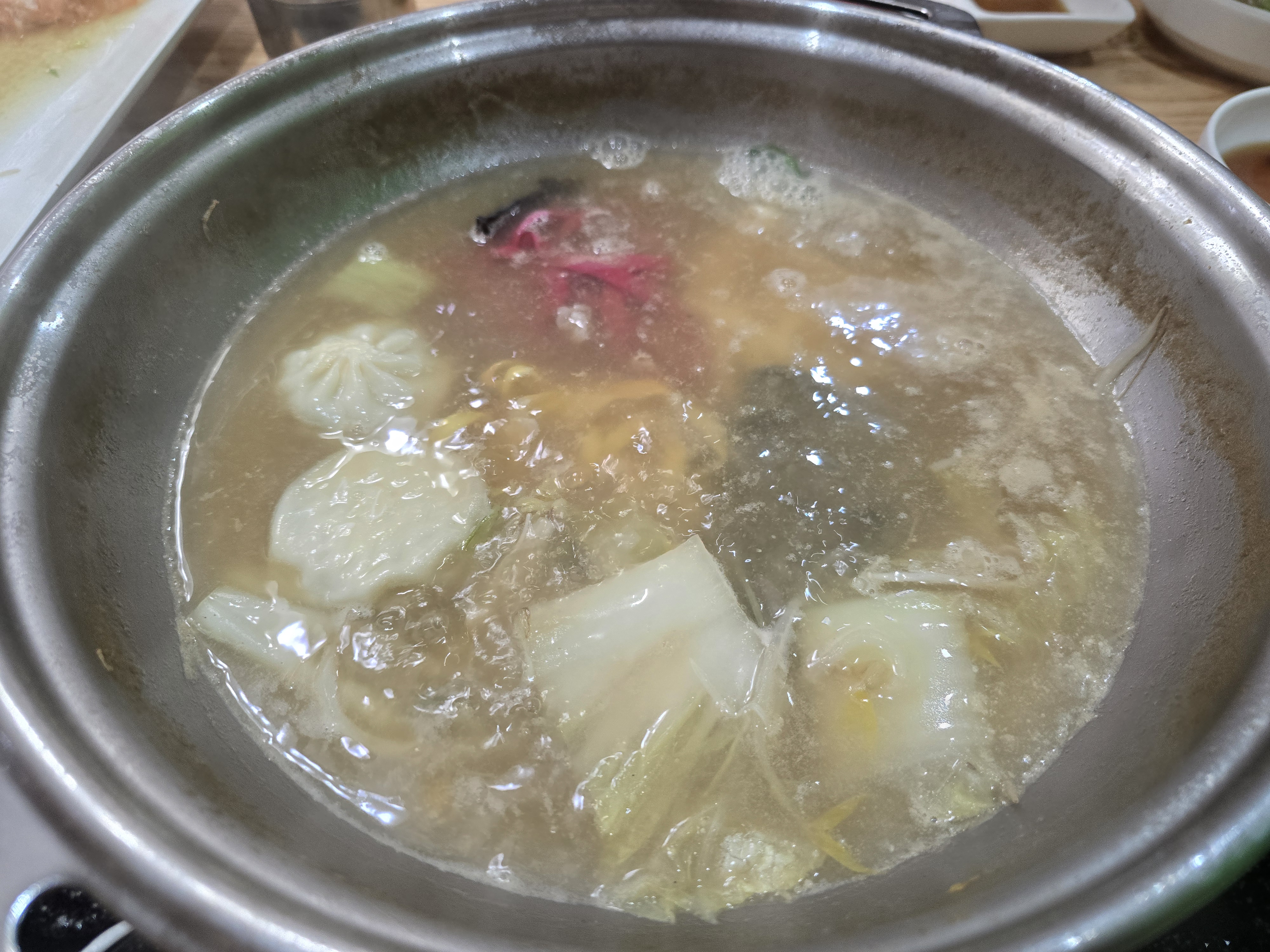 샤브샤브를 다먹고 칼국수를 요청하면 인당 만두 한개와 칼라플한 칼국수면을 가져다 줍니다 . 한 7분정도 끓여야 면이 익는다고 합니다 .