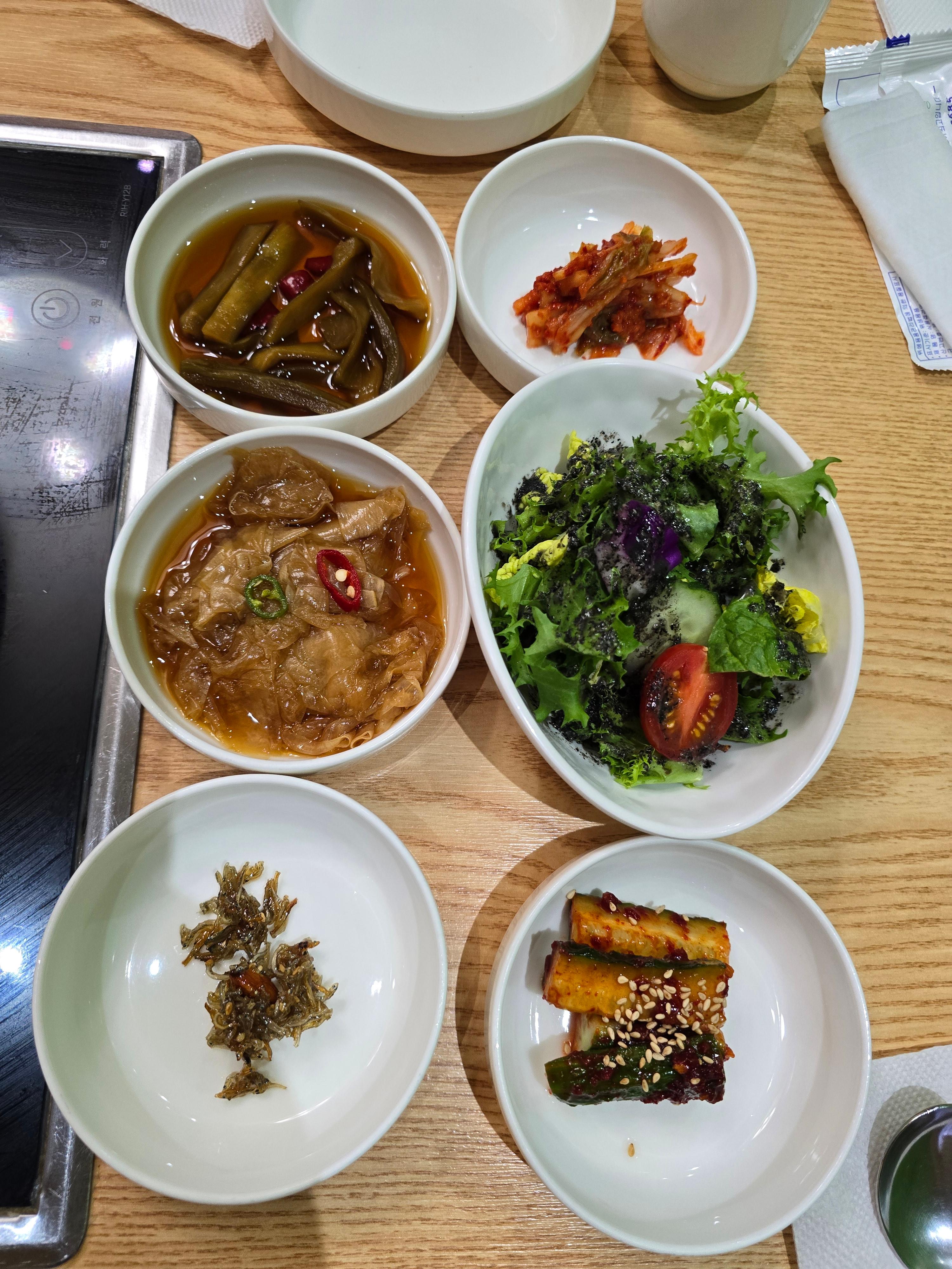 정갈한 기본찬이 깔립니다. 가운데 슬라이스한 무초절임이 입맛을 돋구는게 맛있었습니다 .