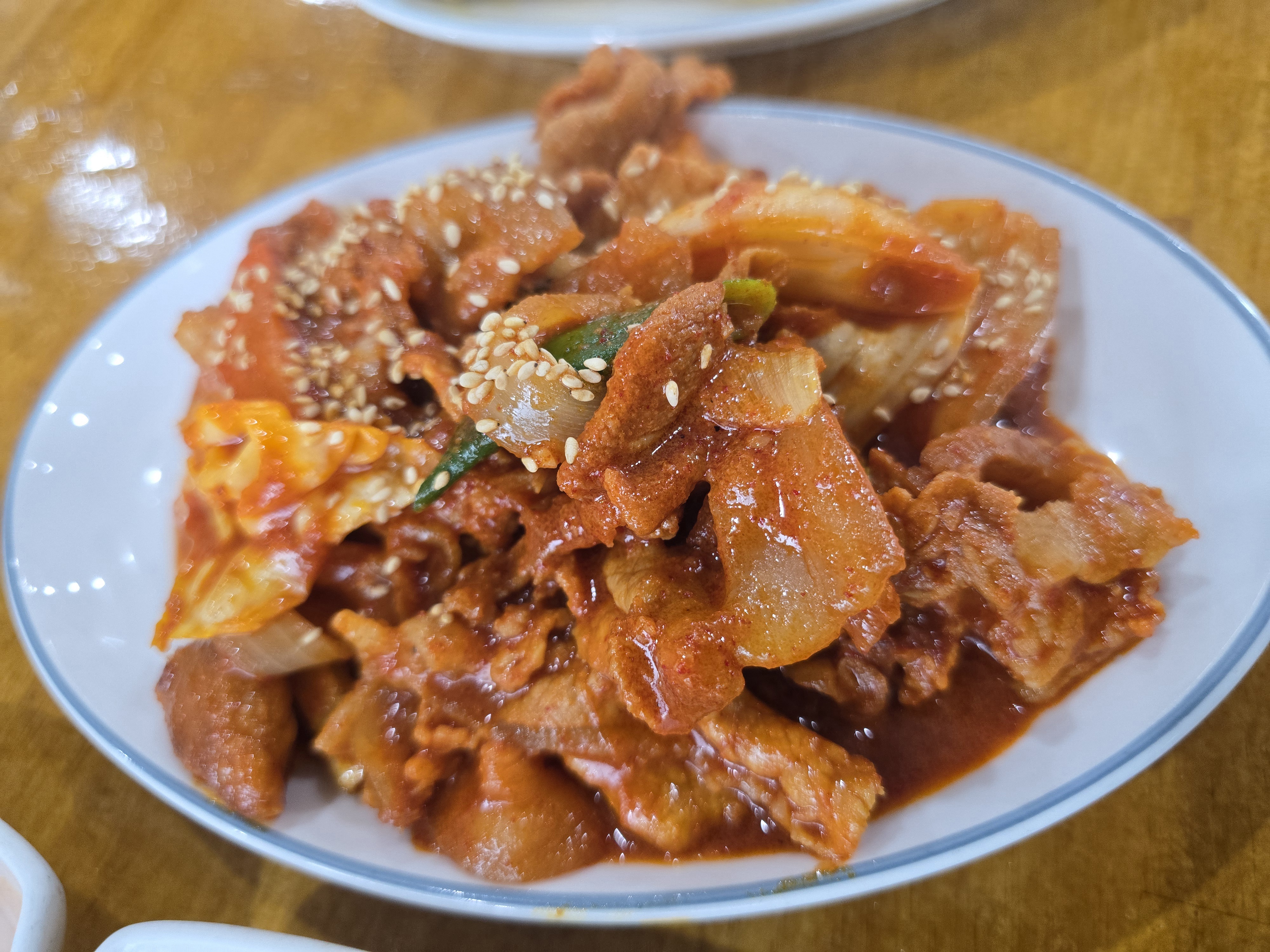 간단한 점심식사로는 훌륭합니다 . 잘 볶아진 제육복음에 상추 한쌈이면 밥한공기 뚝딱할 수 잇습니다 .