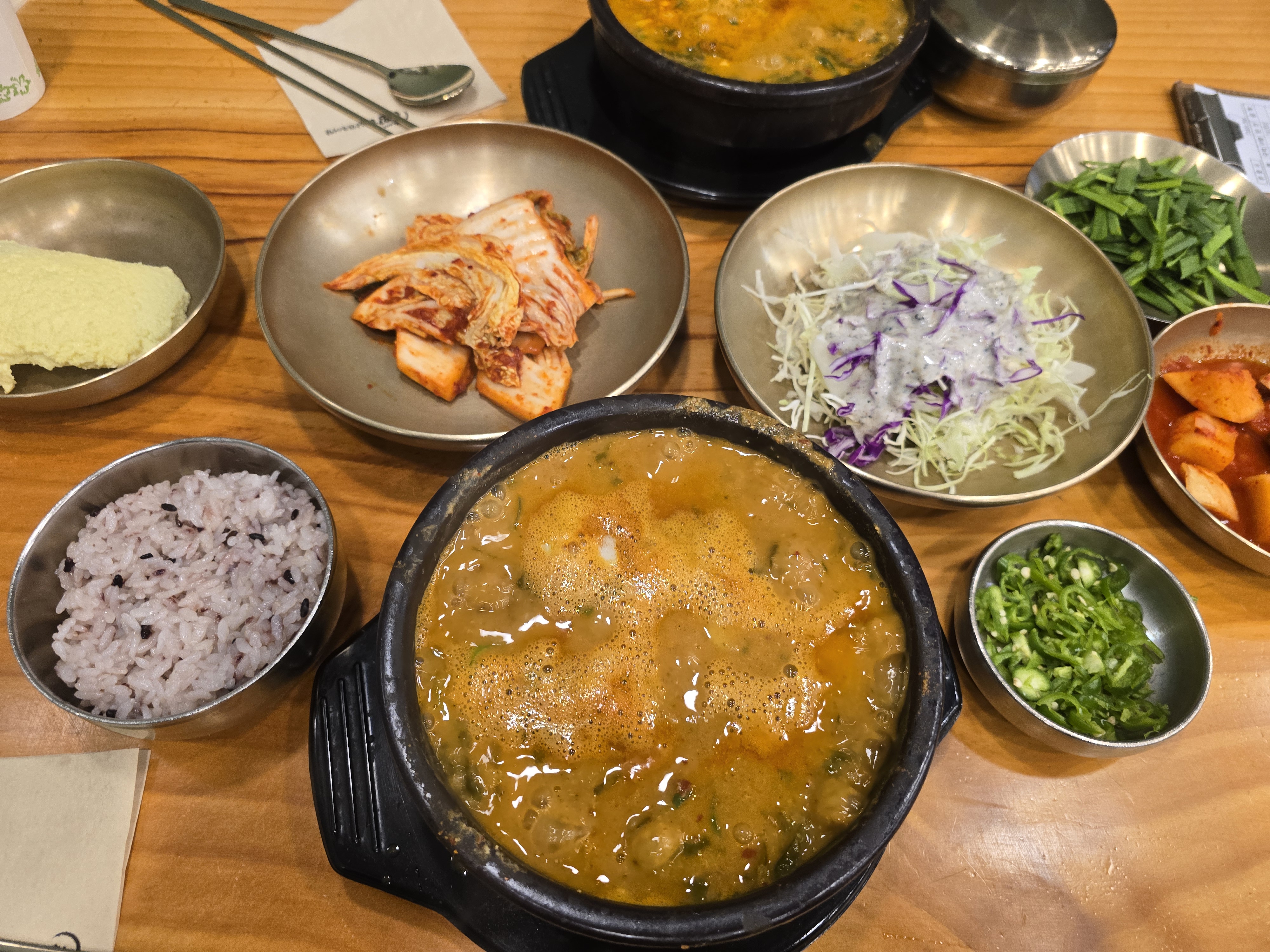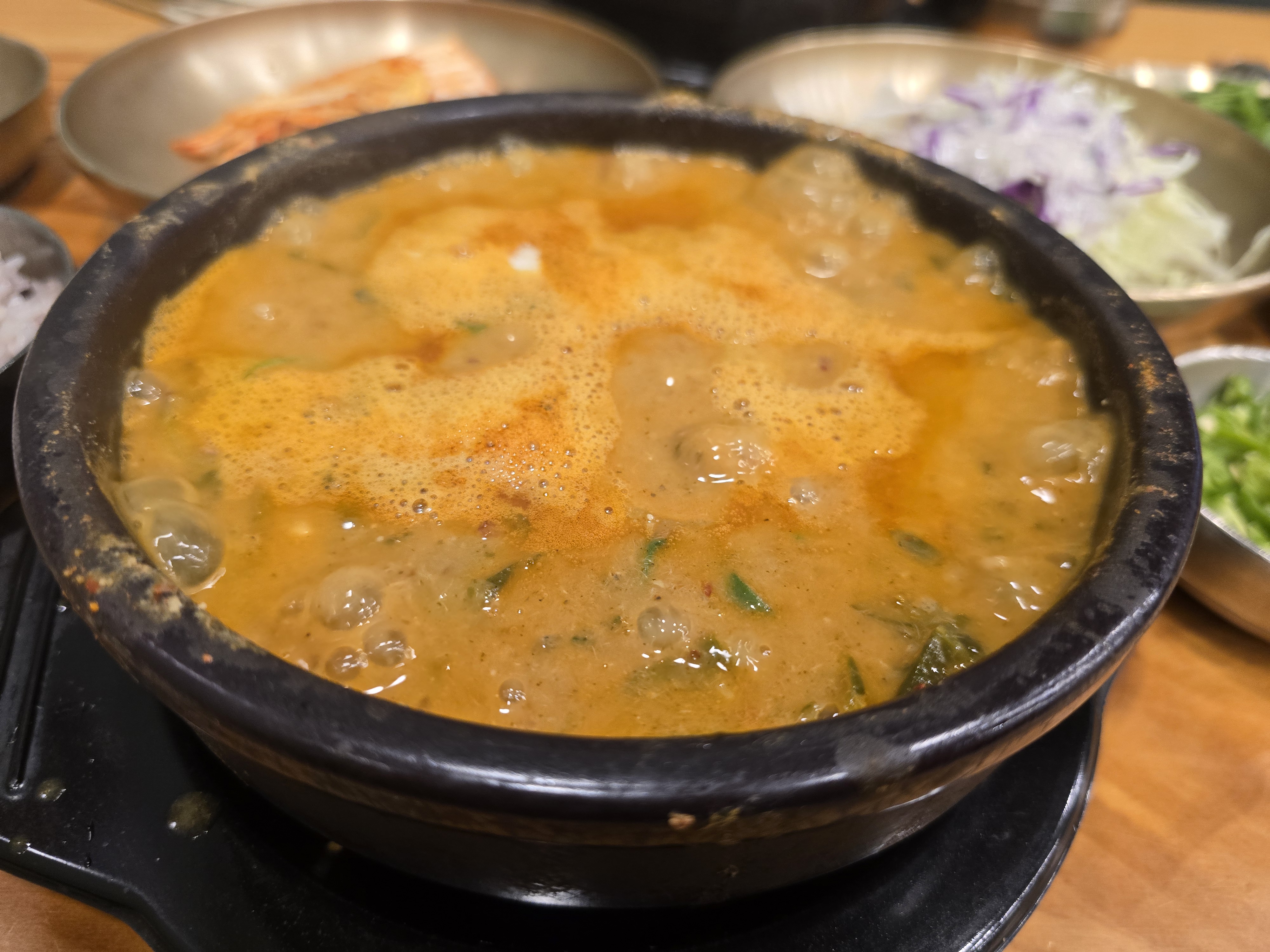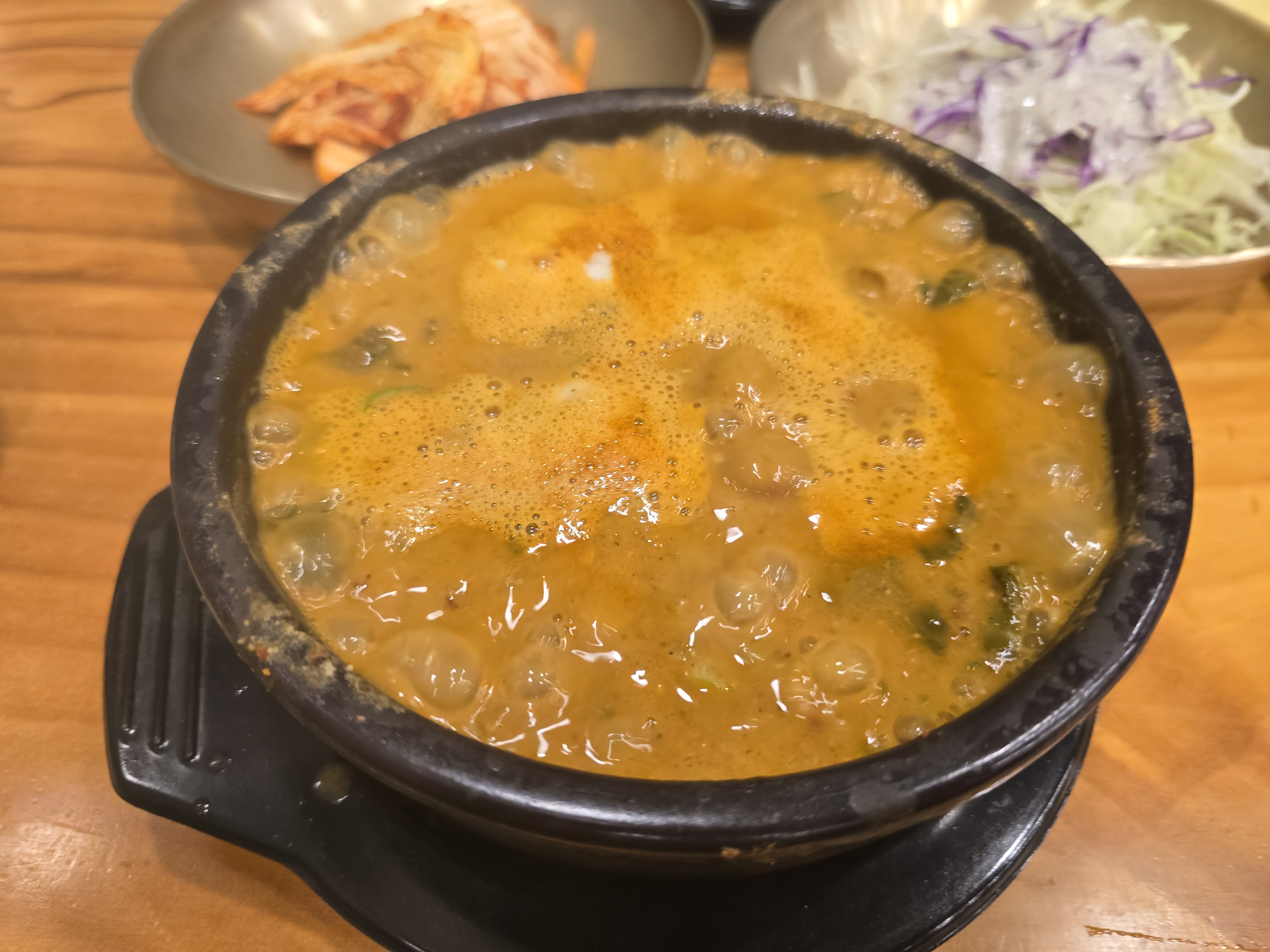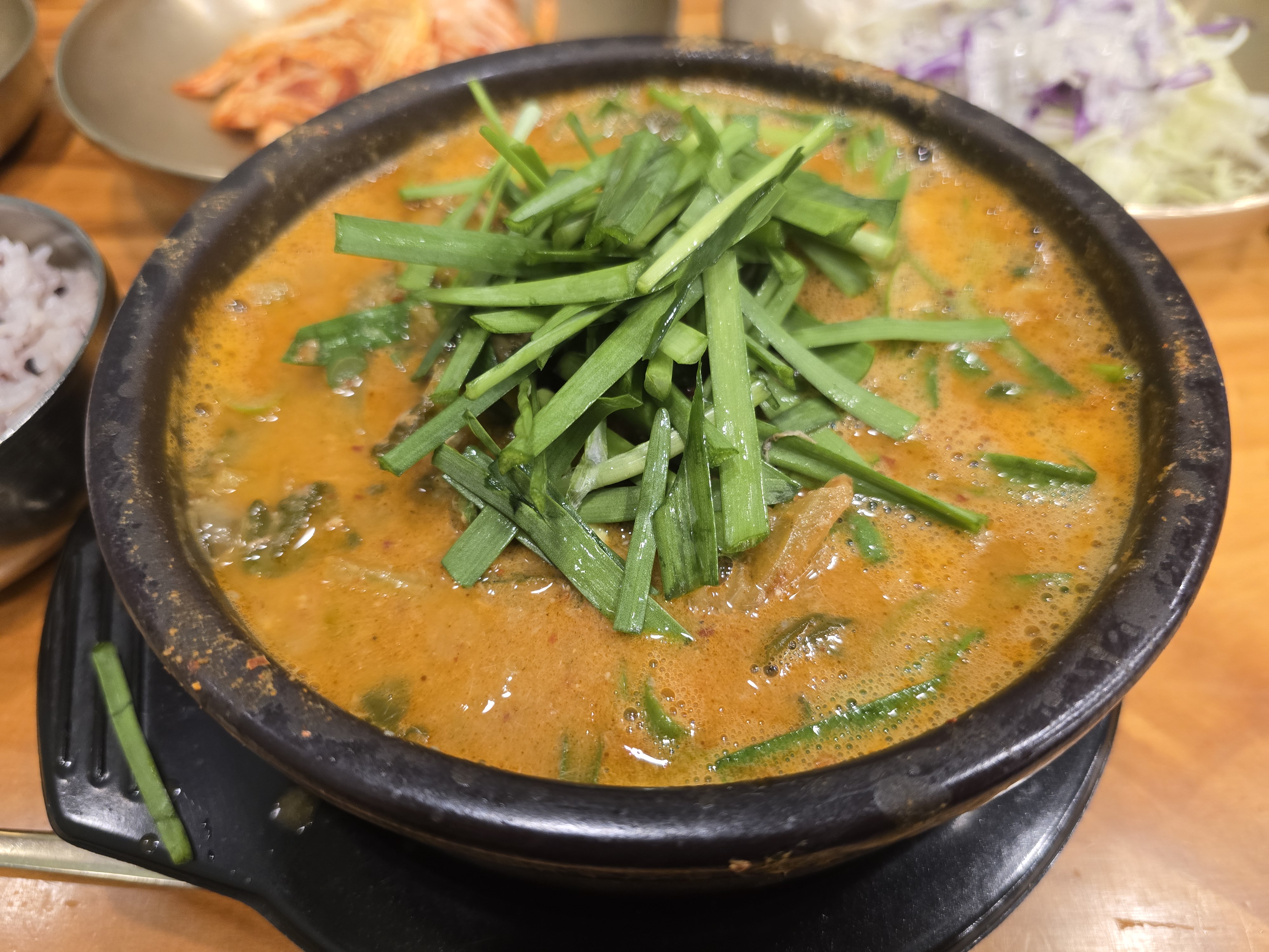 뚝배기 가득 펄펄 긇는 추어탕이 니왔습니다.