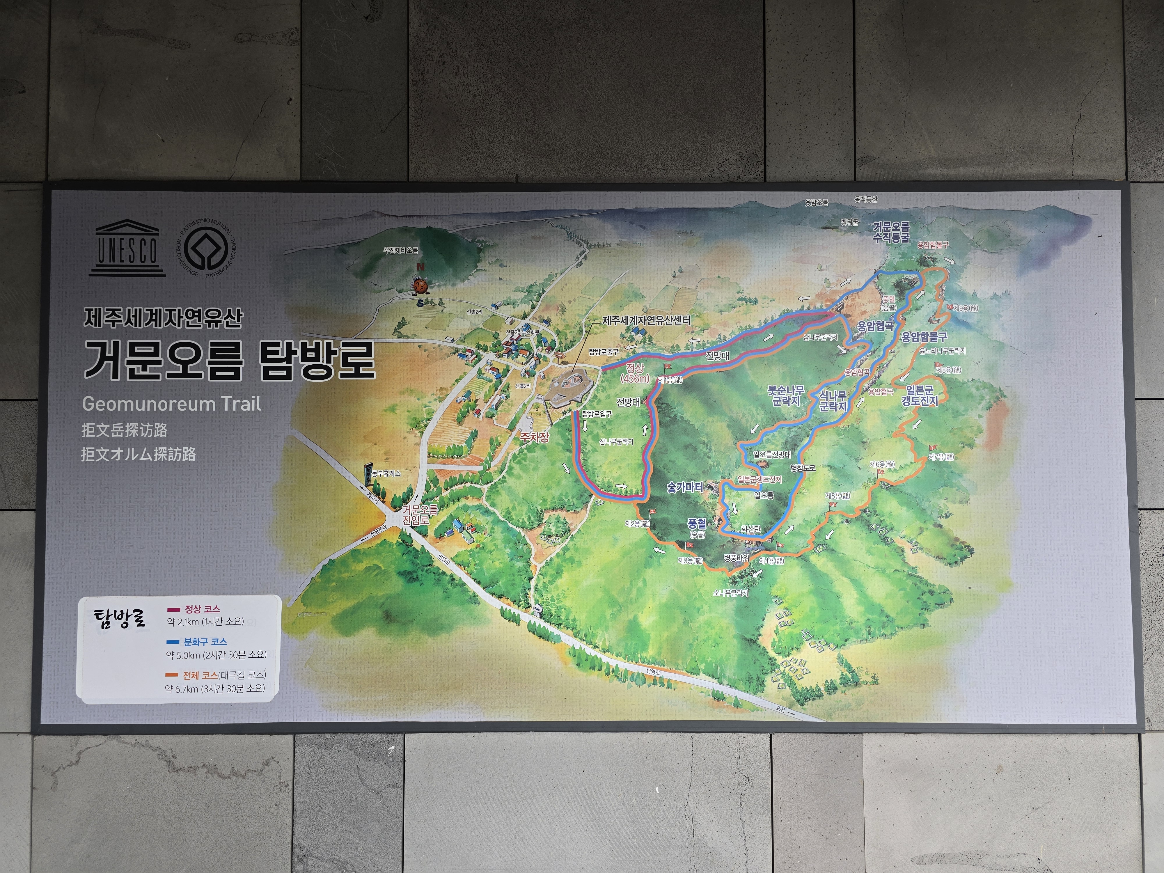 탐방로는 2.1키로 한시간소요되는 정상코스, 5키로 2시간30분소요되는 분화구코스, 6.7키로 3시간30분소요되는 전체코스(태극길코스) 로 3가지가 잇습니다.