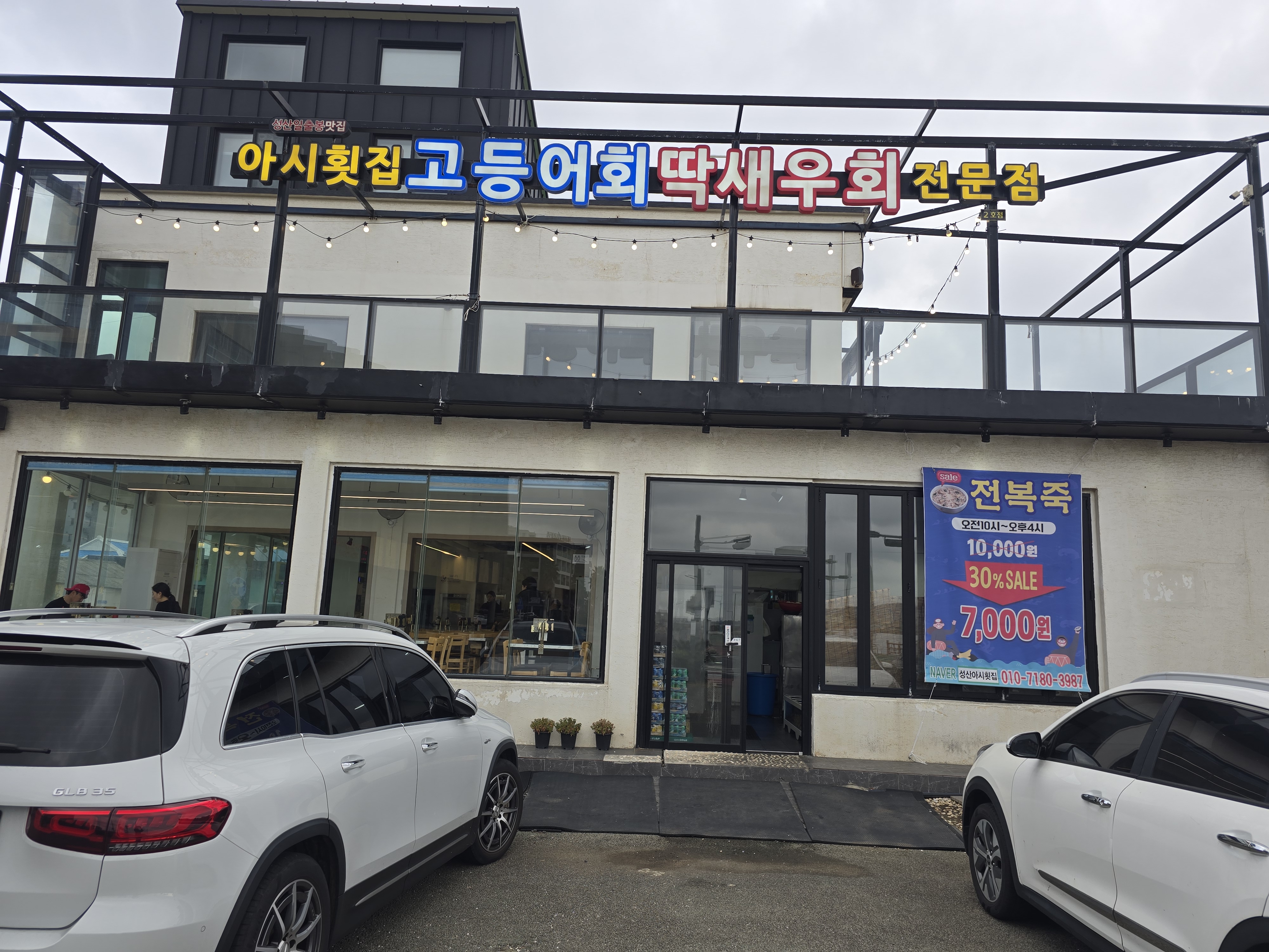 제주여행중 성산일출봉에 가는길 금강산도 식후경이라고 점심시간이 되니 구경보다 점심을 먹기로 했습니다 . 제주도하면 다른 곳에서 먹기 힘든 갈치회가 유명합니다 . 고등어회, 딱새우회전문점인 아시횟집에 차를 멈추었습니다 .