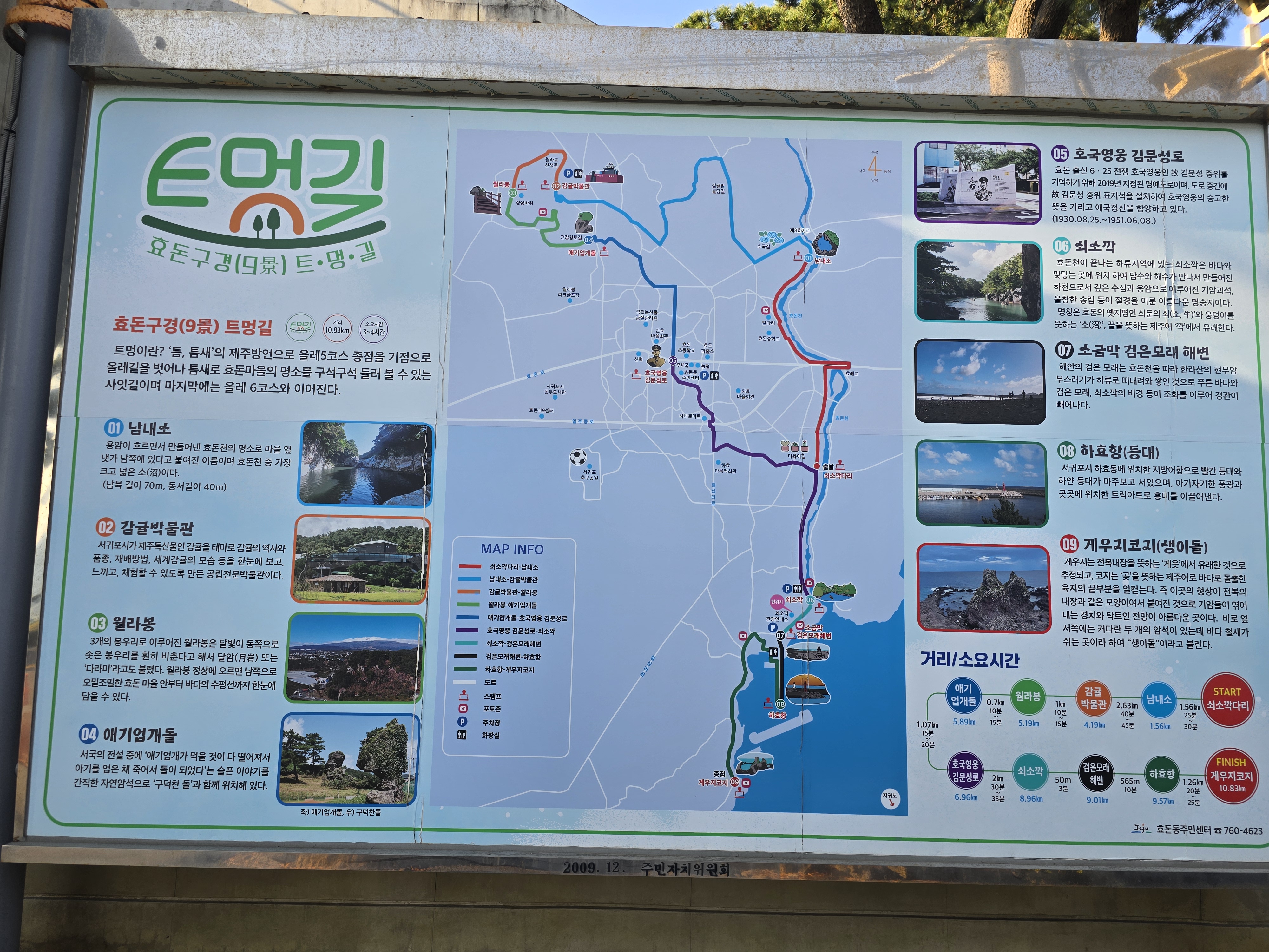 효돈 9경 트멍길 안내판에도 쇠소깍이 들어 있습니다. 트멍길은 제주 올레 5코스의 종점을 기점으로 올레길을 벗어난 틈새로 효돈마을의 명소를 돌아보는 사잇길입니다.