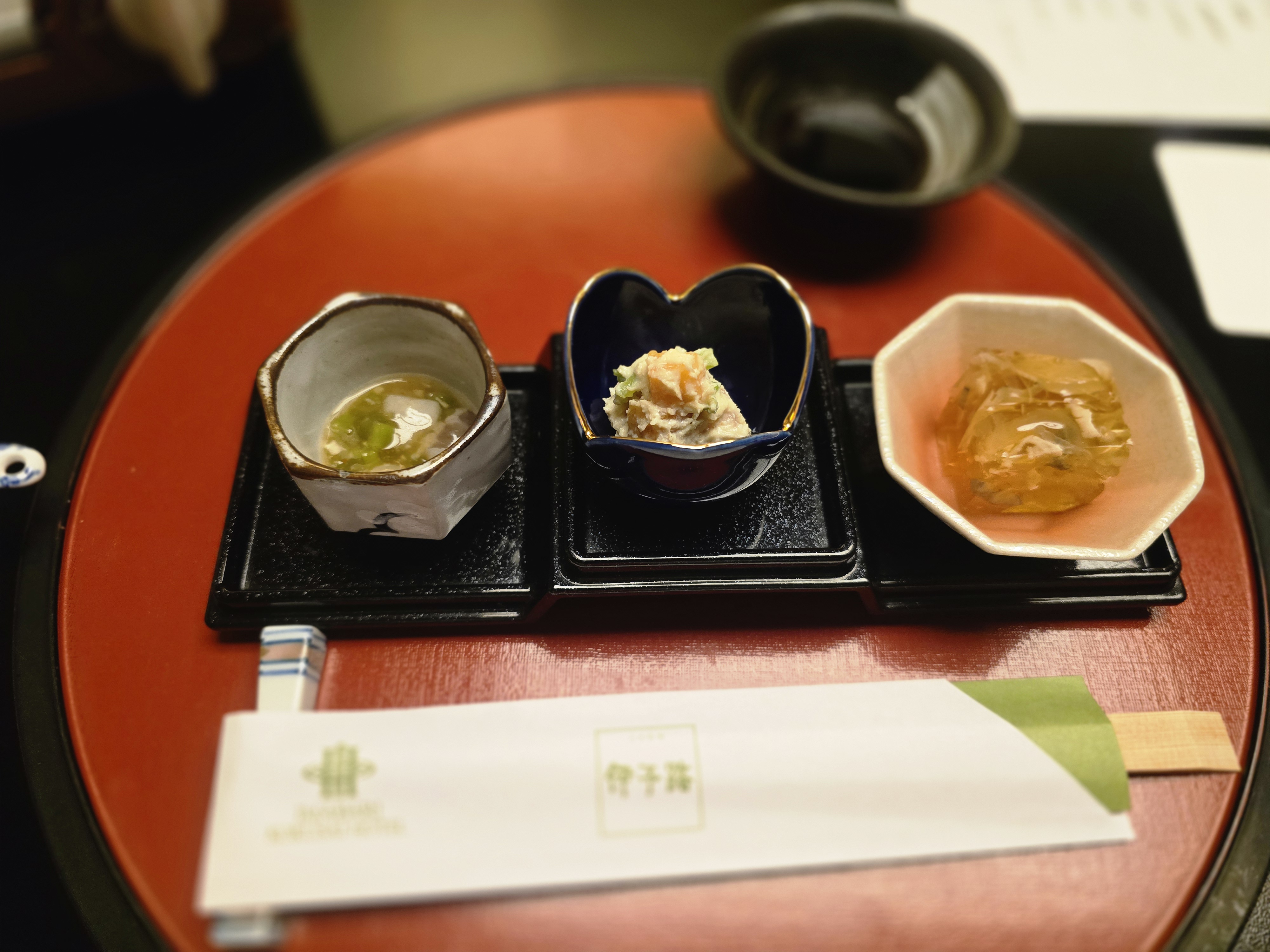 전채 3종입니다. 복껍질을 삶아 콜라겐으로 만든 묵, 감을 넣어 만든 샐러드, 문어와 산채로 만든 스프