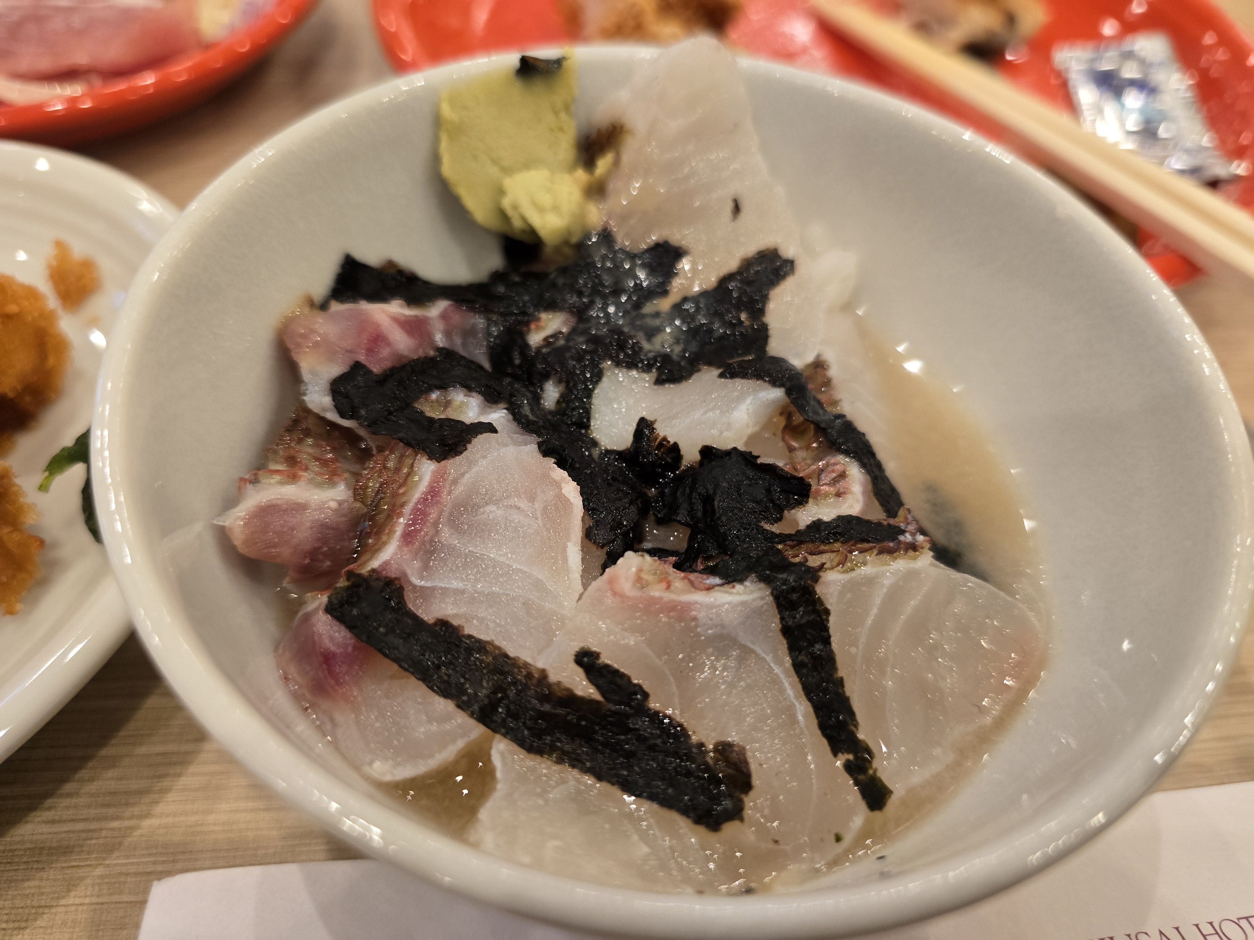 공기밥위에 참돔회를 잔뜩올리고 와사비, 참나물, 김가루를 얹은 다음 뜨거운 육수를 부어 먹습니다.