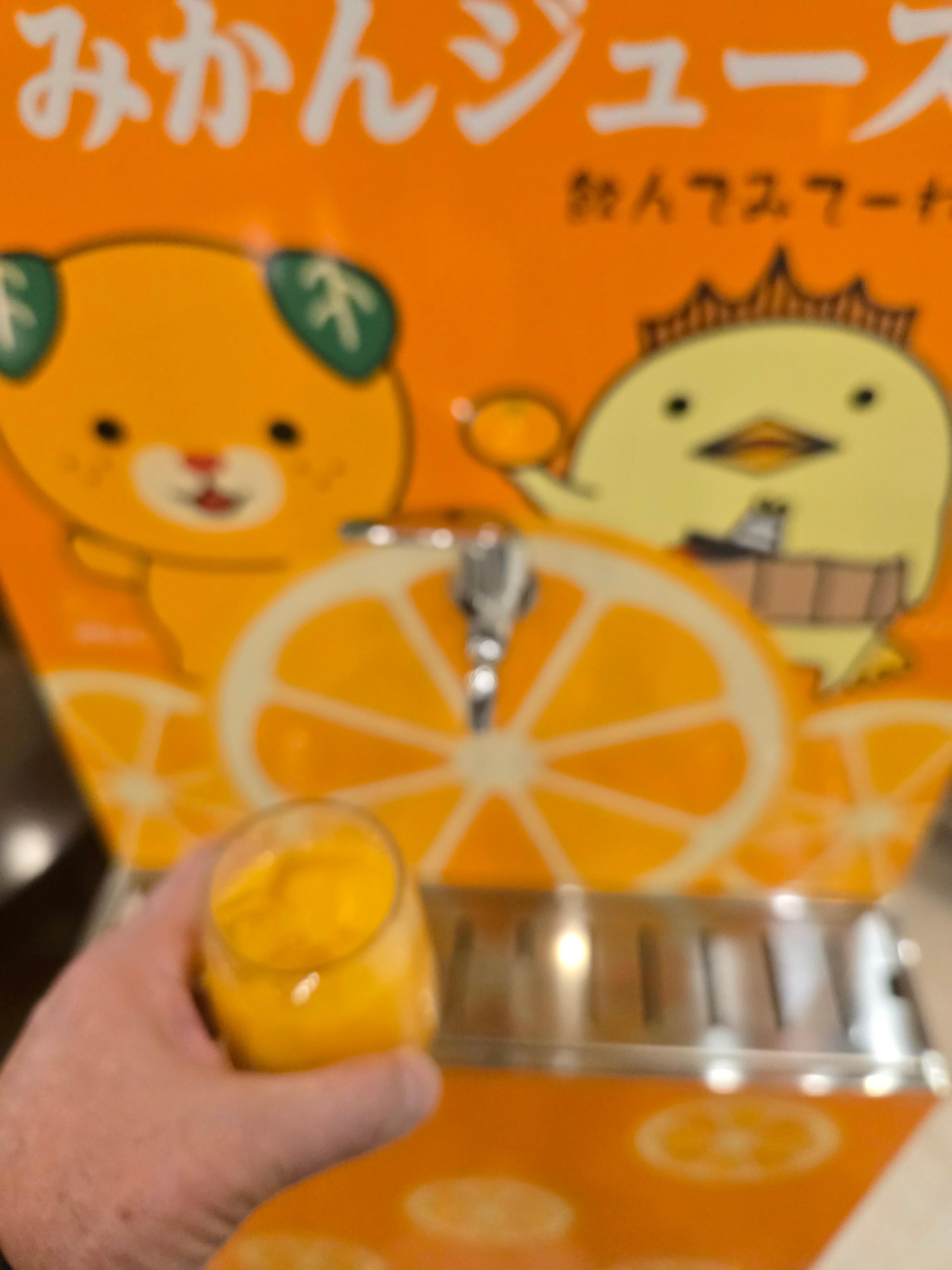 전에 없던 감귤쥬스꼭지가 살치되어 잇습니다 . 에히메의 명물 감귤로 감귤쥬스를 많이 마십니다