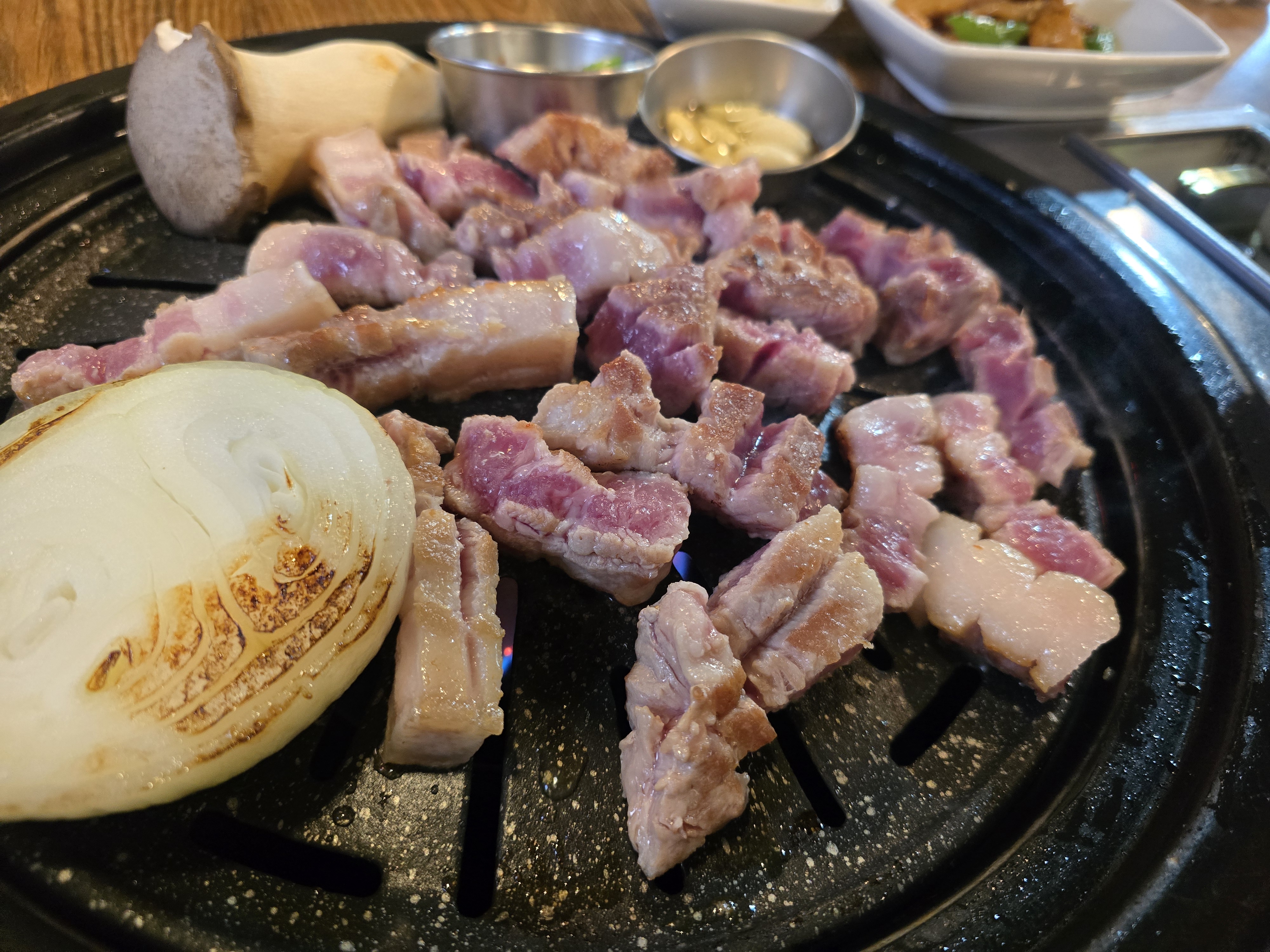신선하고 두툼한 목살과 삽겹살을 숯불에 구우면 고소하고 육즙도 충만해서 손이 자꾸 갑니다