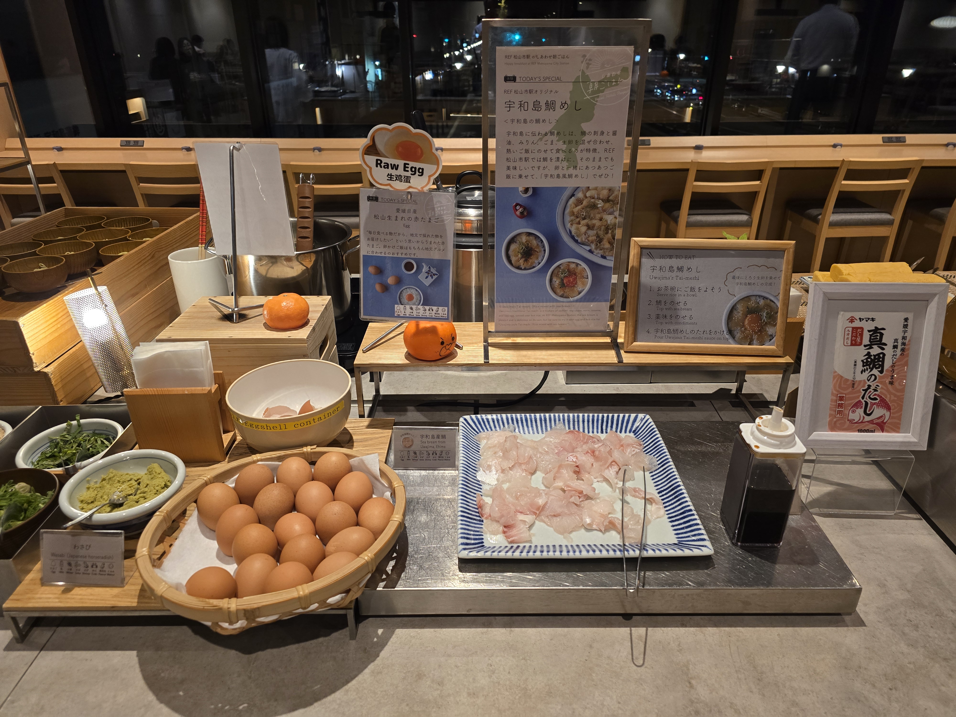 우와지마식 타이메시를 만들어 먹을 수 잇도록 참돔회와 날계란 , 소스가 갖추어져 잇습니다