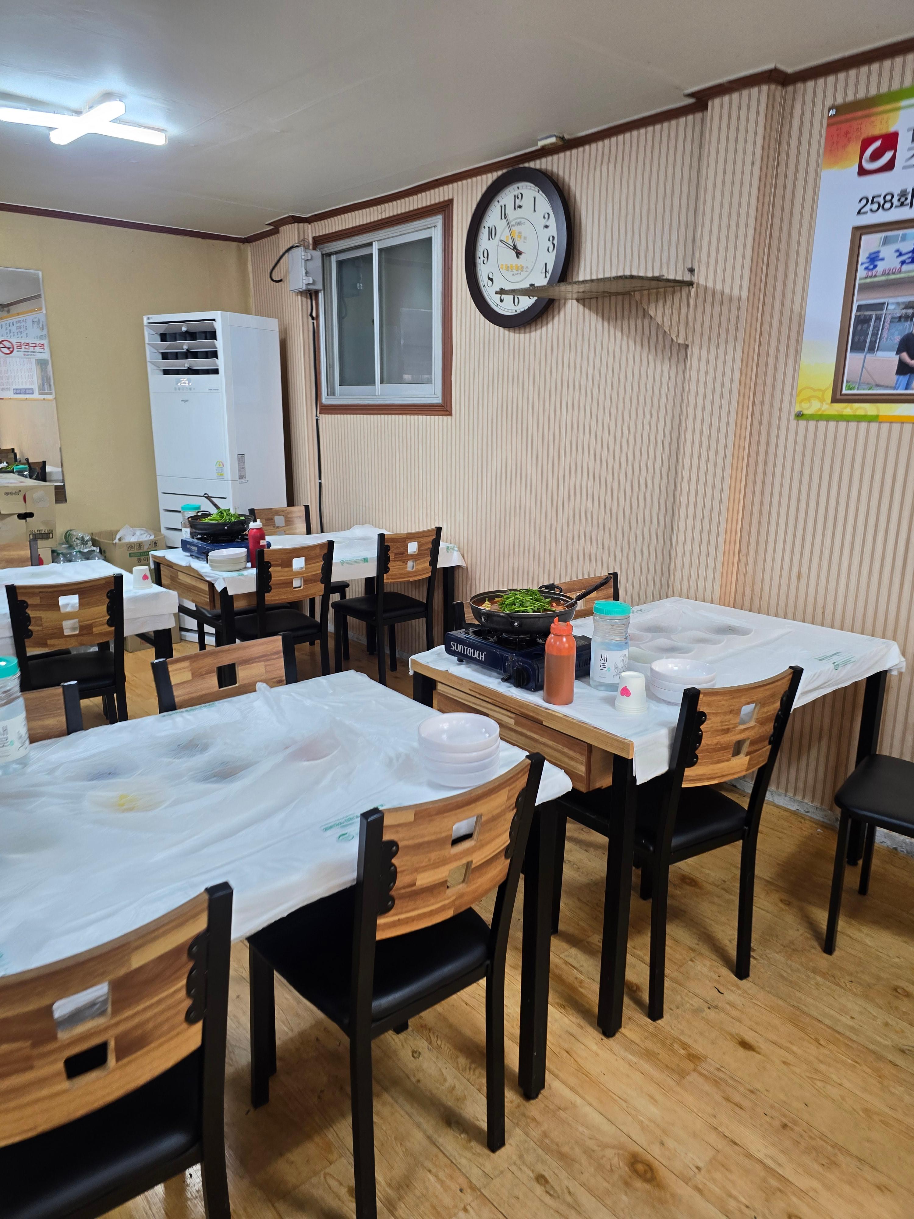 점심에 단체 예약을 받은 듯 한쪽 테이블에 세팅이 한창입니다 . 동남횟집의 인기메뉴 가자미매운탕으로 보입니다.