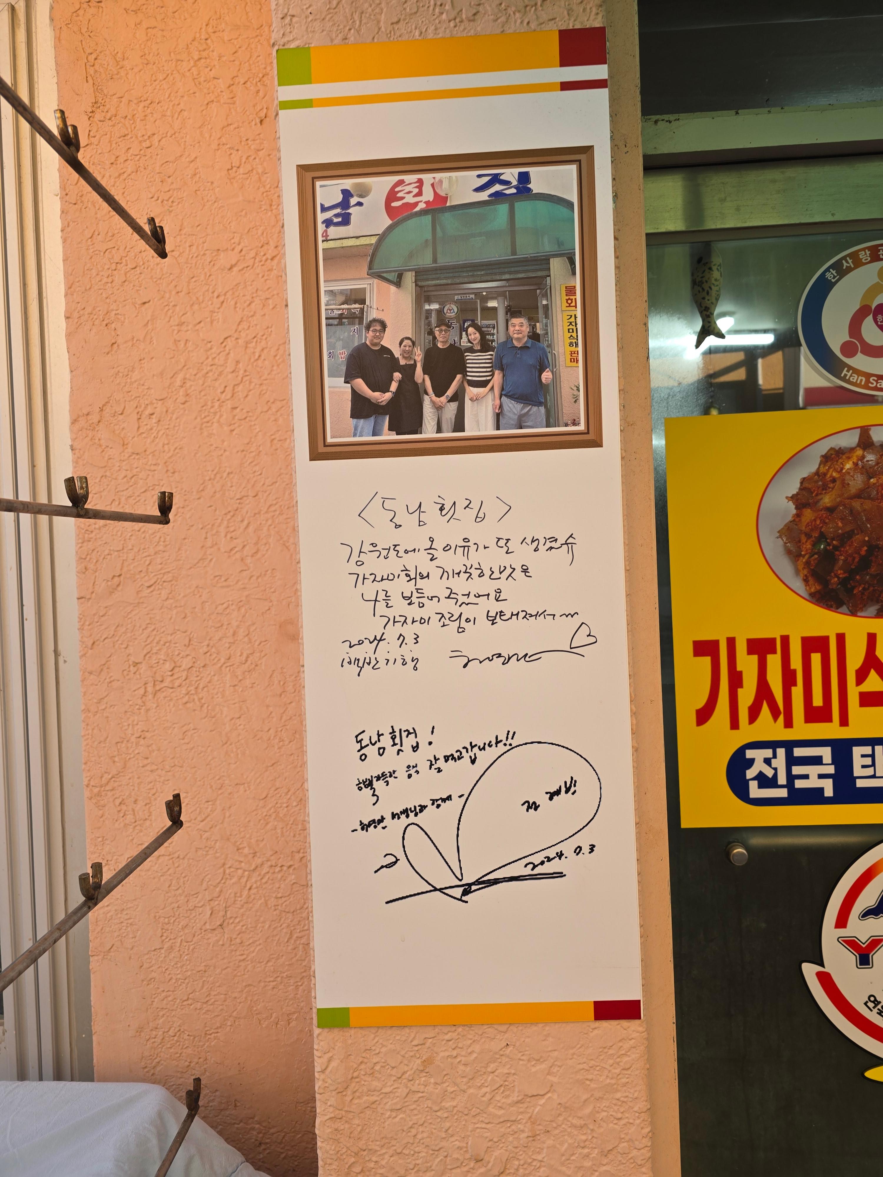 묵호항에서 주어진 자유시간에 아침겸 점심으로 무얼 먹을까 ... 겨울에는 곰치국이 떙기지만 혼밥하는 사람을 위해 일인분을 판매하는 곳이 흔하지 않아 고심하다가 복어지리탕과 가자미회를 먹을 수 잇는 동남횟집으로 정했습니다 . 묵호항에서 묵호시장쪽으로 가면서 도째비골 방향으로 활어시장 맞은편 골목길에 잇습니다 .