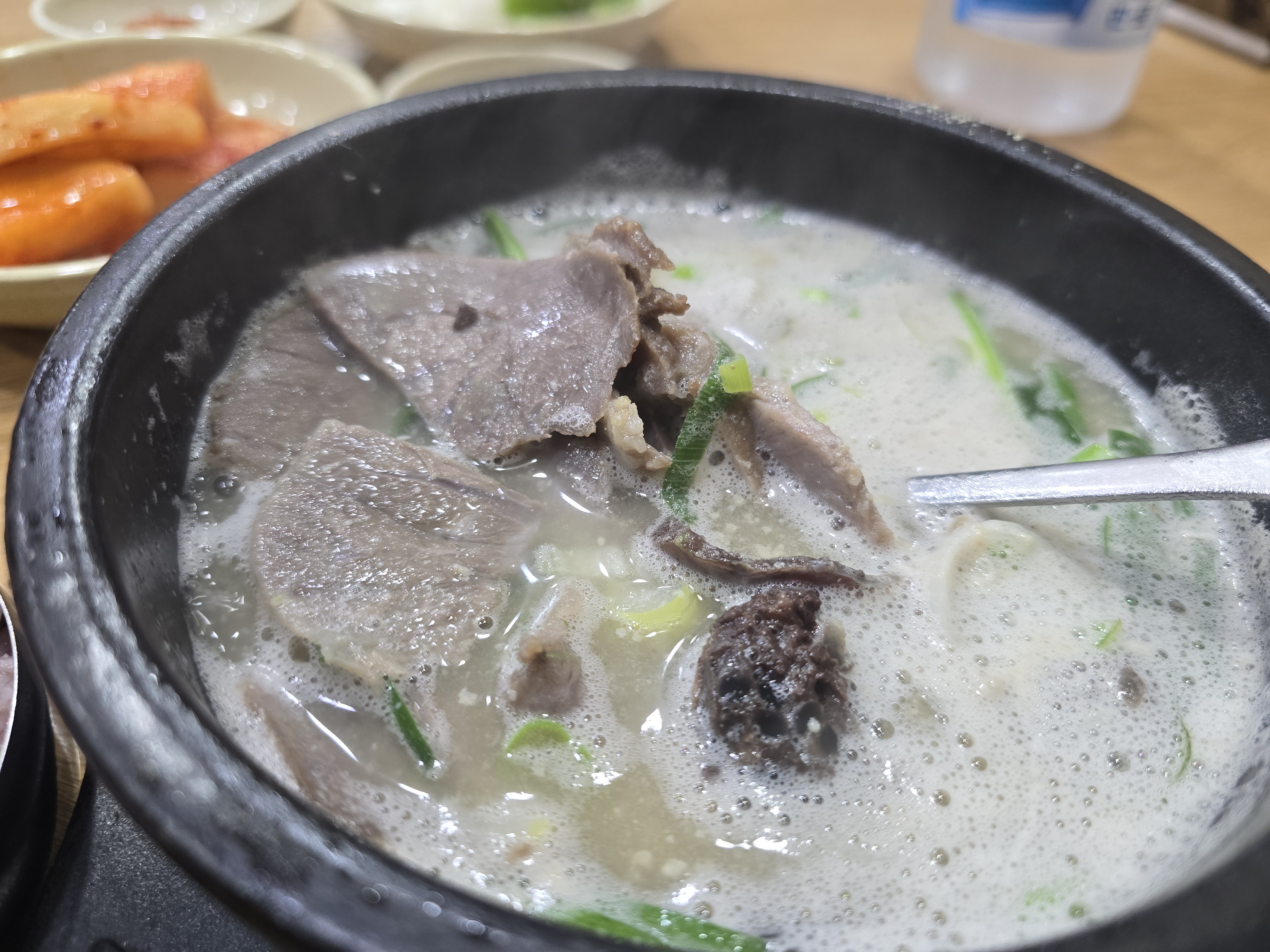순대국에 들어 있는 고기와 순대가 아주 얇습니다 , 순대 맛을 잘 느낄 수 없어 아쉬웠습니다