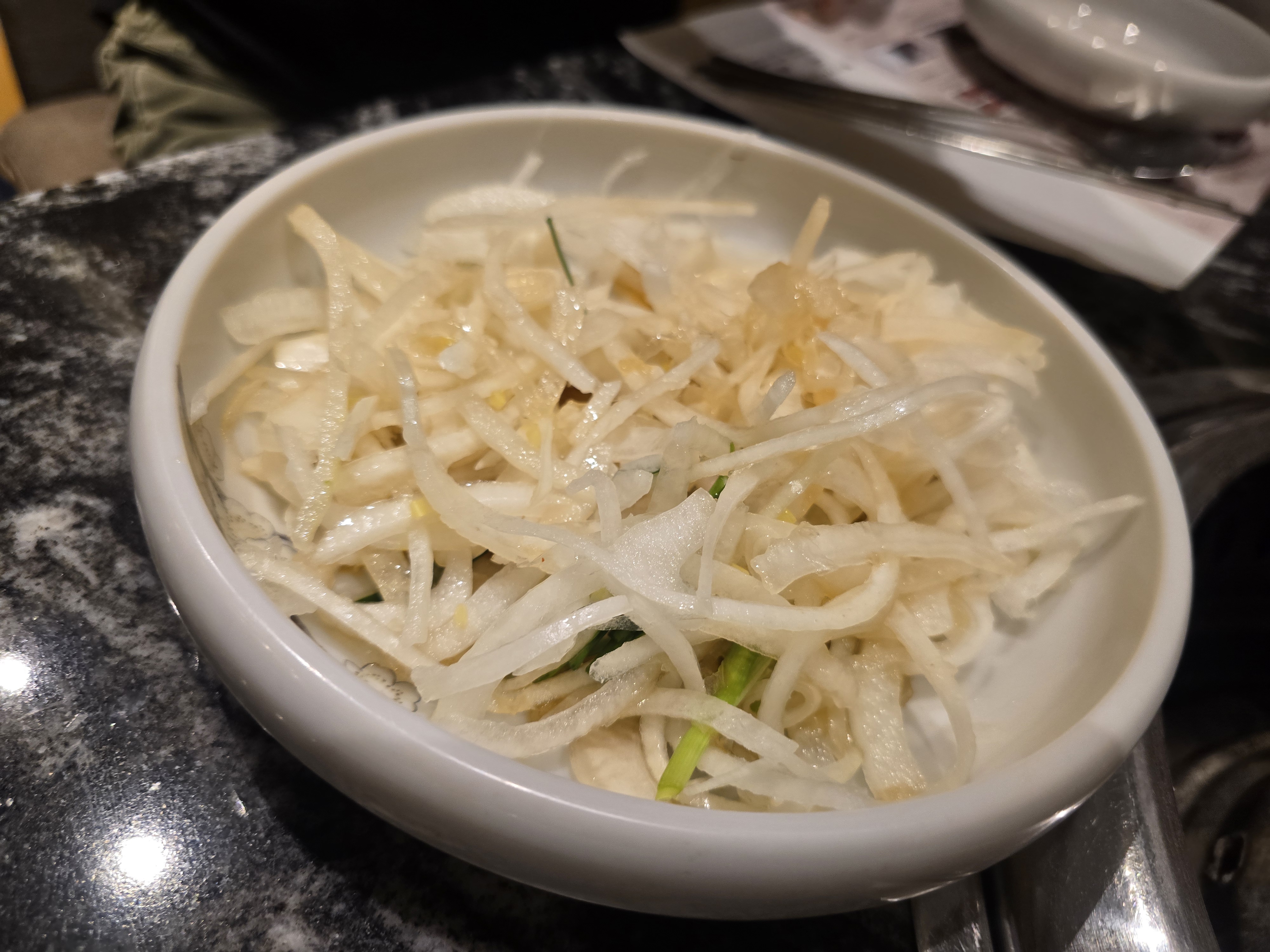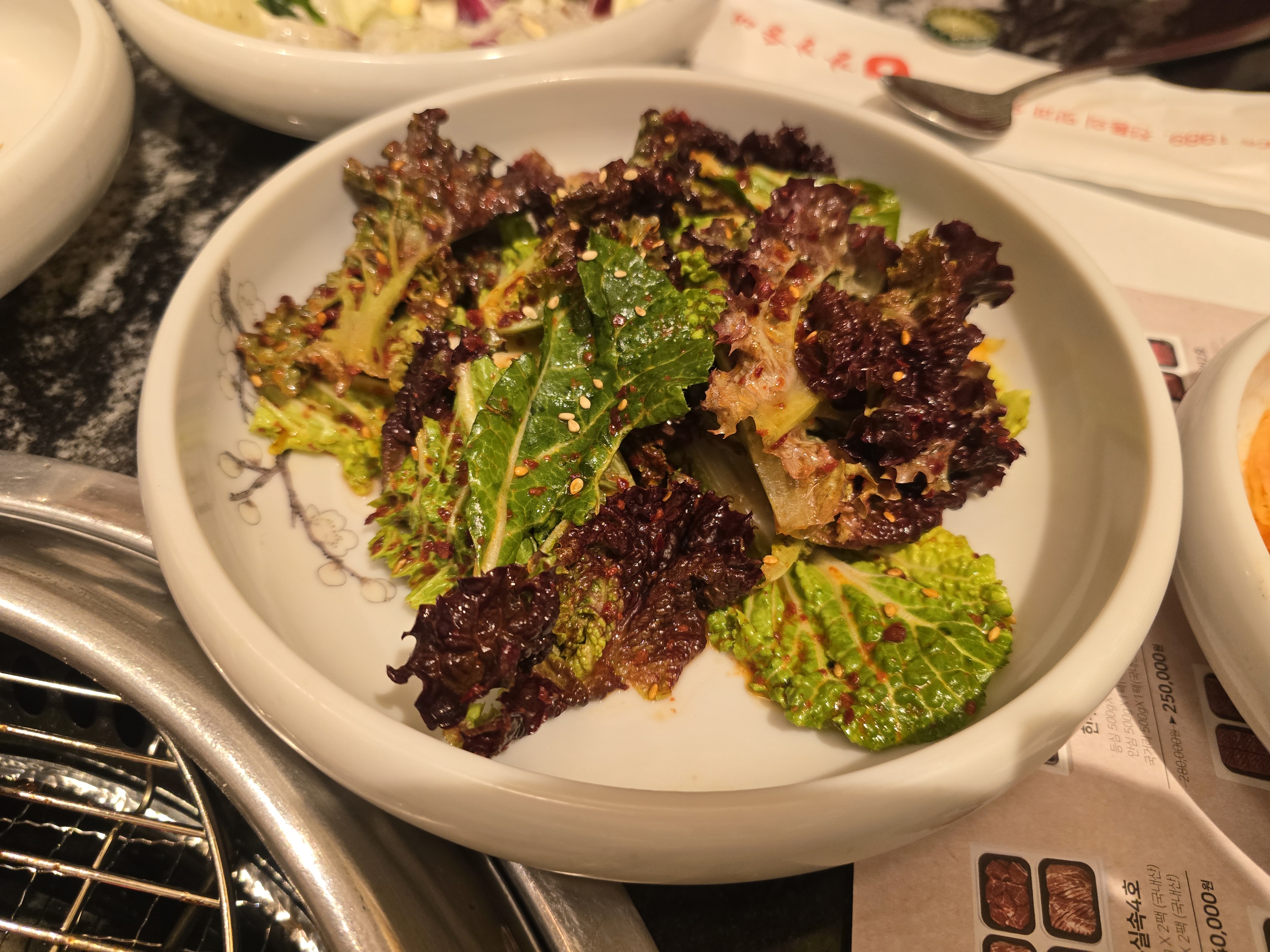 서비스로 내어준 상추 샐러드입니다 . 어린 상추잎만 사용하여 양념에 무쳐 냈습니다