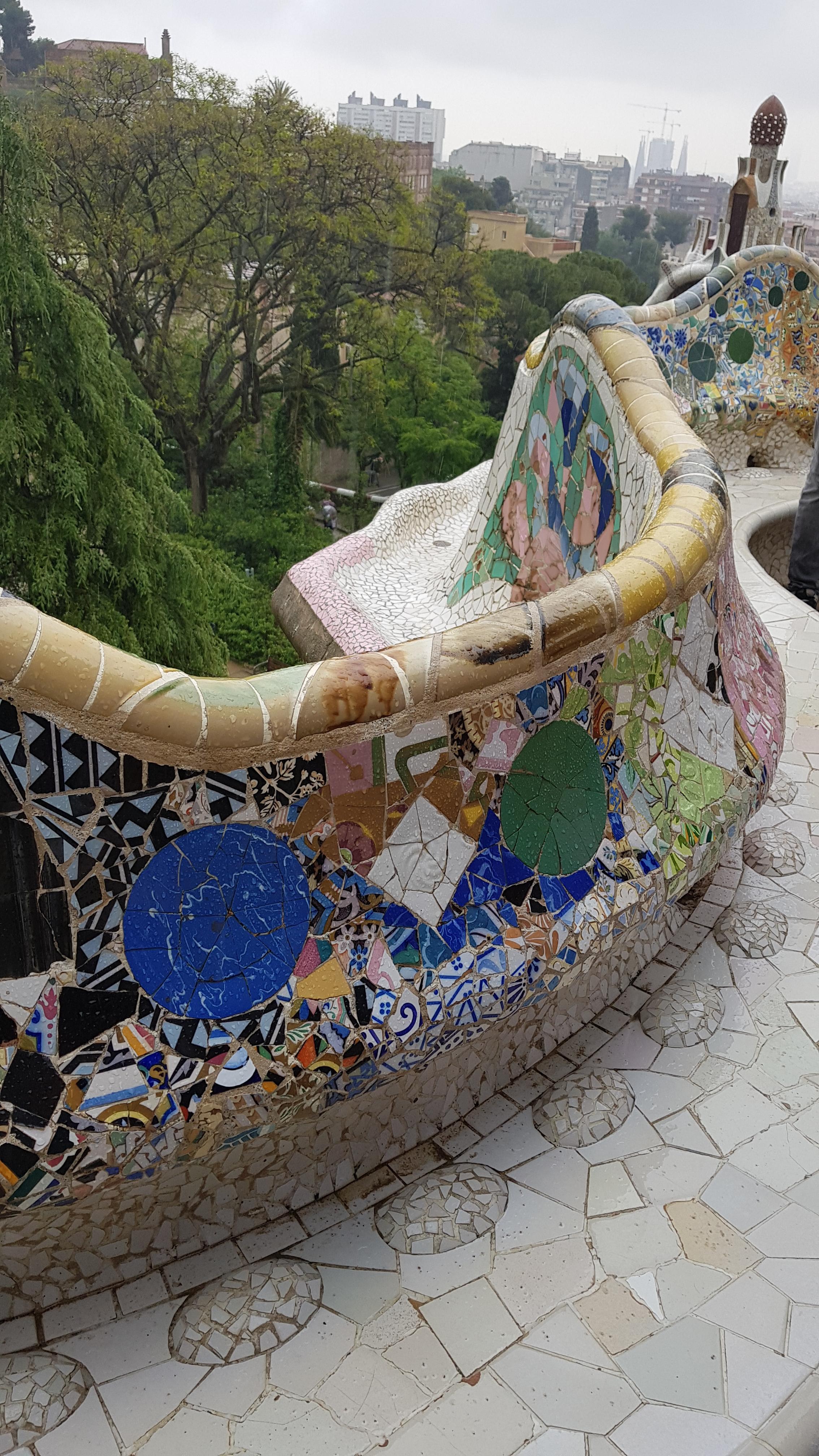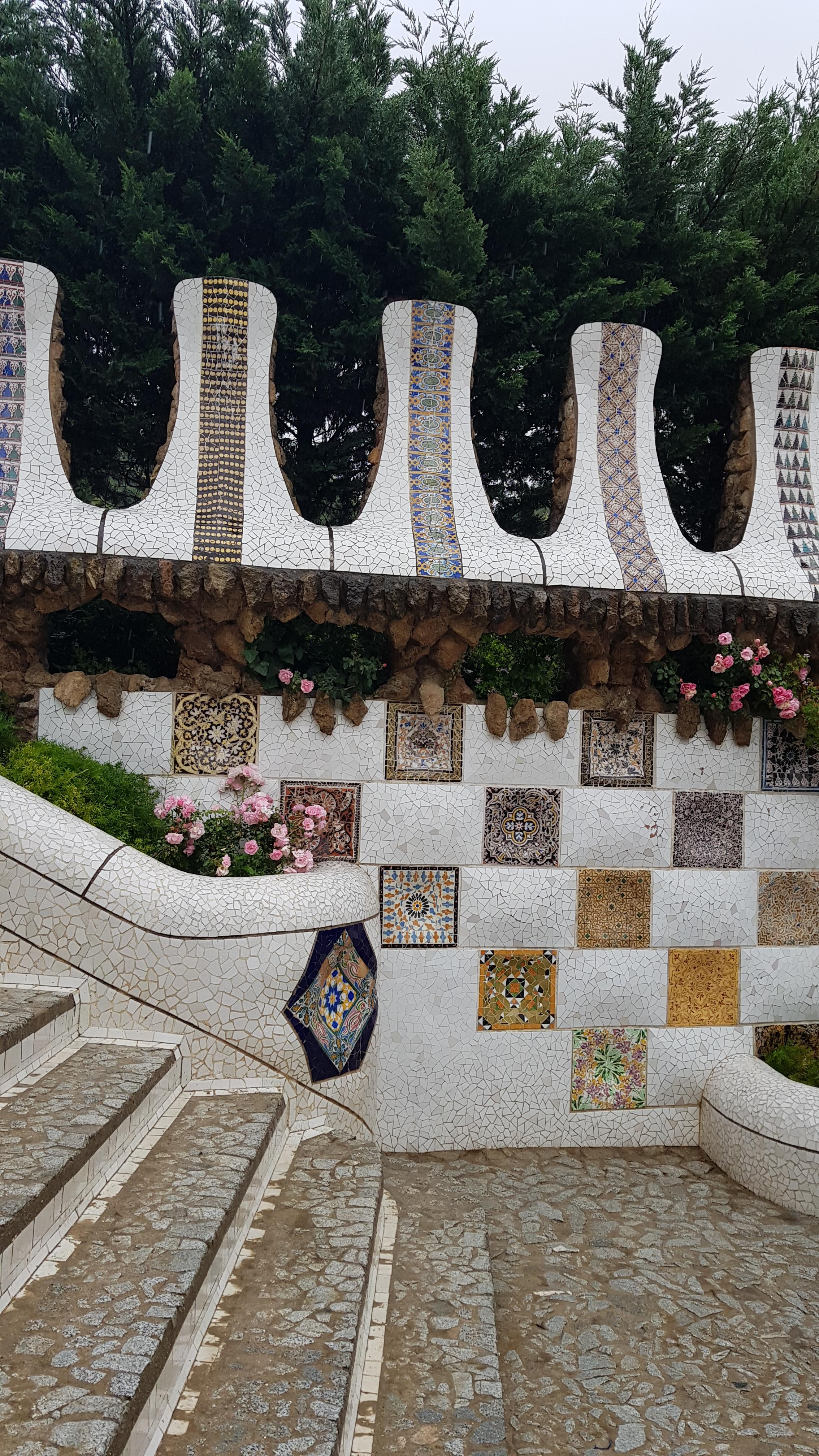 다양한 칼라의 타일로 하나하나 정성을 쏱아 하나의 예술작품과 같이 만든 긴 벤치에 감탄이 저절로 나왓습니다