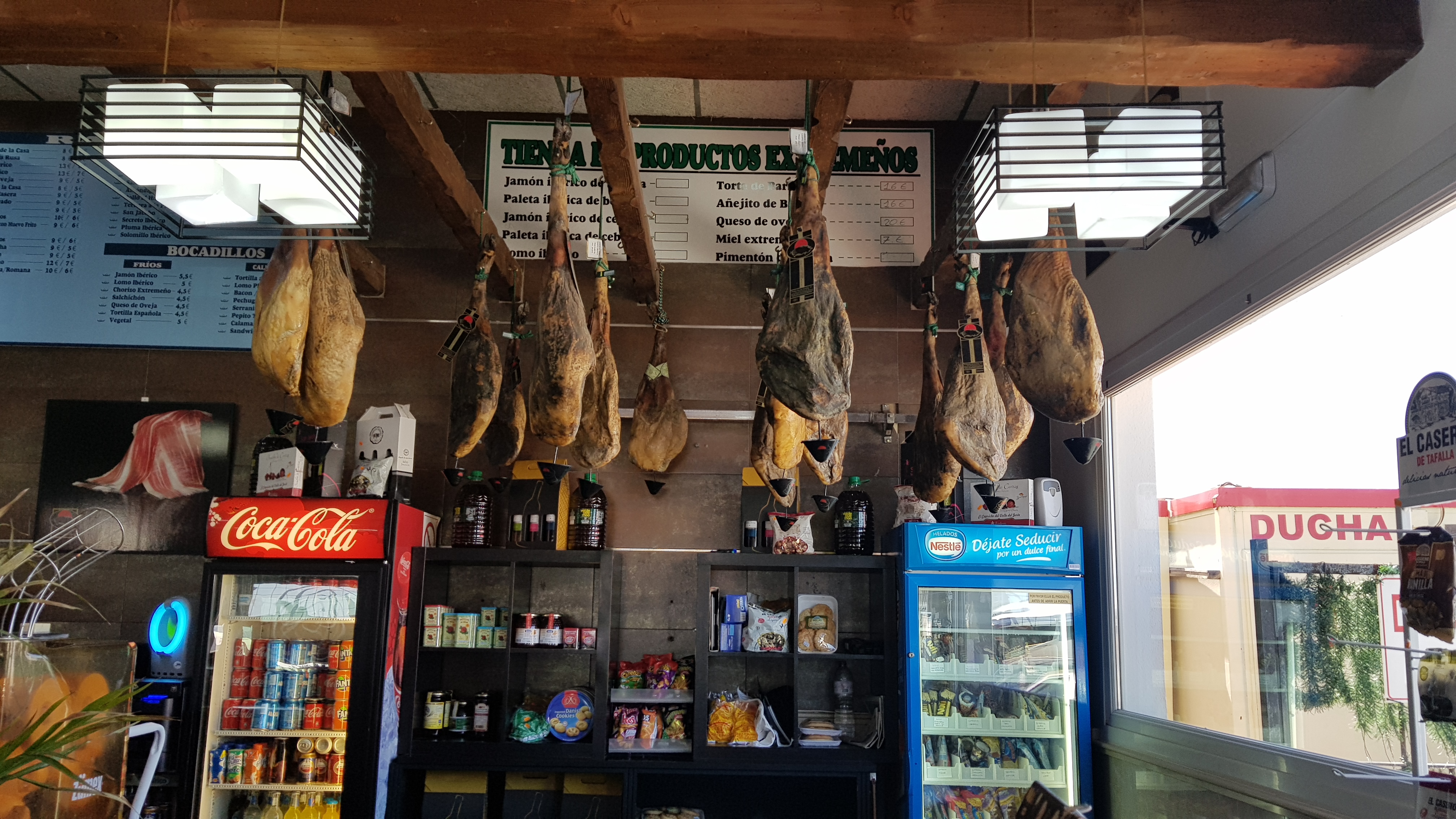매점에 주렁주렁 돼지고기 뒷다리 하몽이 달려 있습니다 . 역시 스페인 답습니다 .