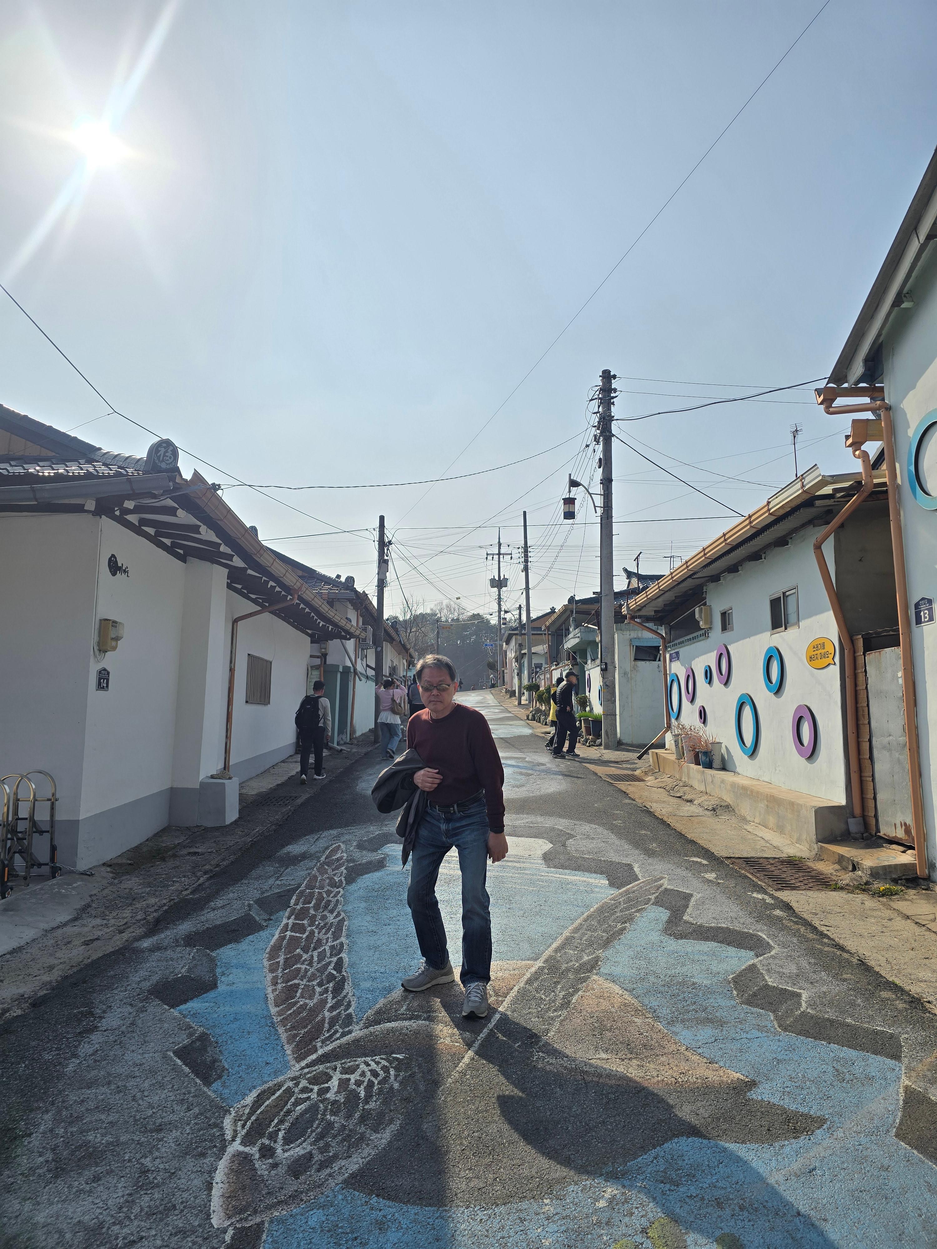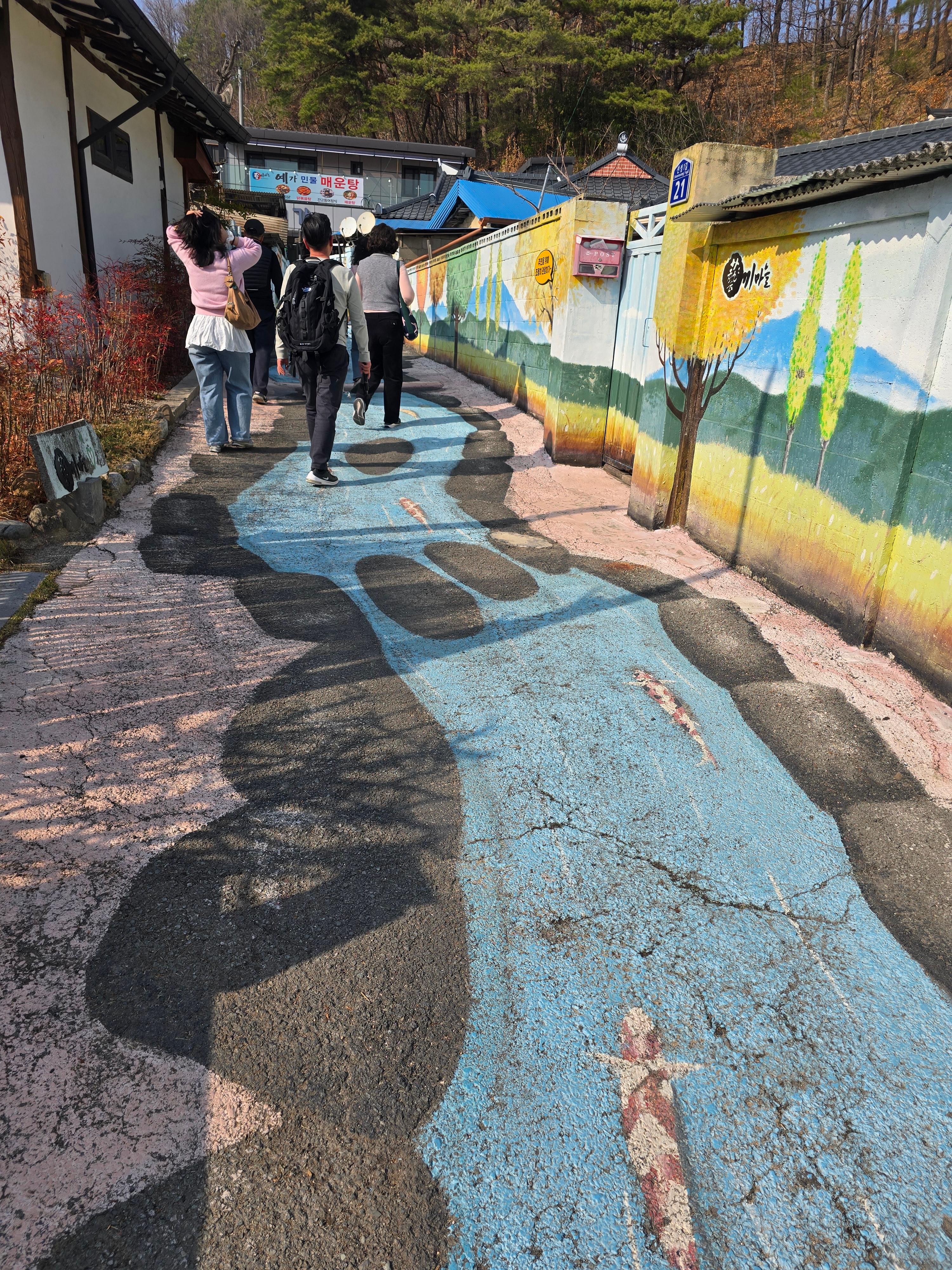다음은 시골마을 골목길에 그림을 그려서 사람들이 관광하게 만든 곳 예끼마을입니다 . 골목길마다 착시현상을 이용한 그림들이 그려져 있습니다 . 카페라떼