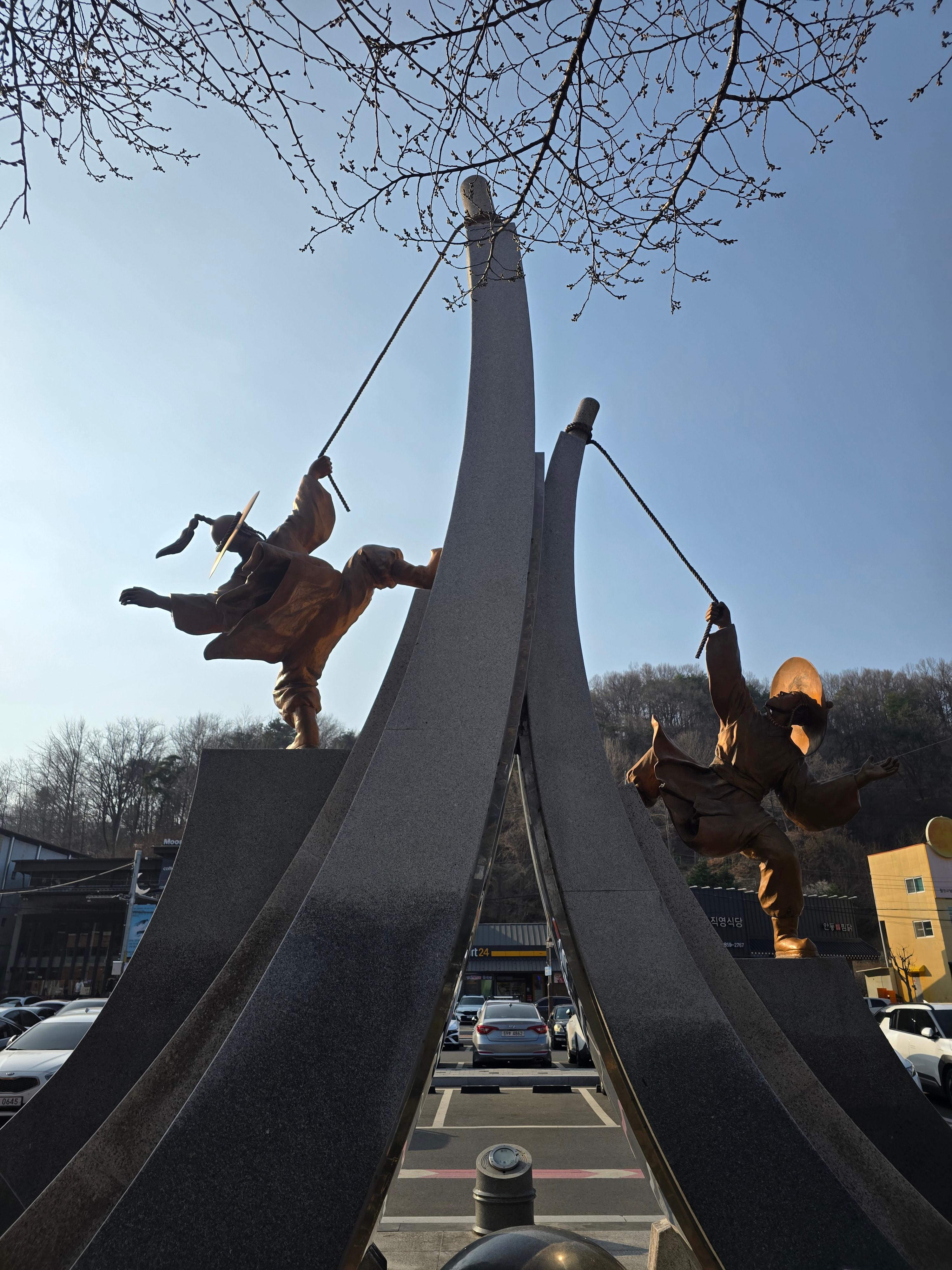 주차장에 안동 차전놀이 조형탑이 있습니다 .