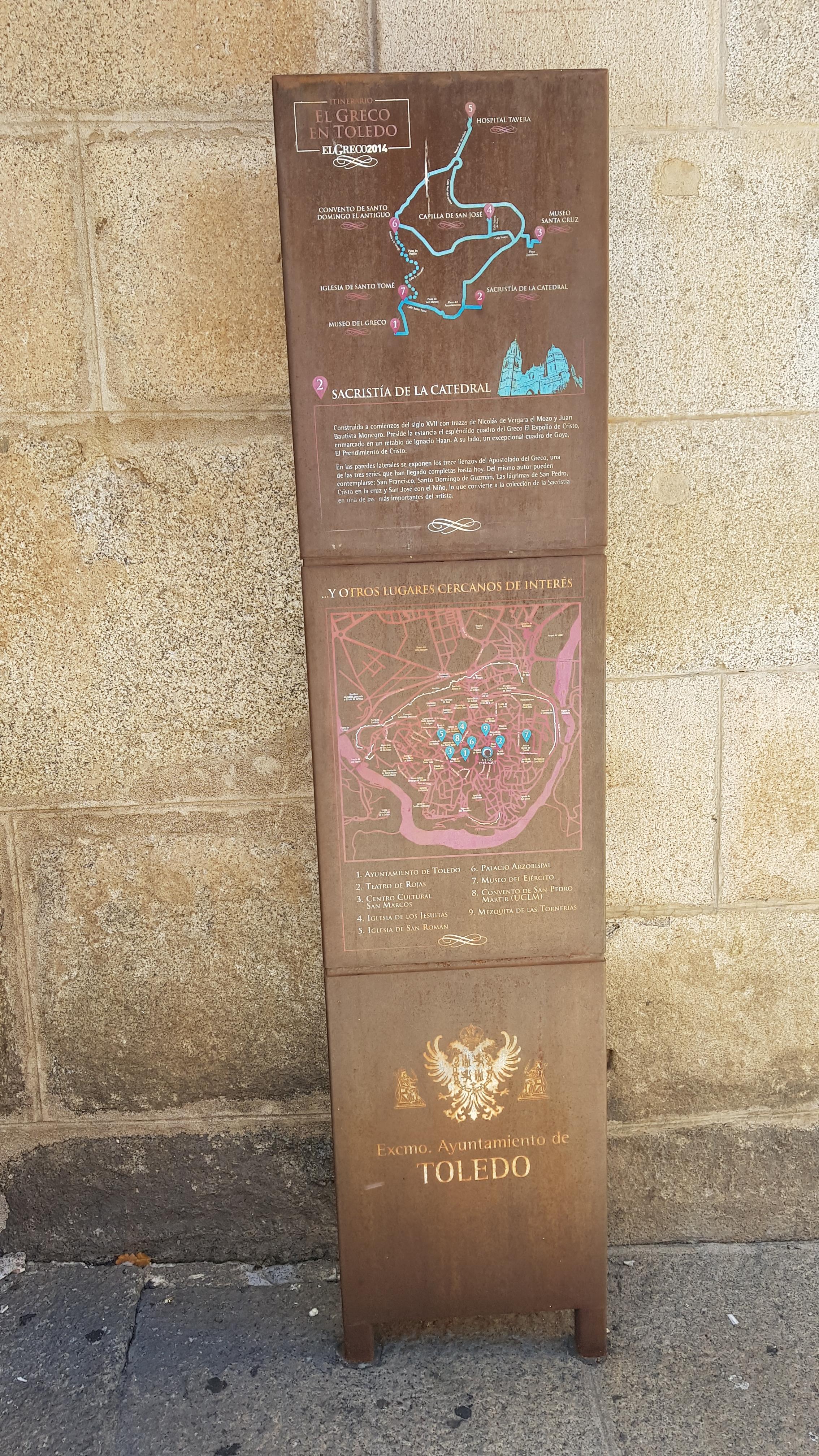 엘 그레코 관련 명소들을 안내하는 관광지도 표지판입니다. 톨레도 대성당, 산토 토메 교회등 엘 그레코의 작품이 있는 장소들을 표시하고 있습니다