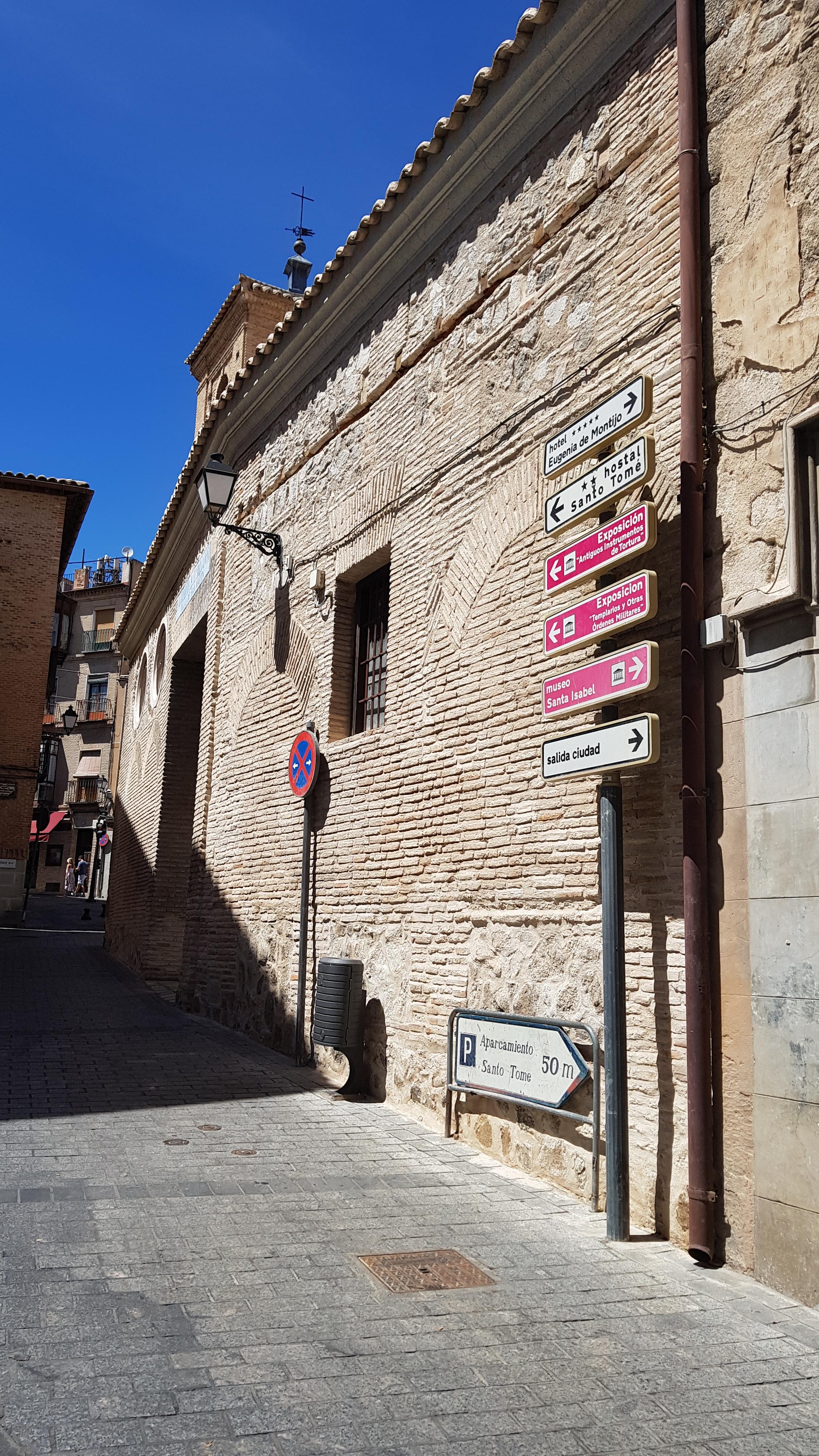 산토 토메 성당의 입구입니다. 이 성당은 화가 엘그레코의 가장 유명한 작품중 하나인 "오르가스 백작의 매장"이 소장되어 있는 곳으로 유명합니다 . 12세기에 설립되어 14세기에 재건된 이 성당은 원래 모스크였던 자리에 세워졌으며, 무데하르 양식의 종탑이 특징입니다 .