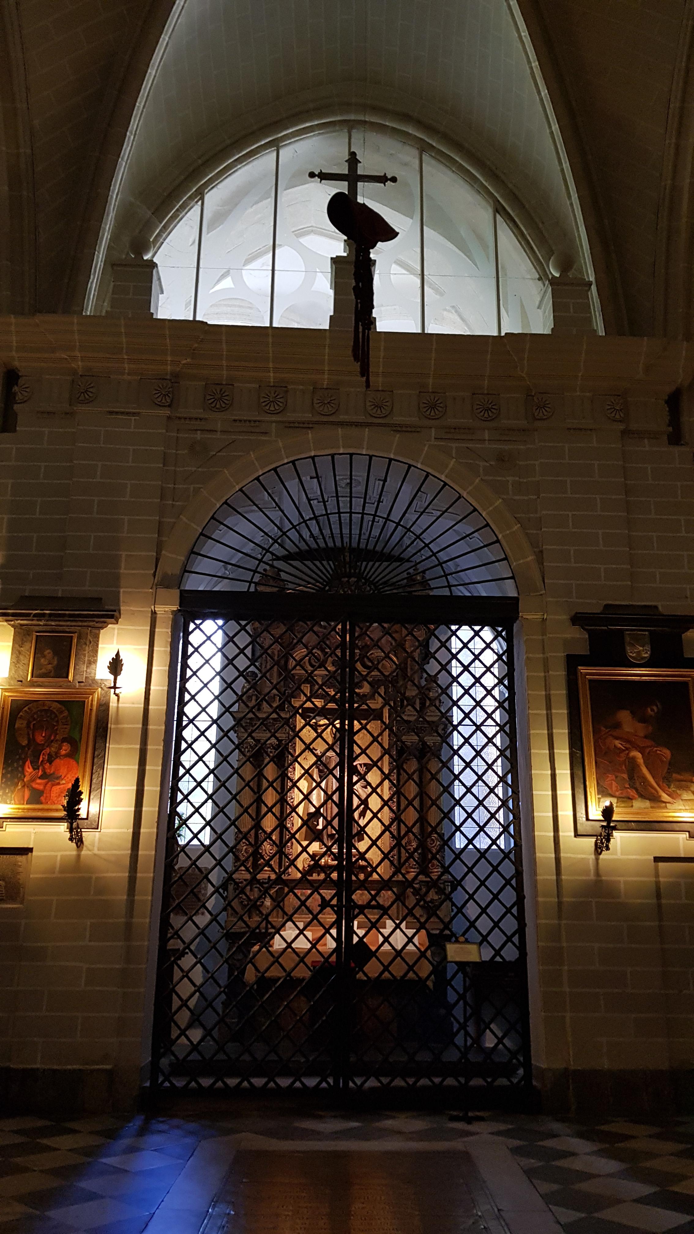 톨레도 대성당의 지하 예배당에 있는 성묘 예배당의 모습입니다. 예배당 중앙 제대에는 예수의 시신을 안치한 정면을 묘사한 조각상이 봉헌되어 있습니다 .