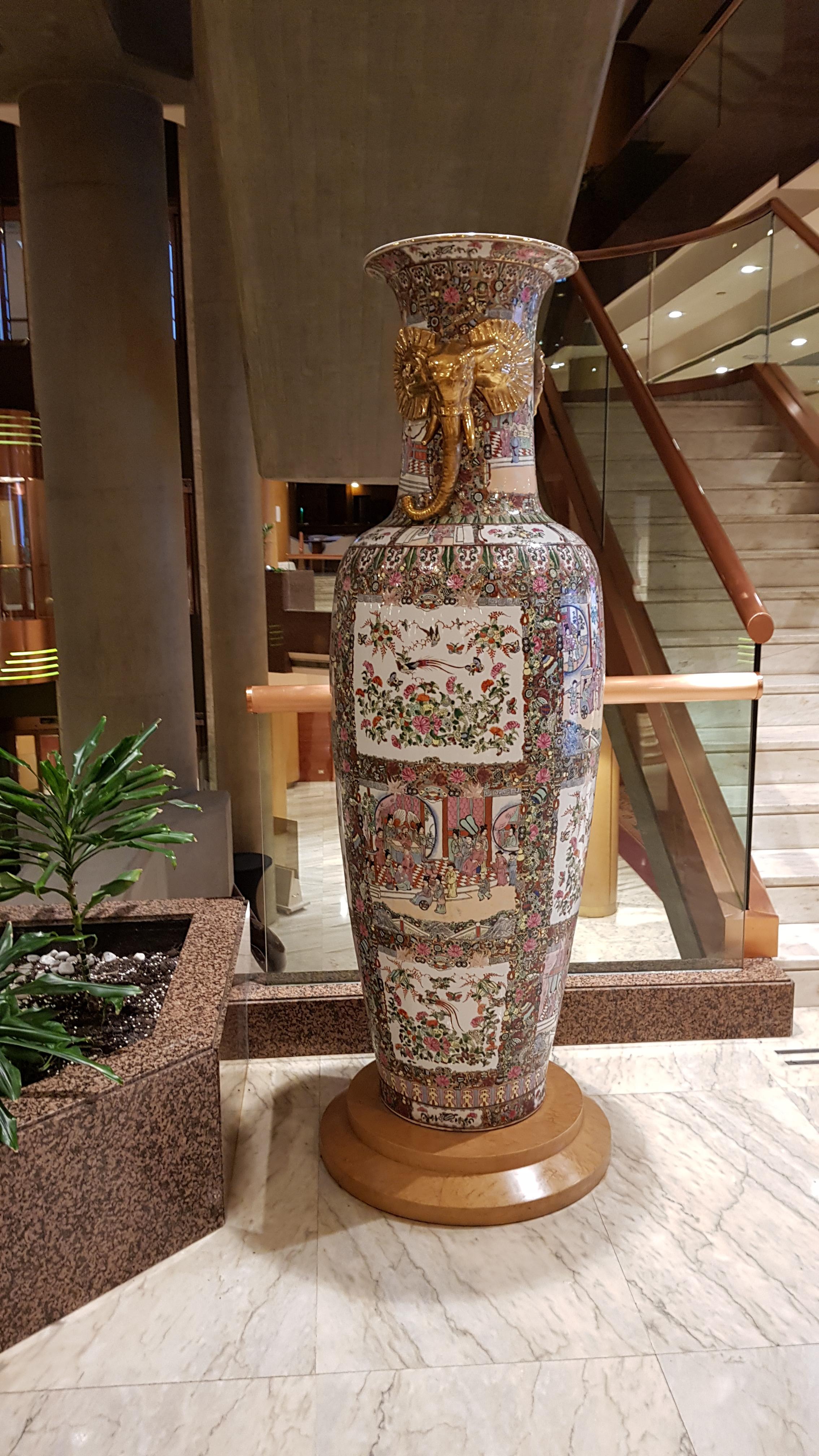 어제는 너무 늦어서 호텔을 둘러볼 겨를이 없었습니다 . 아침에 식사를 하기전 로비의 여기저기 둘러 봅니다 . 커다란 중국풍 도자기.. 칼라풀흔 색상에 윗쪽으로 금색 코끼리가 인상적입니다